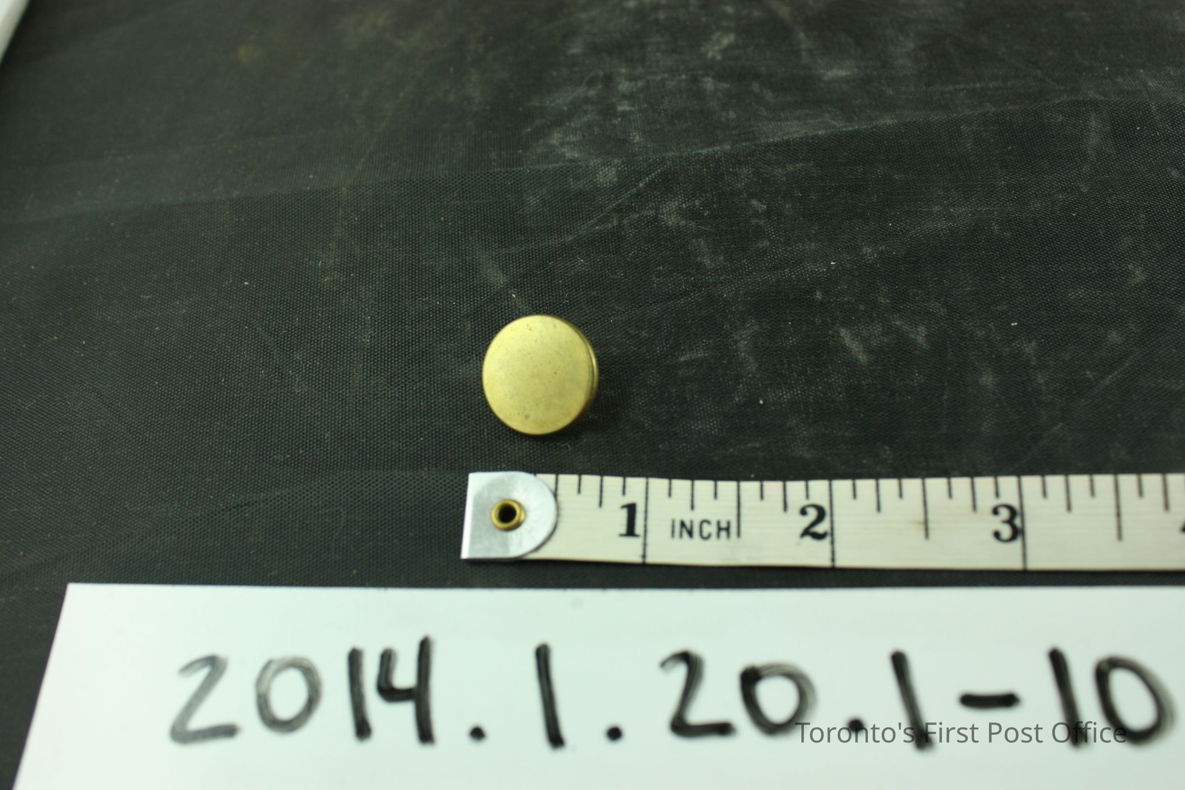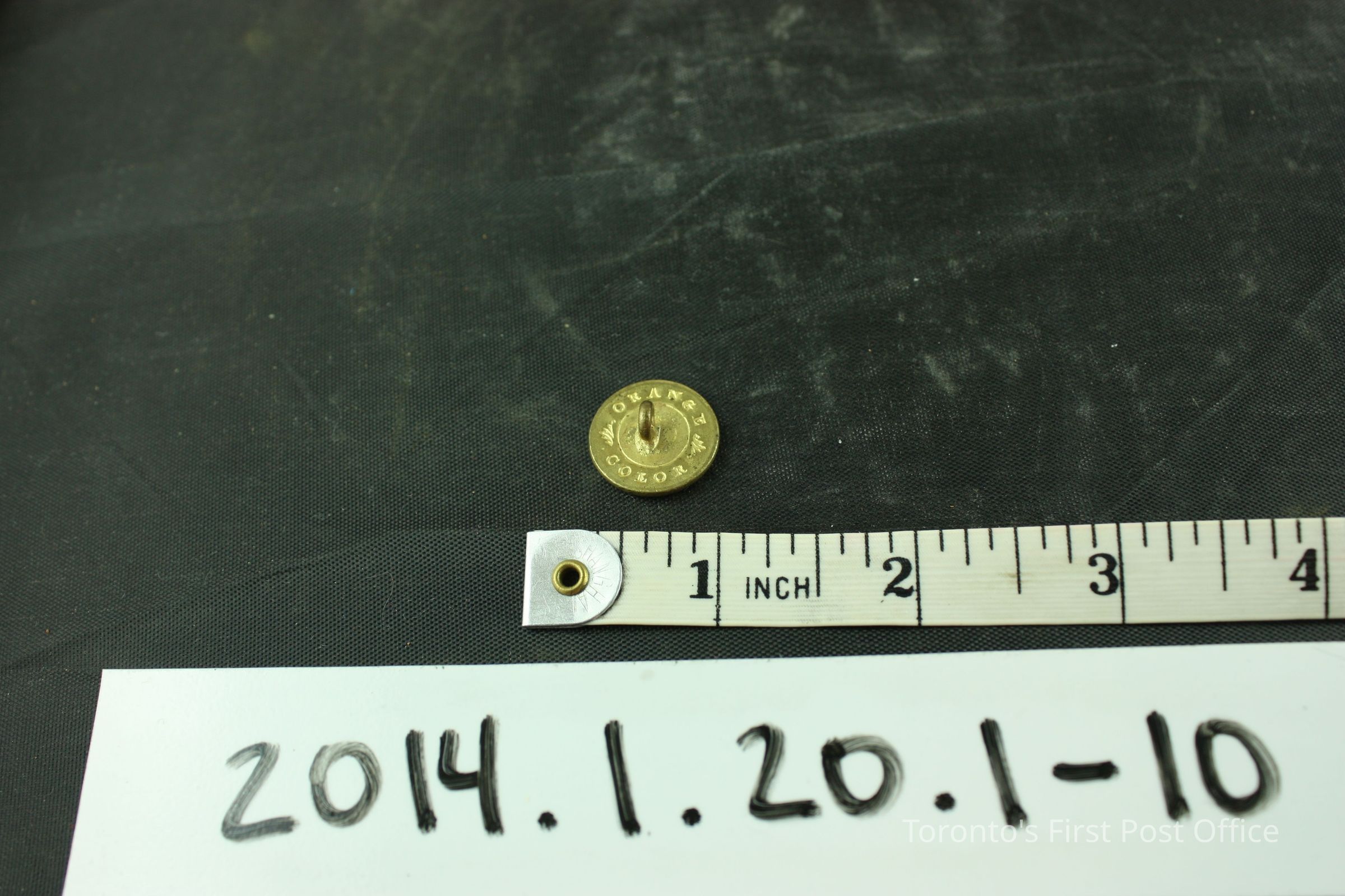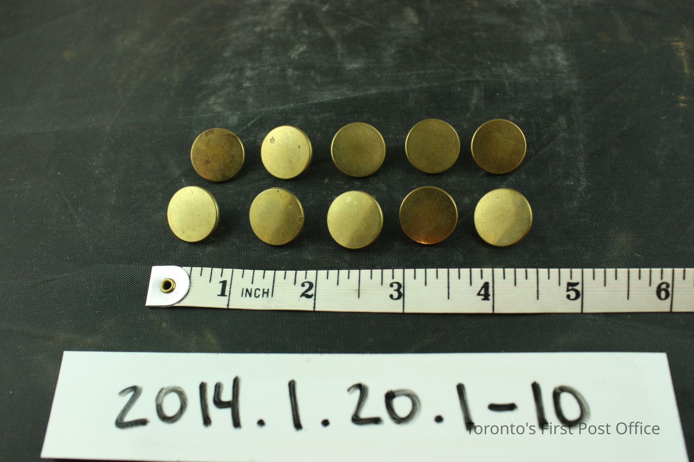 Ten (10) buttons, brass, flat, plain, loop shank; reverse stamped 'Orange Color' seperated by two half leaves