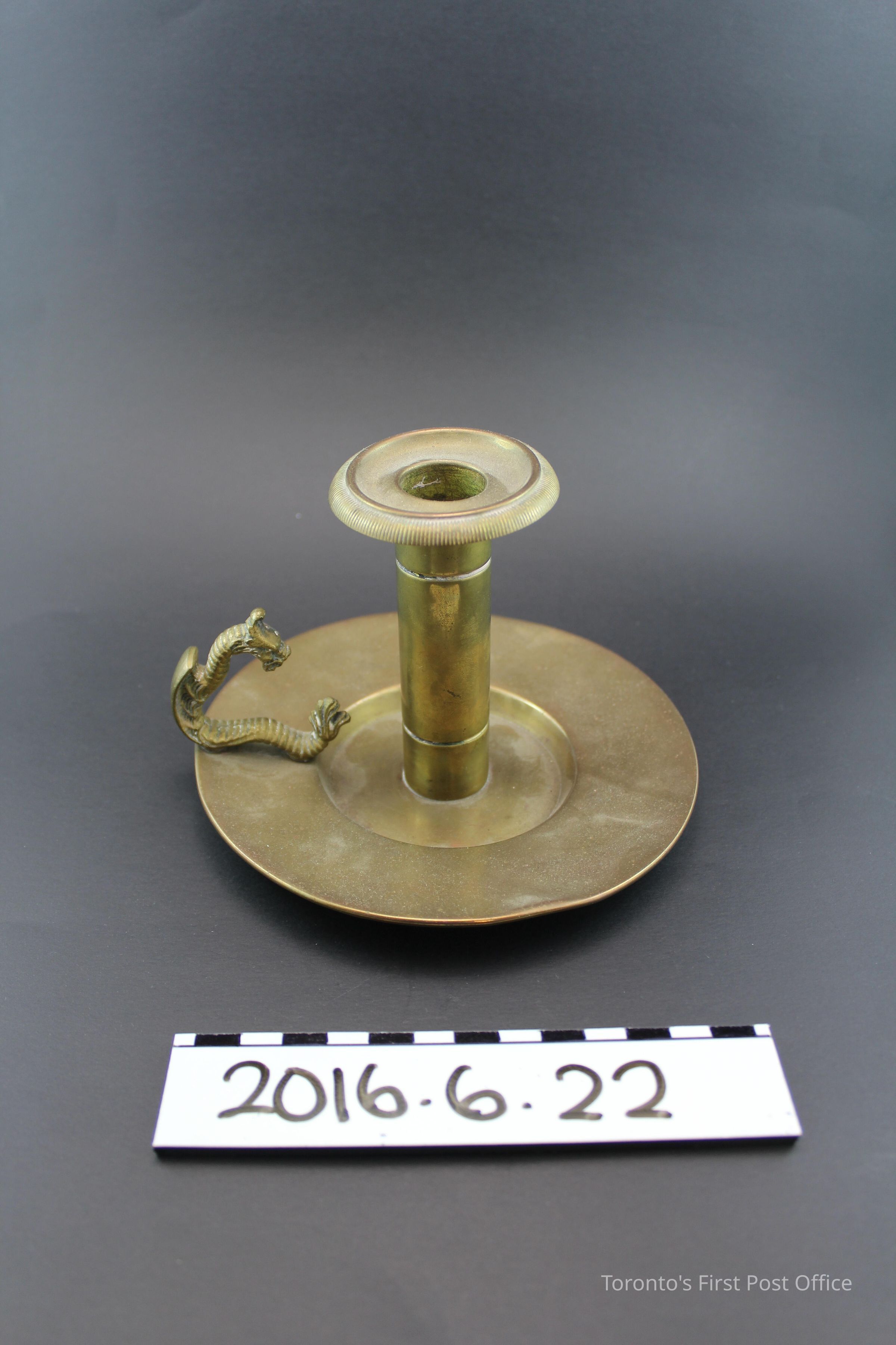 Brass candle holder with integral dish and decoative handle in the shape of a dragon. Post and handle are attached to the dish with screws on the bottom.Update Date