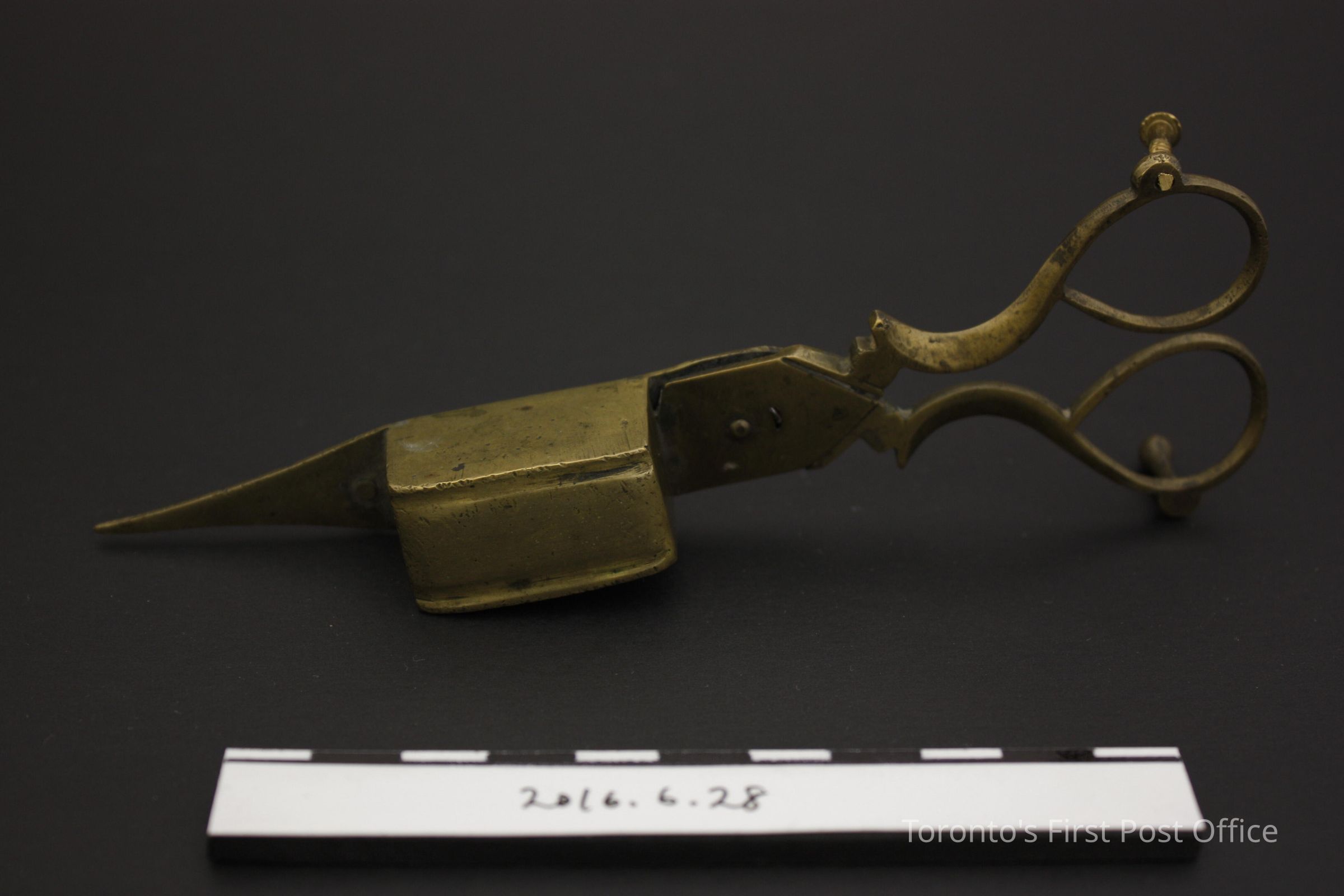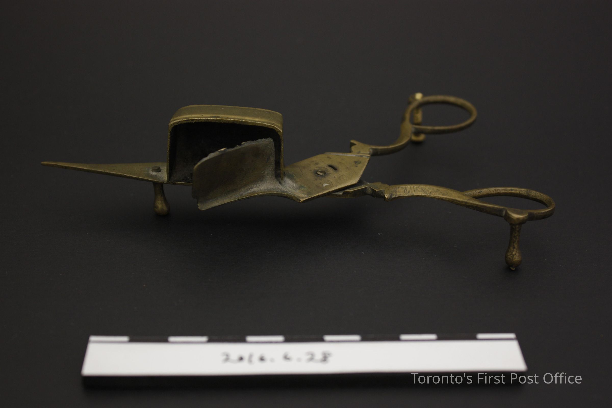Brass candle snuffer with brass side plate box. Scissors-like in form, the base and sides of the snuff box are attached to the inner blade, while a flat cover for the side of the box is attached to the outer blade. Still in working order, the riveted blades swing to full extension, though loosely connected to the pivot area. Two (2) brass legs support the proper left finger ring and the tip of the inner blade, yet lacks one brass foot on the proper right ring, is currently supported by a brass-like screw. The handle shanks feature symmetrical patterned grooves.Dimensions