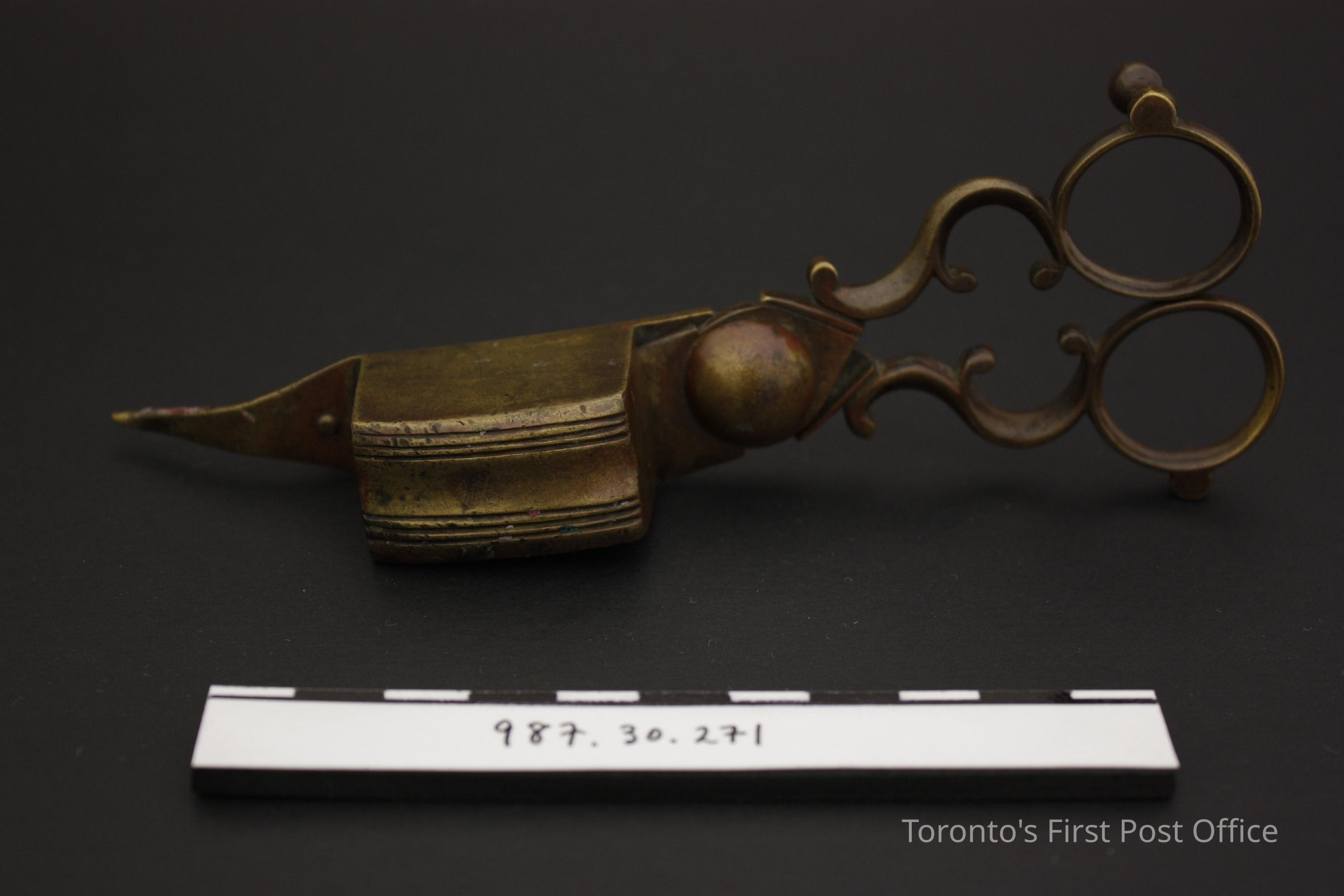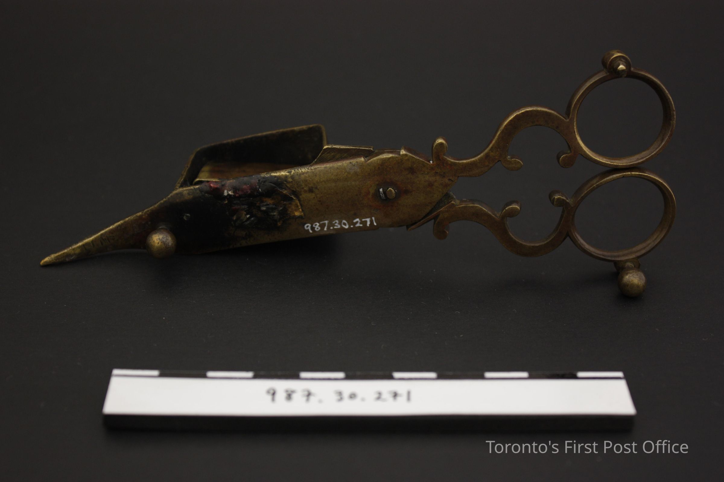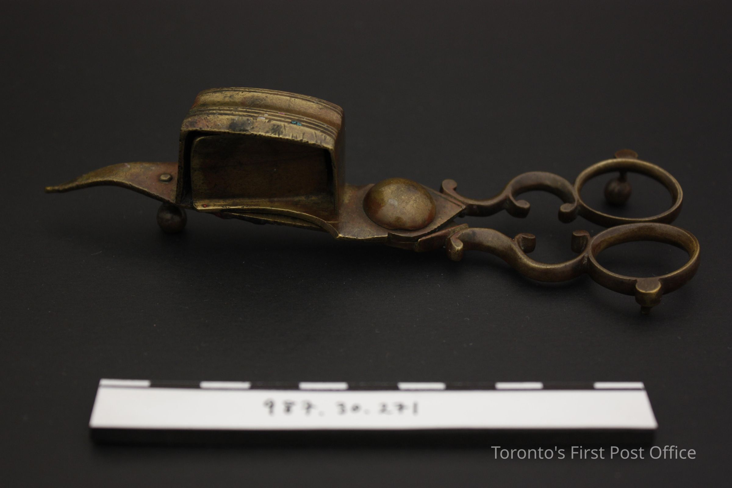 Brass candle snuffer/wick trimmer with three foot rest; elaborate curves on handle; enclosed receptacle for burning wick; cutting tip is bent downwards and one foot is missing.Update Date