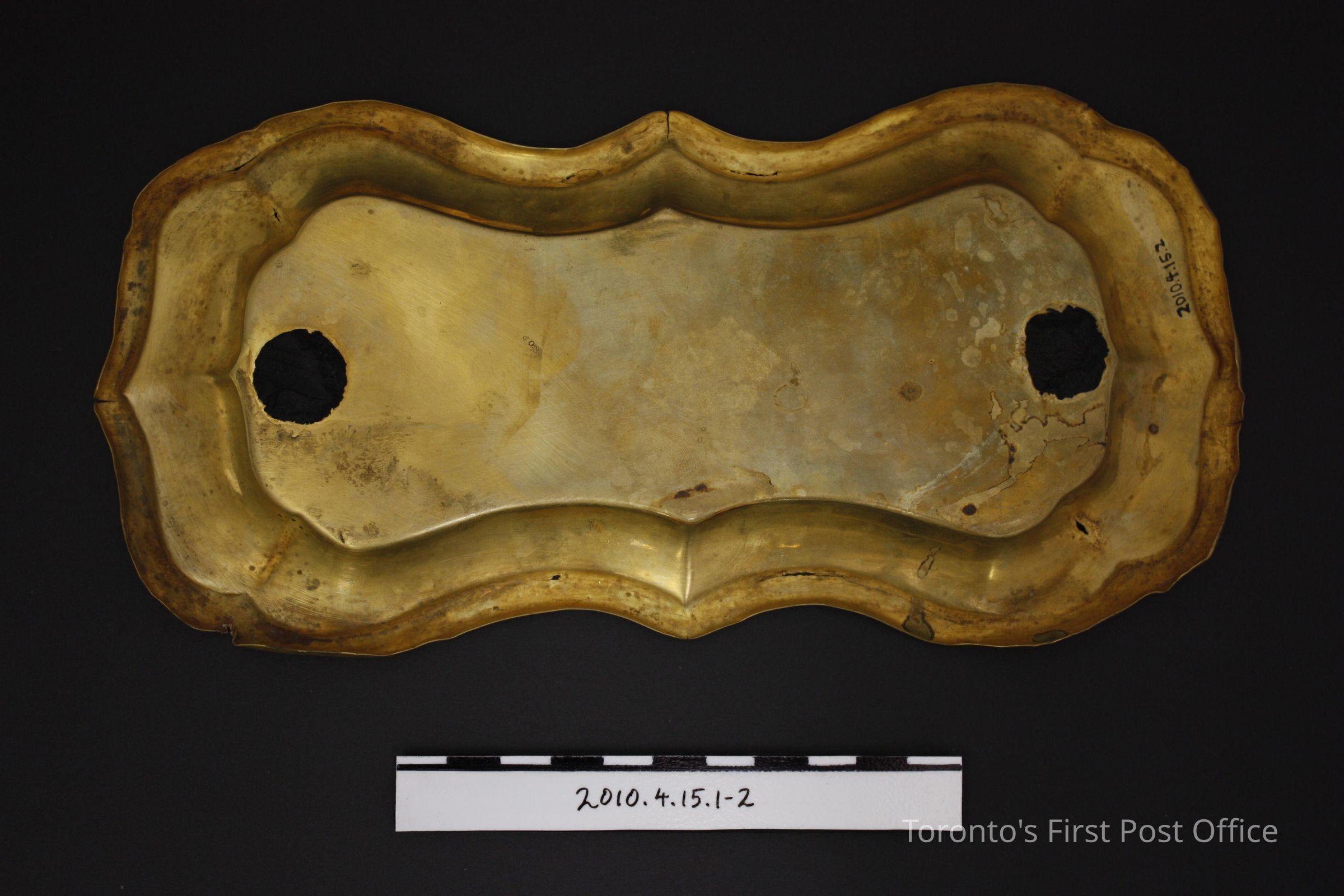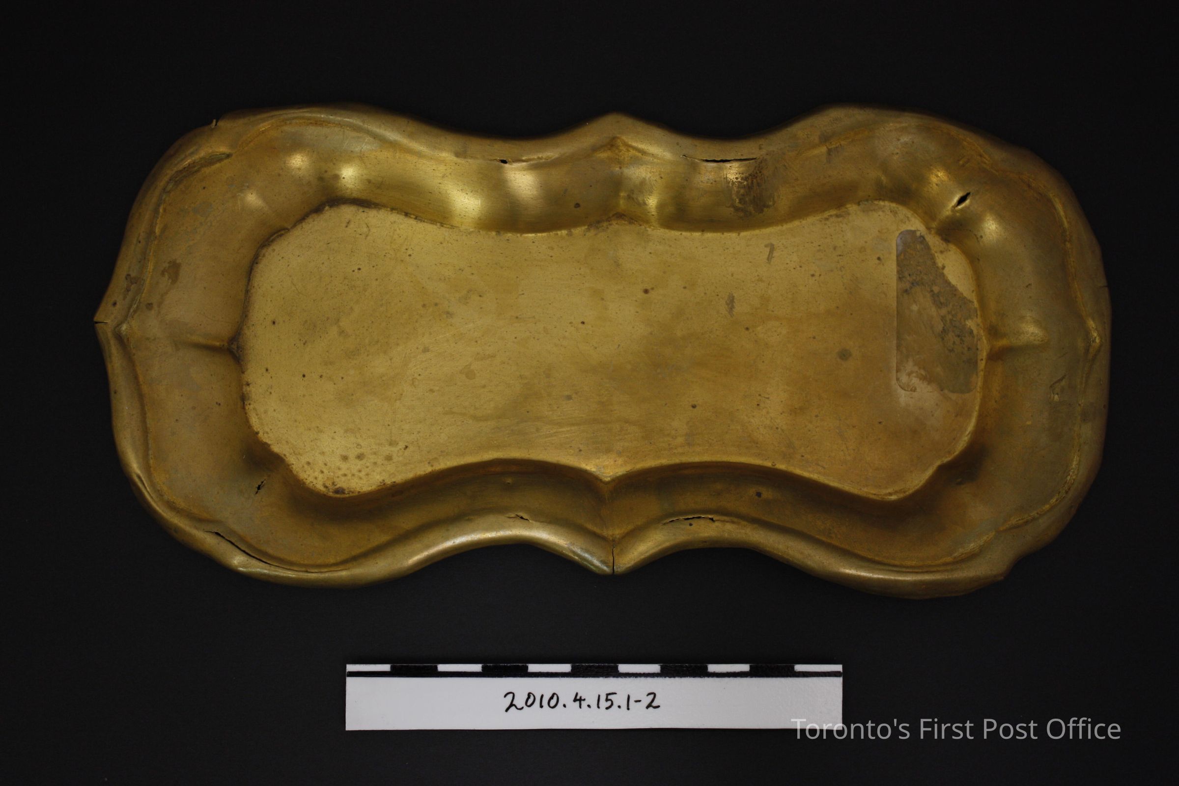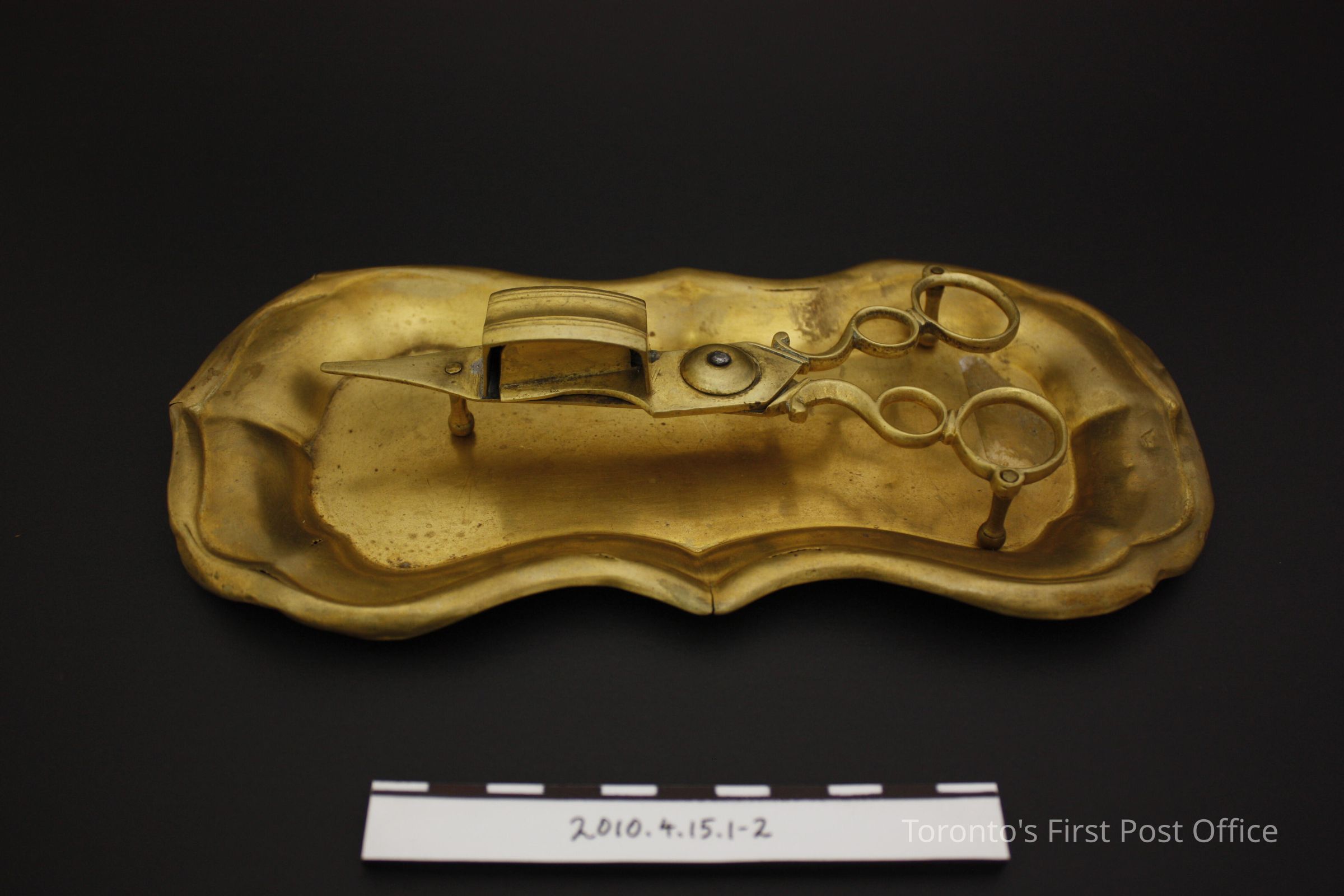 One brass candle snuffer with three legs and semi-circular box. One brass tray with rubber stands.