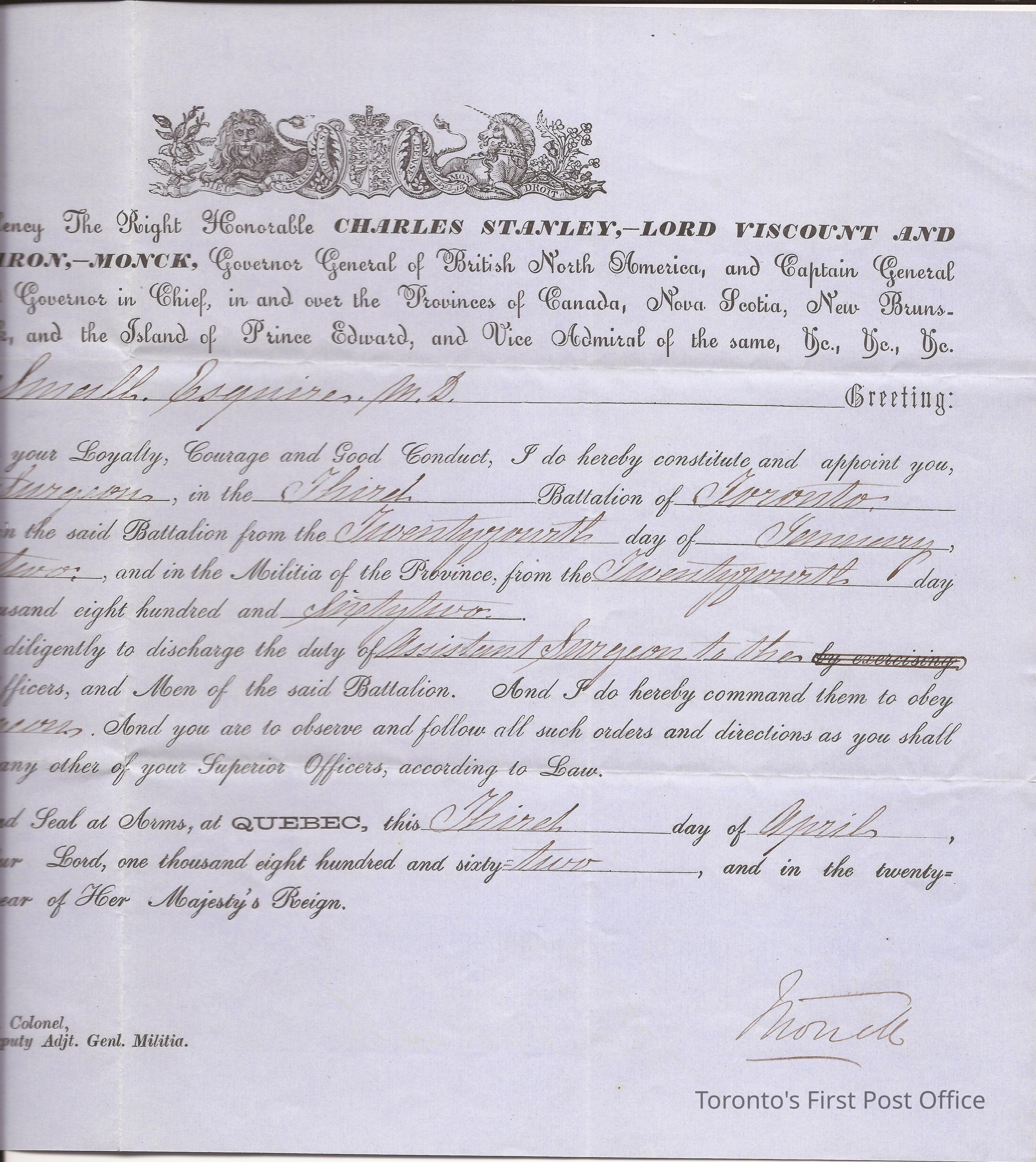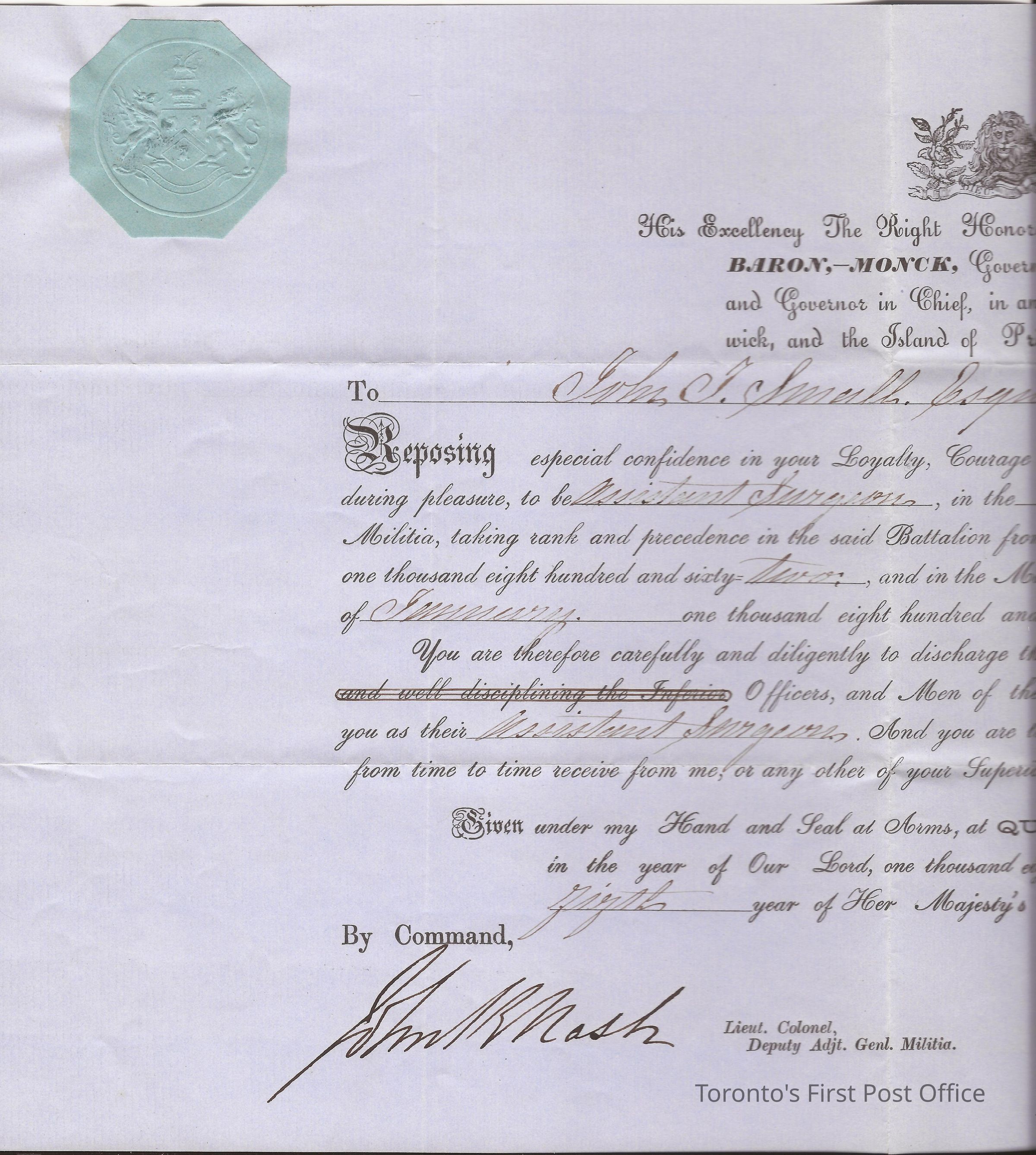 Certificate presented by Lord Viscount and Maron Monch G.G of BNA to John J. Small Esq. to name him Assistant Surgeon to 3rd Battalion of Toronto from 17th Jan 1862; dated 3 April 1862; signed "John… Lieut. Colonel Deputy Adjt. Genl Militia"; on medium blue laid paper; watermark: "A PIRIE & SONS 1861".Dimensions