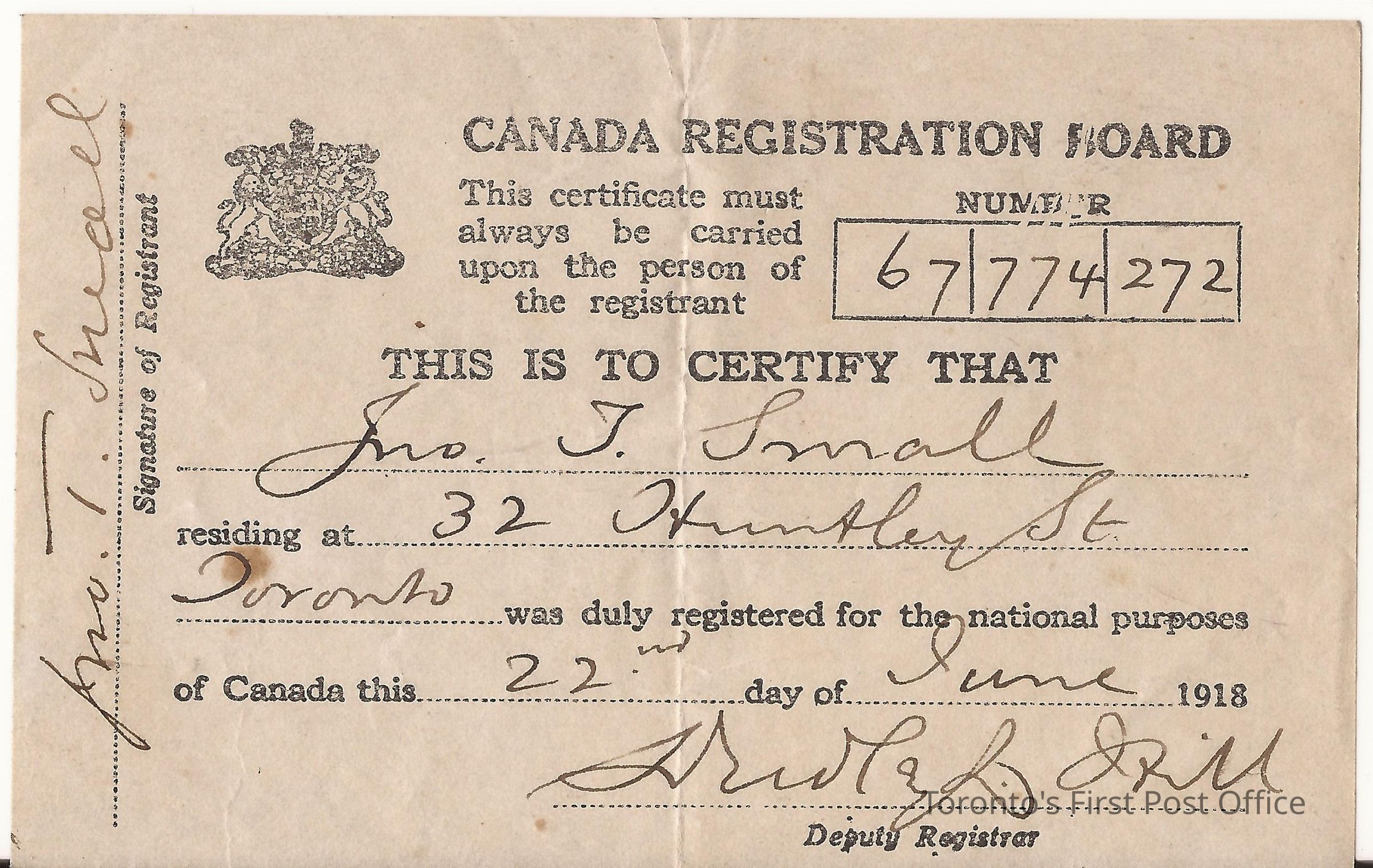 Canada Registration Board Certificate dated 1918; registration # 67 774 272.