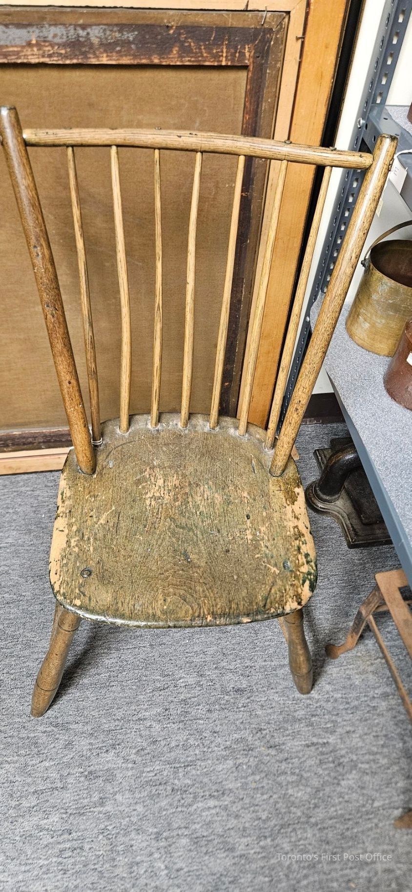 Windsor chair; wooden; nine turned back spokes; rectangular seat, rounded at corners; circa post 1830.