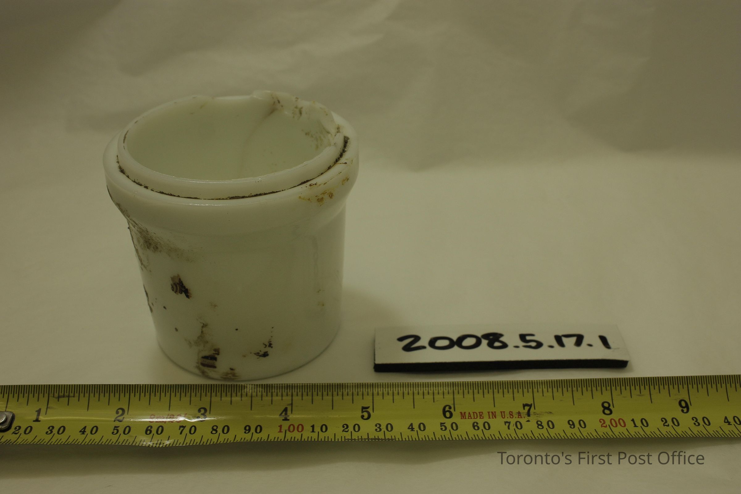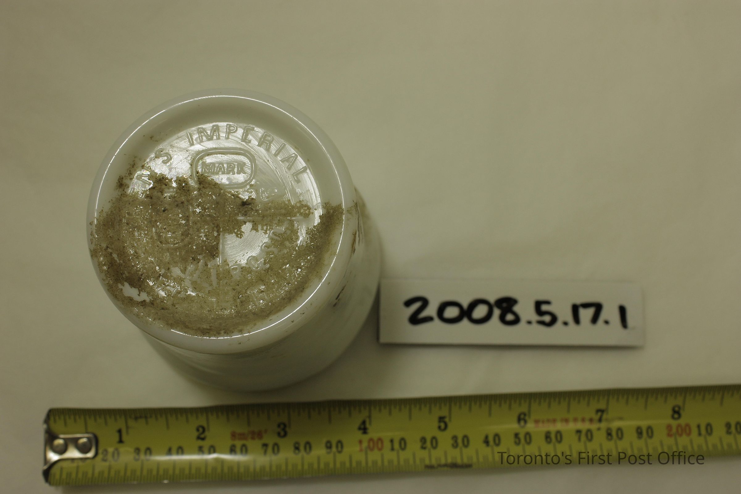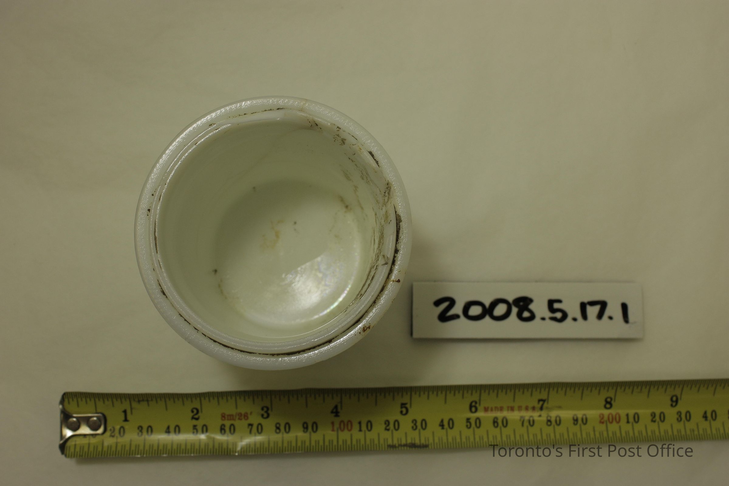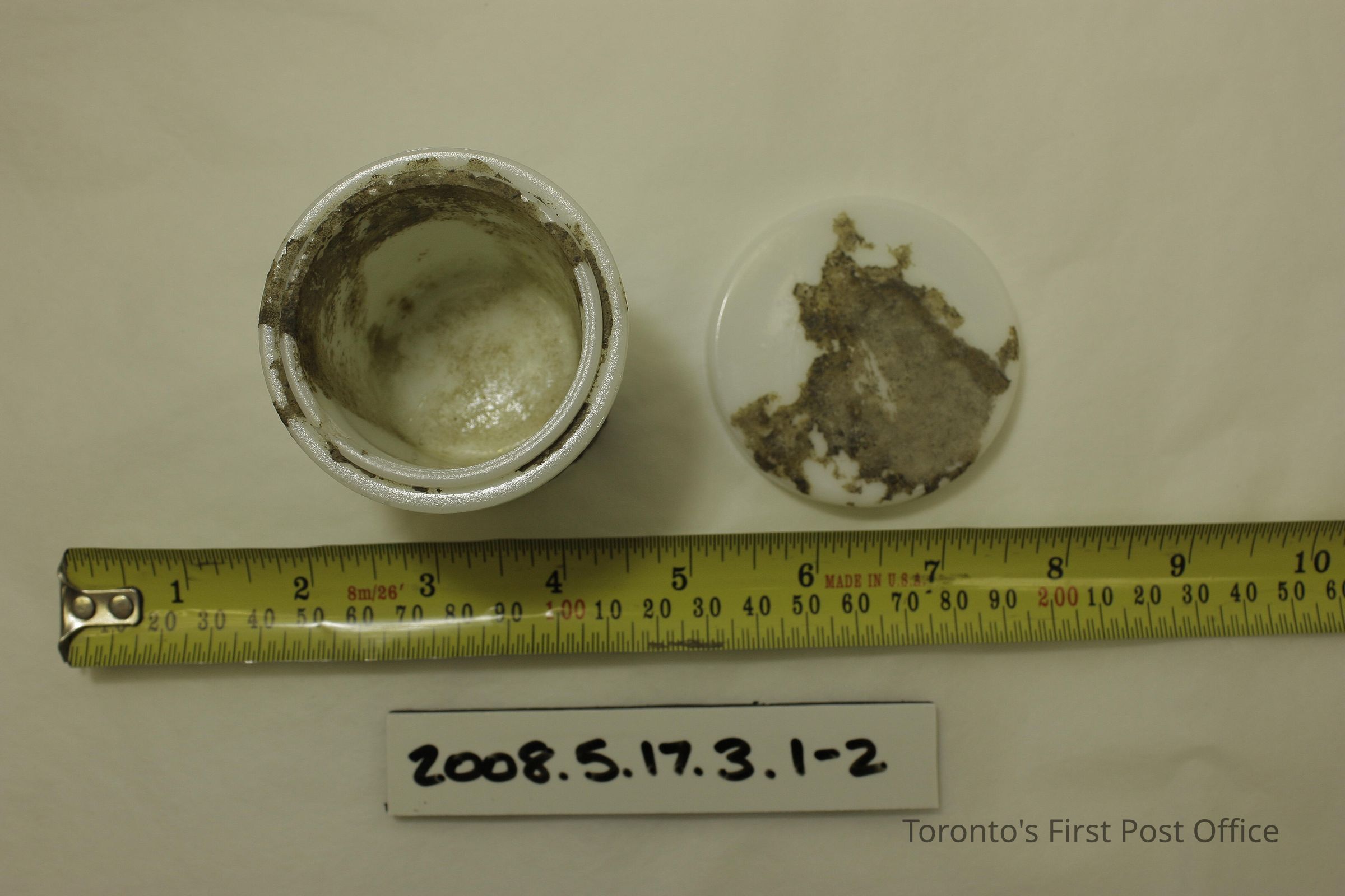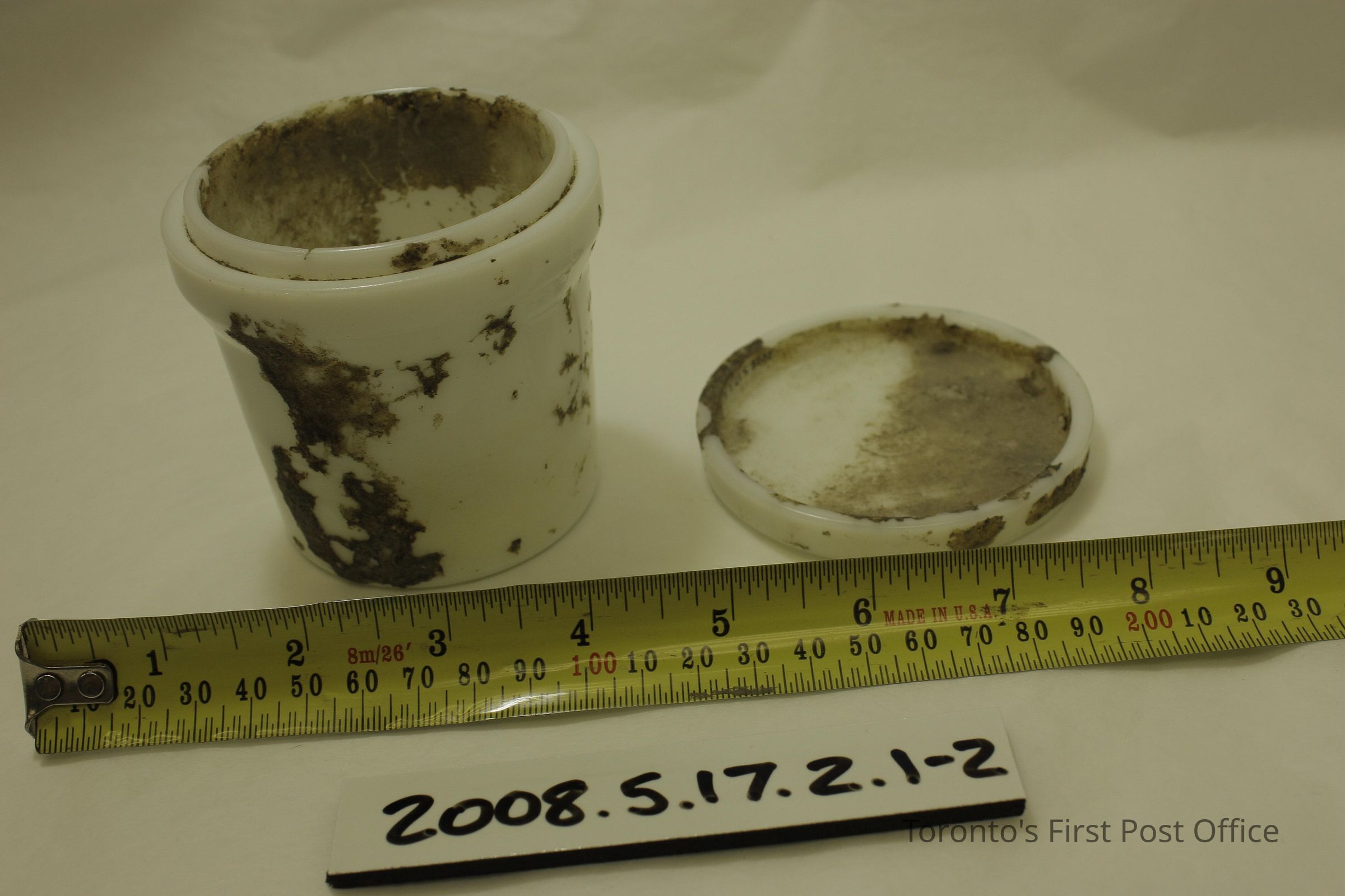 Three milkglass cheese containers as follows: .1: no lid, residue on interior, residue and label remnants on exterior; .2.1-2: jar with lid, residue on interior, residue and label remnants on outside, "Mou…" visible on label; .3.1-2: smaller jar with lid, residue inside and out, lid interior embossed "M.T."; all jar bases embossed "MACLAREN'S IMPERIAL CHEESE TRADE MARK RCSD" with symbol including two cows' heads; all jars 2 piece construction.Dimensions