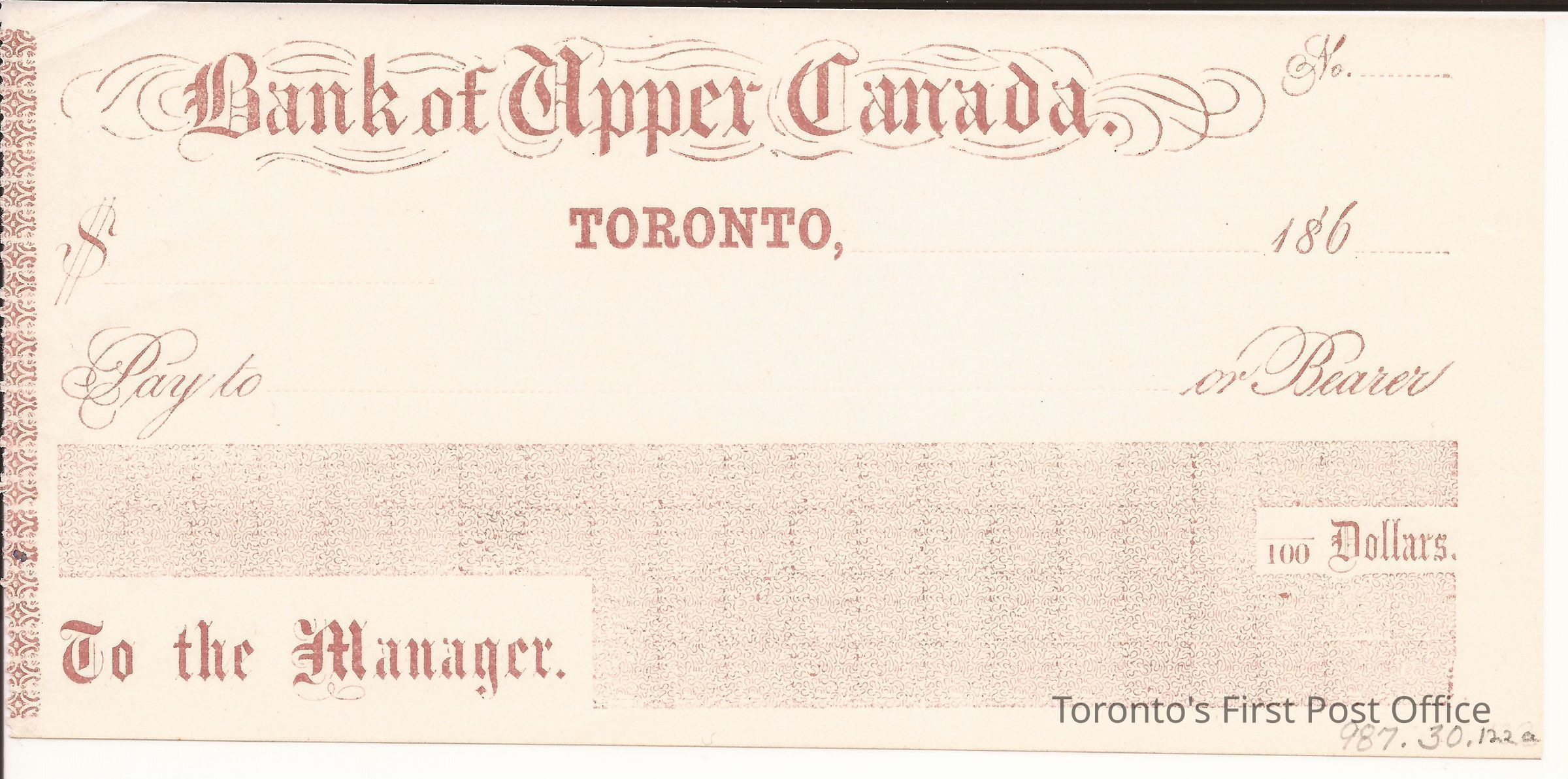 Blank, printed cheque; unbleached, laid paper; red ink; dated: "186…"; made out "To the Manager".