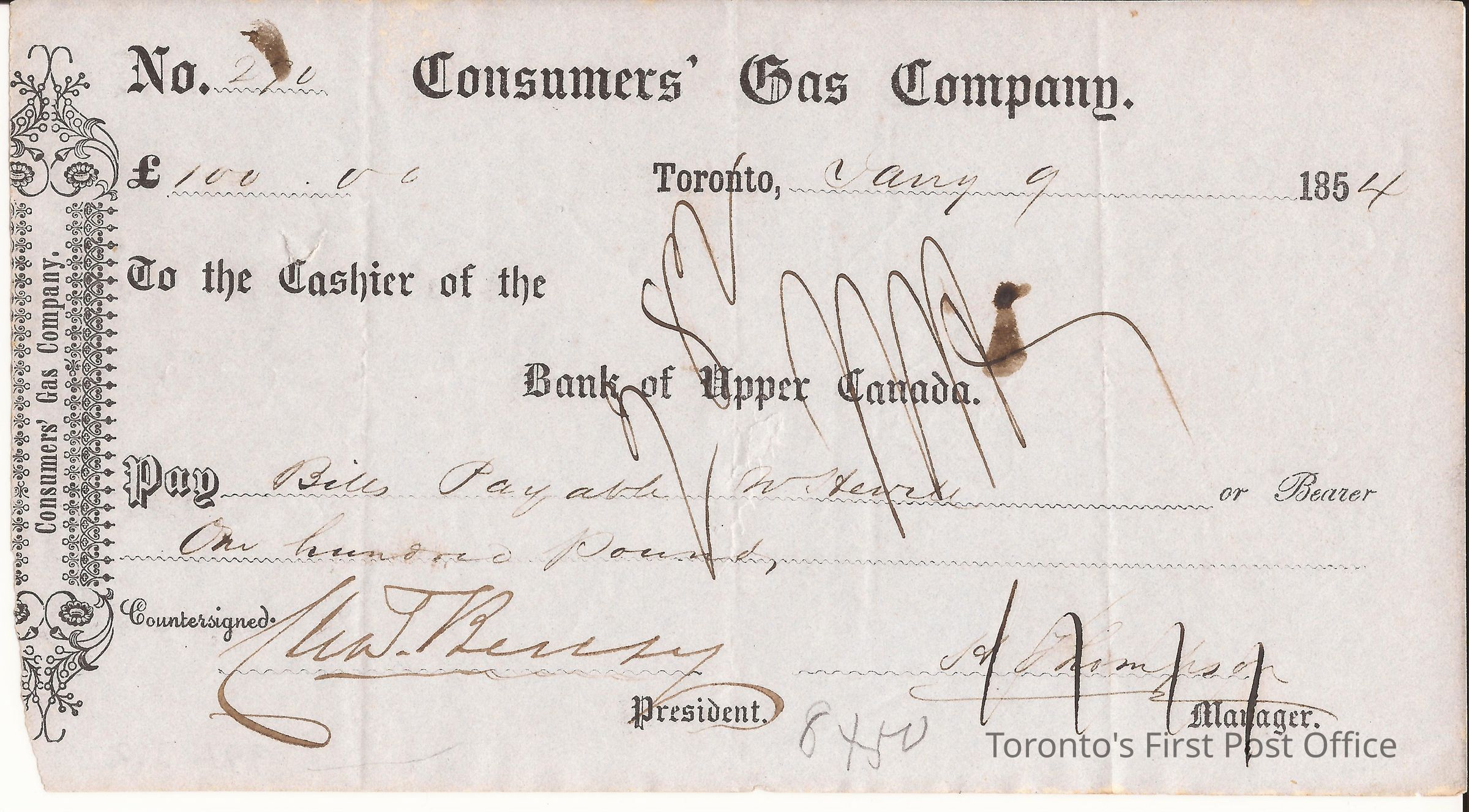 Cheque; pre-printed form in blue ink on light grey paper; originator: Consumer's Gas Company; countersigned by Wm Berczy and H. Thompson, Manager; cheque #270 to the value of £100; dated: Jan 9 1854.Update Date