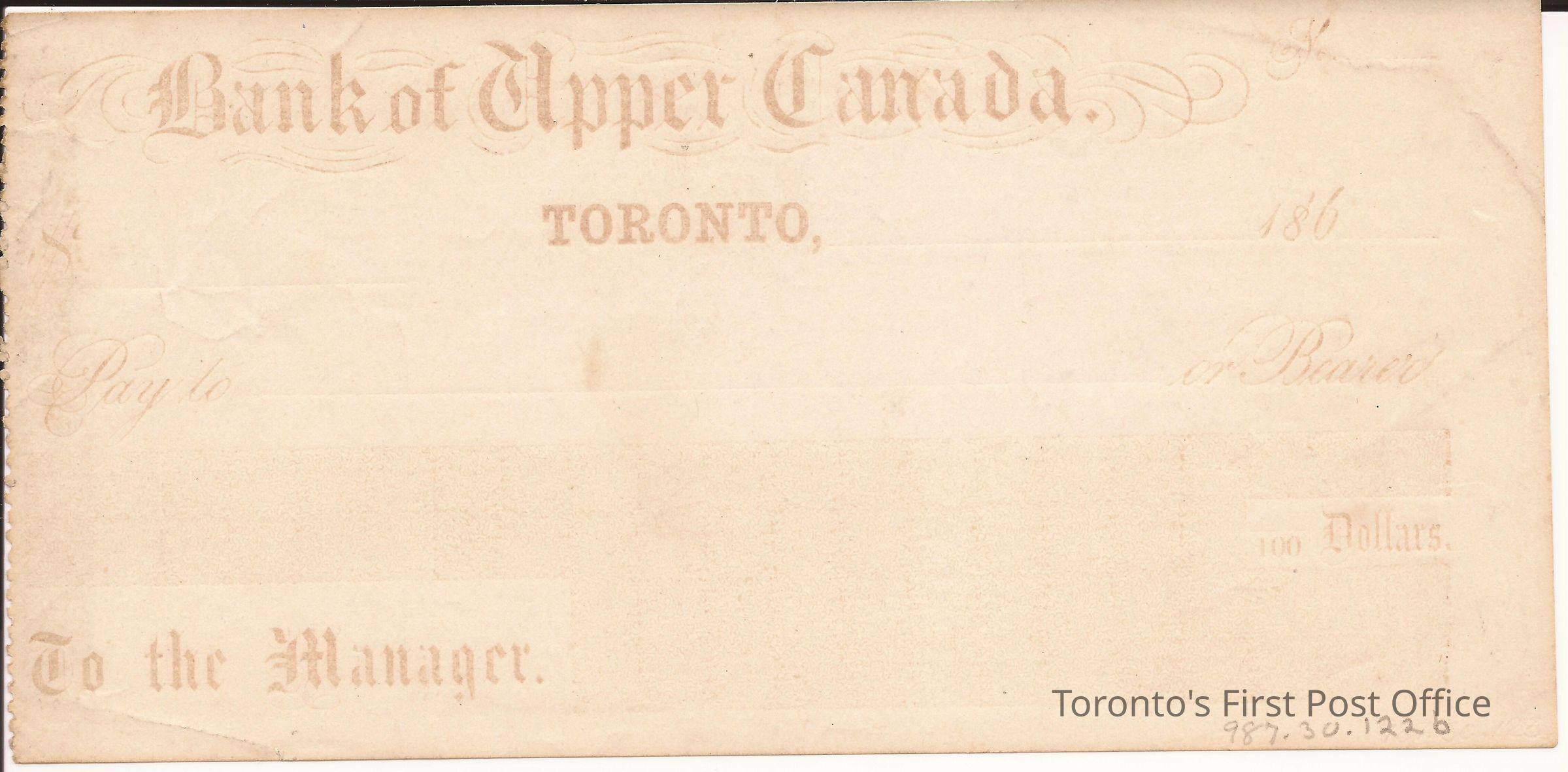 Blank, printed cheque; unbleached, laid paper; red ink; dated: "186…"; made out "To the Manager".