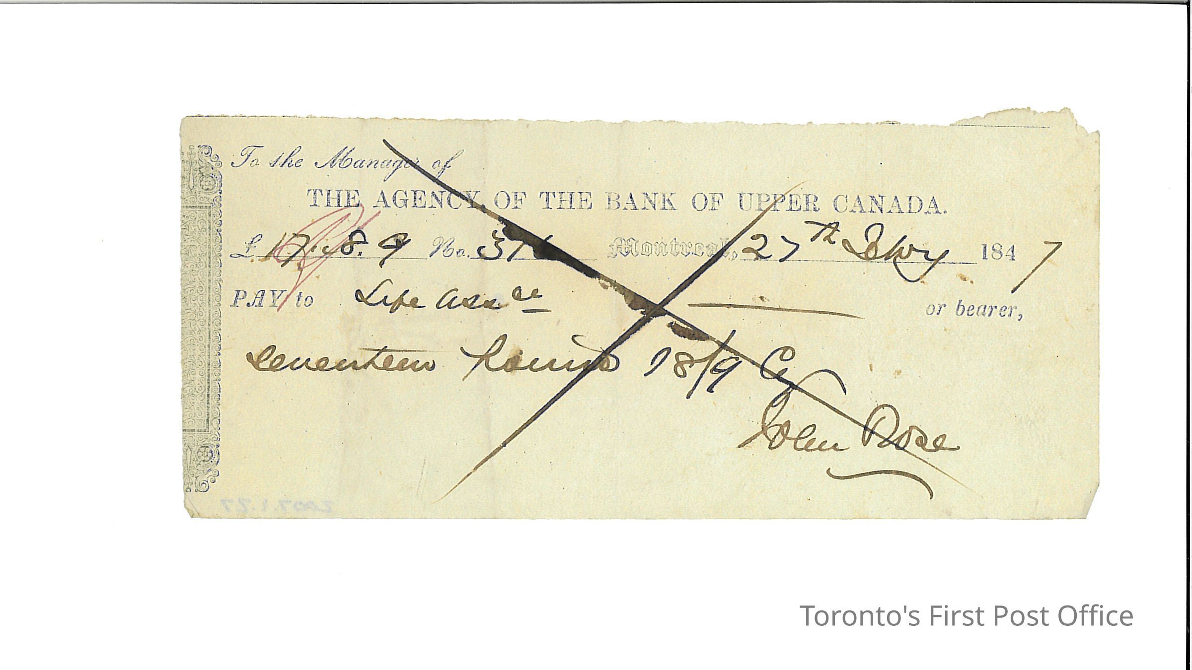 One cancelled cheque for £17/8/9; signed by John Rose; drawn from The Agency of the Bank of Upper Canada; cheque #316(?); cancelled with large "X" over whole of cheque; brown ink manuscript and printed form on white paper; initialled over amount in red ink; made out to Life Assurance; dated Jan 27 1847.Update Date
