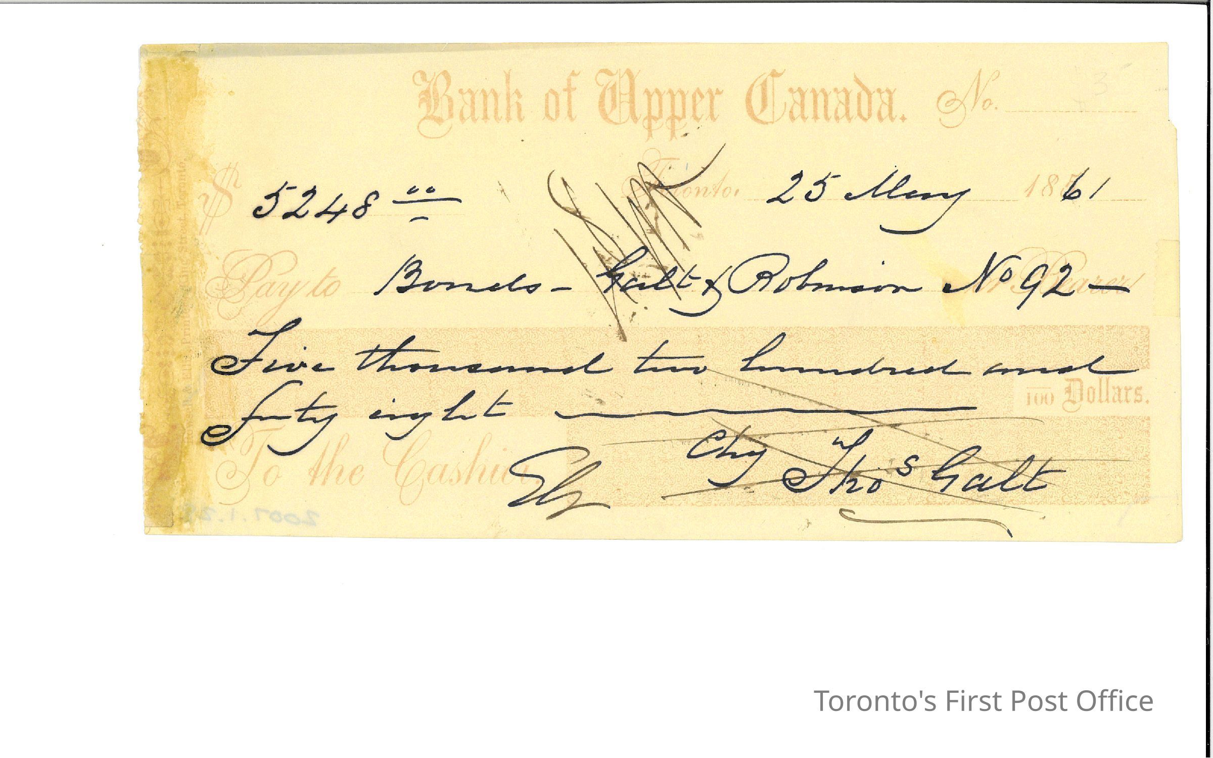 One cancelled cashier's cheque for $5248.00; signed by Thos. Galt; drawn at Bank of Upper Canada; payable to Bonds - Galt and Robinson; cheque #92; black manuscript on red printed form on white paper; "Rowsell and Ellis, Printers, King Street, Toronto." at left edge: glue residue at left edge; dated May 25 1861.Update Date