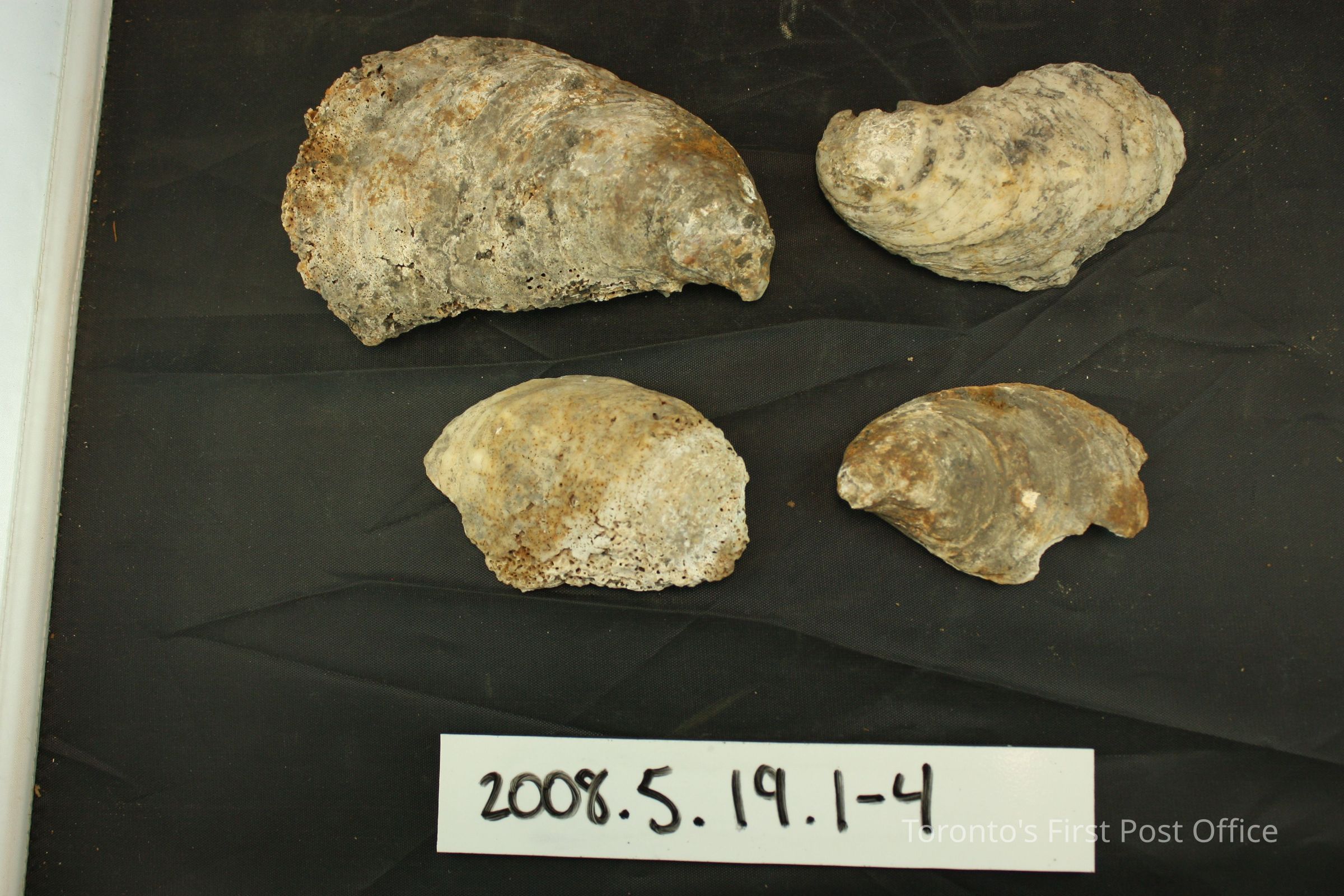 Four half clam shells; .1 and .3 very porous; .1 and .4 residue throughout; pieces broken off edges of all.Dimensions