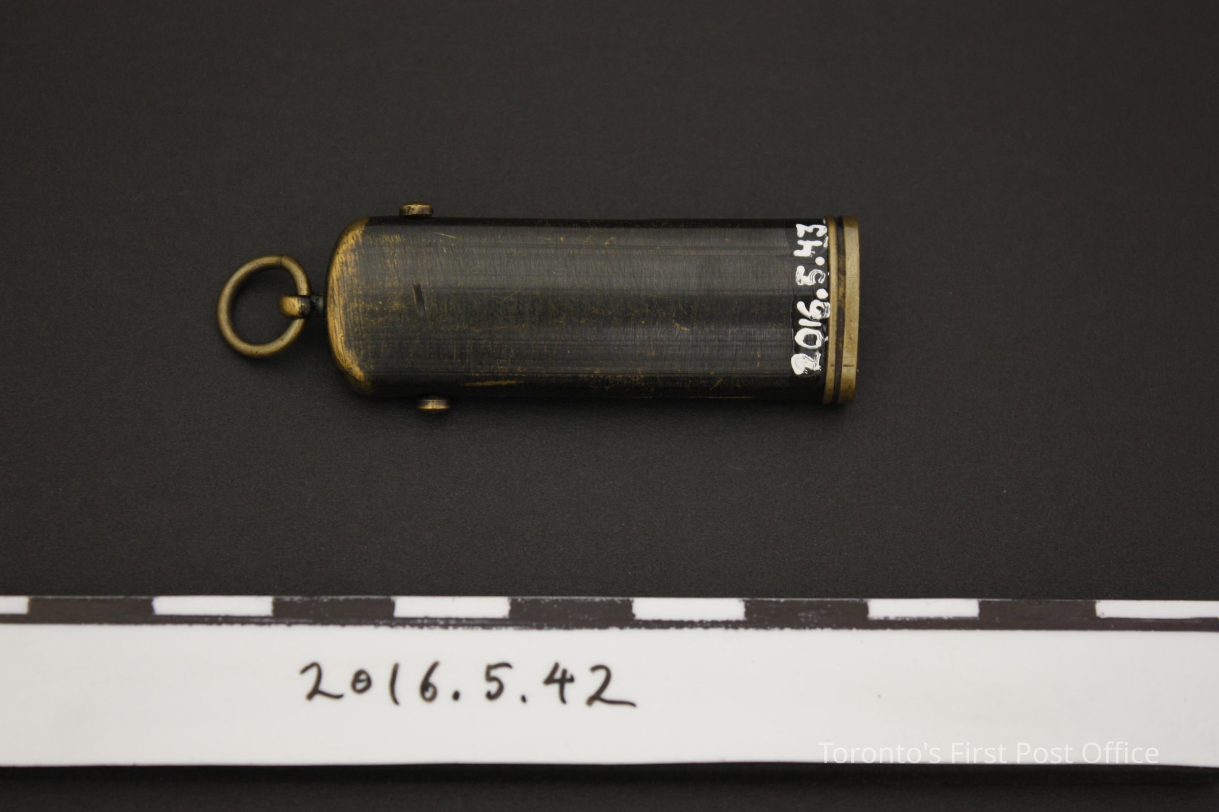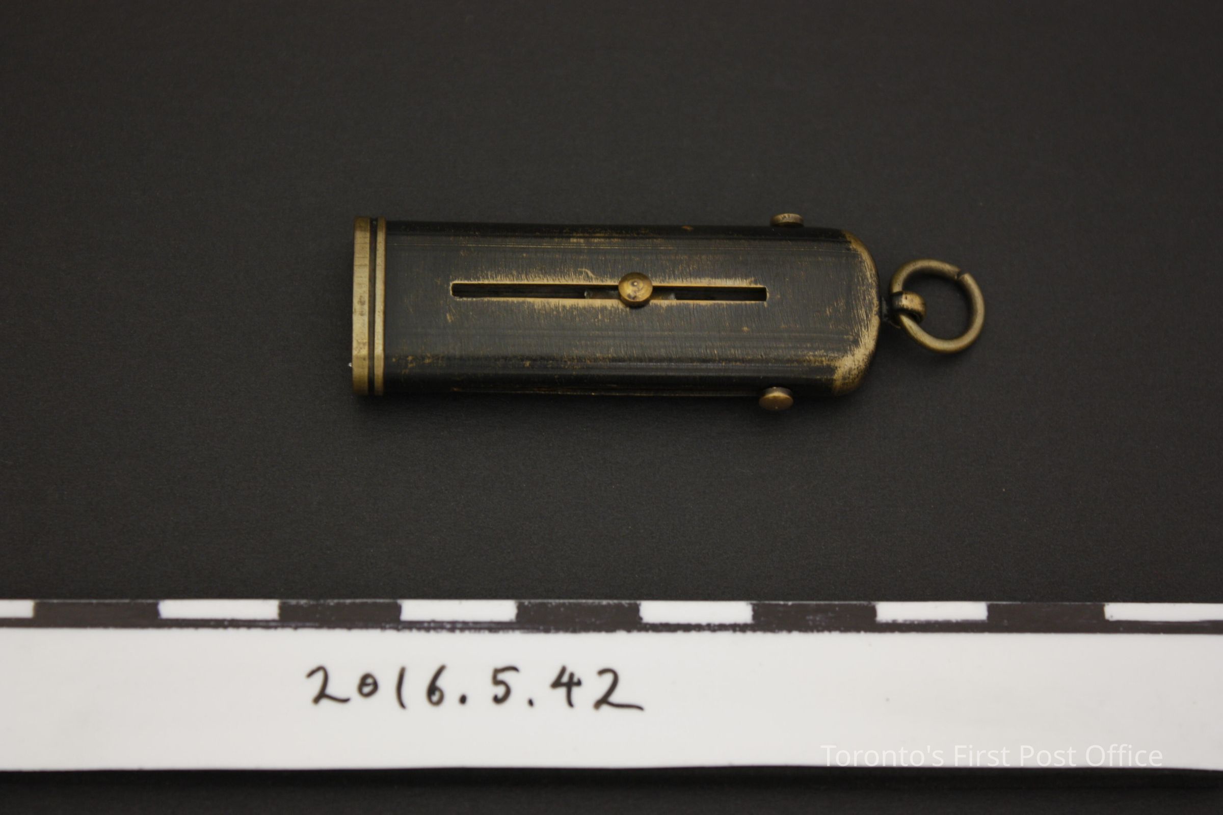 Brass combination tool with 3 functions: knife blade, lead pencil, and lead compartment. The knife is made of steel and is 2.8 cm long while the sliding mechanism is 3cm long. The lead pencil is 1.5 cm (sliding mechanism 2cm). The lead compartment sliding mechanism is 2.7 cm long and there is no lead in it. There is a loop at the top and it is open at the bottom for the tools to slide out. The exterior is patinated black.Dimensions