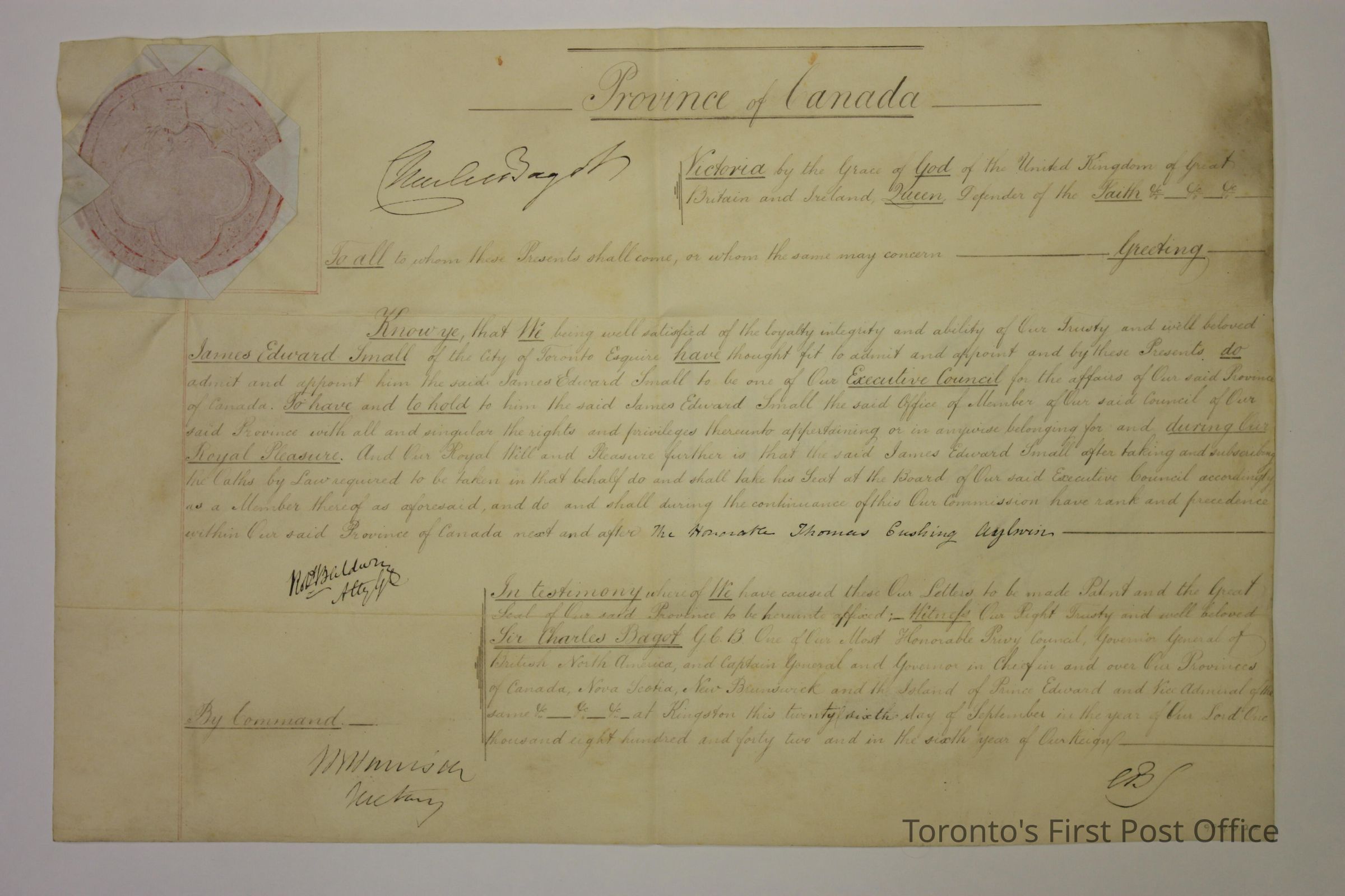 Commission appointing James Edward Small, Esq. a member of the Executive Council; dated 26 Sept 1842; signed R.A. Tucker, Registrar; written by W. Harrison, Secretary; signed by Charles Bagot; black ink manuscript; "Province of Canada" wafer seal at top right; parchment.Update Date