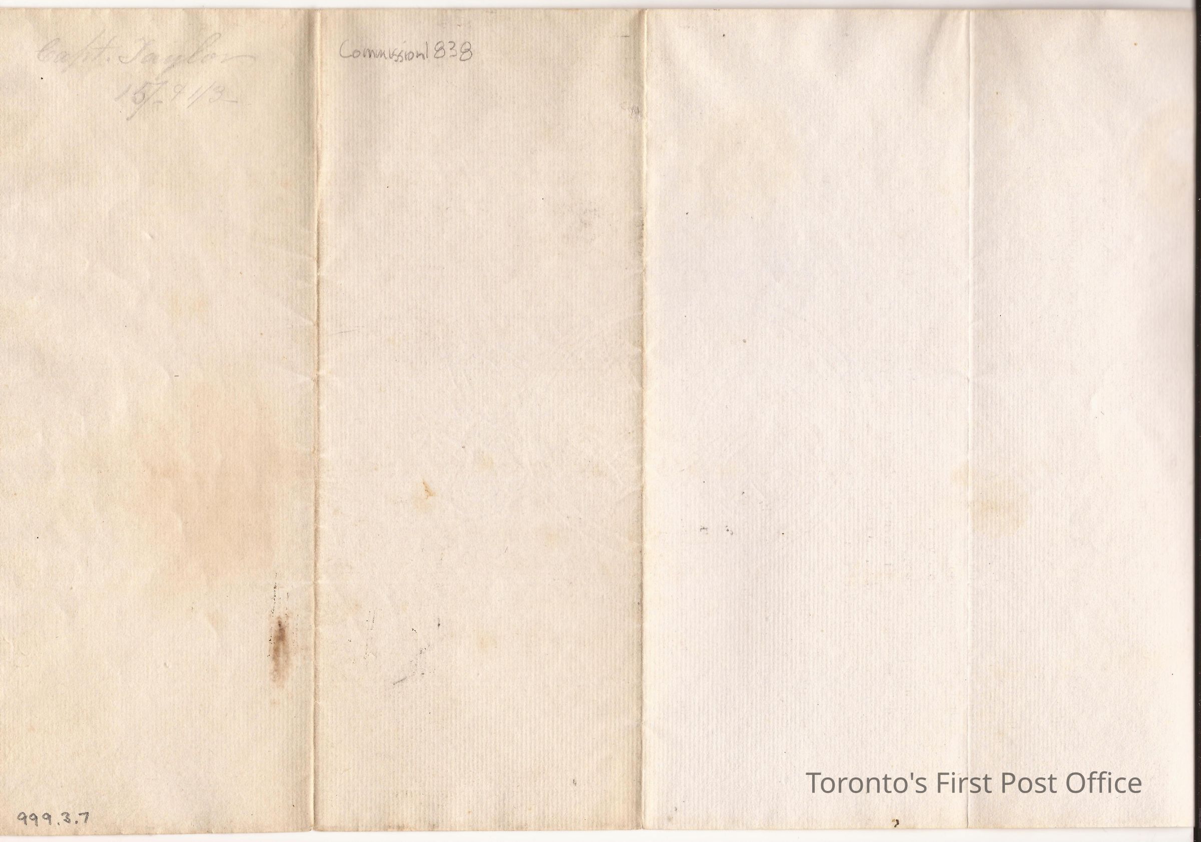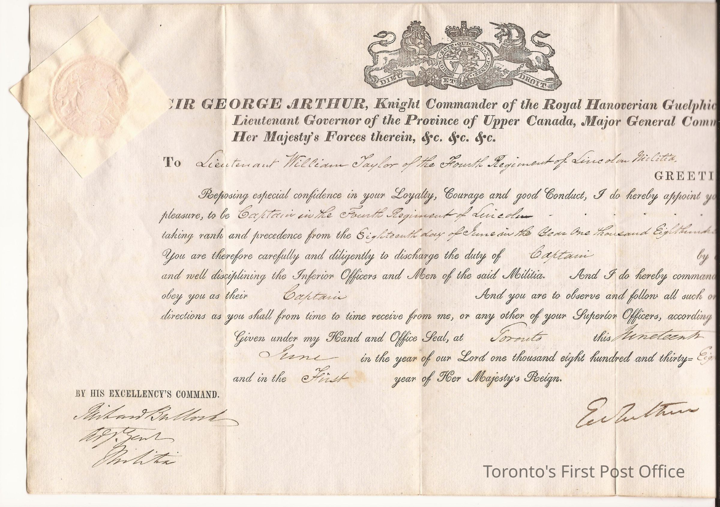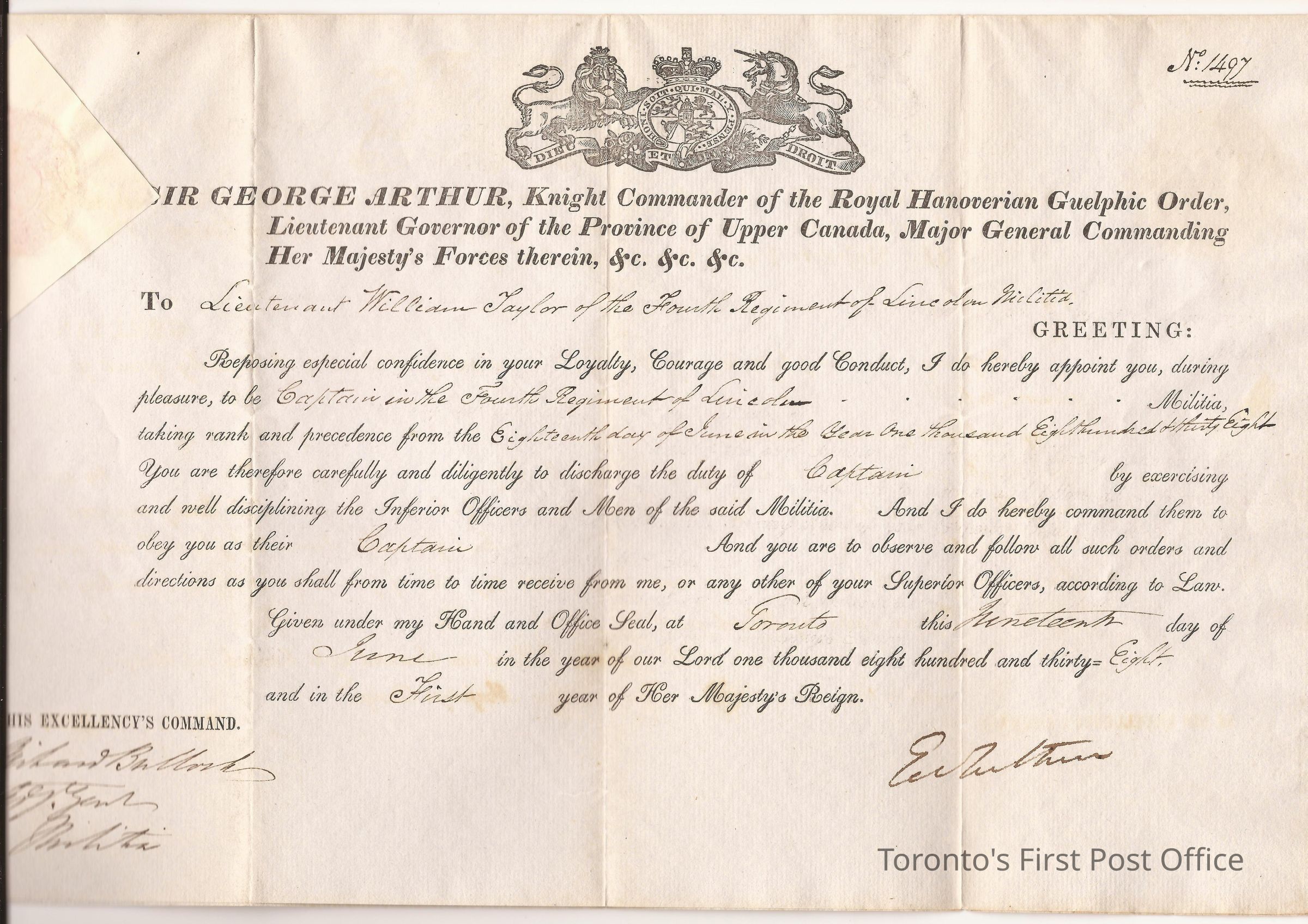 Document of commission; dated 18th June 1838; laid paper with touch of green; watermark: Britannia & W.Tanner 1836; document #1497; re: commission to Lieutenant William Taylor of the 4th Regiment of Lincoln Militia appointing Taylor to be Captain in the 4th Regiment of Lincoln from the 18th June 1838; signed G. Arthur; red wafer seal of U.C. at top left.Dimensions