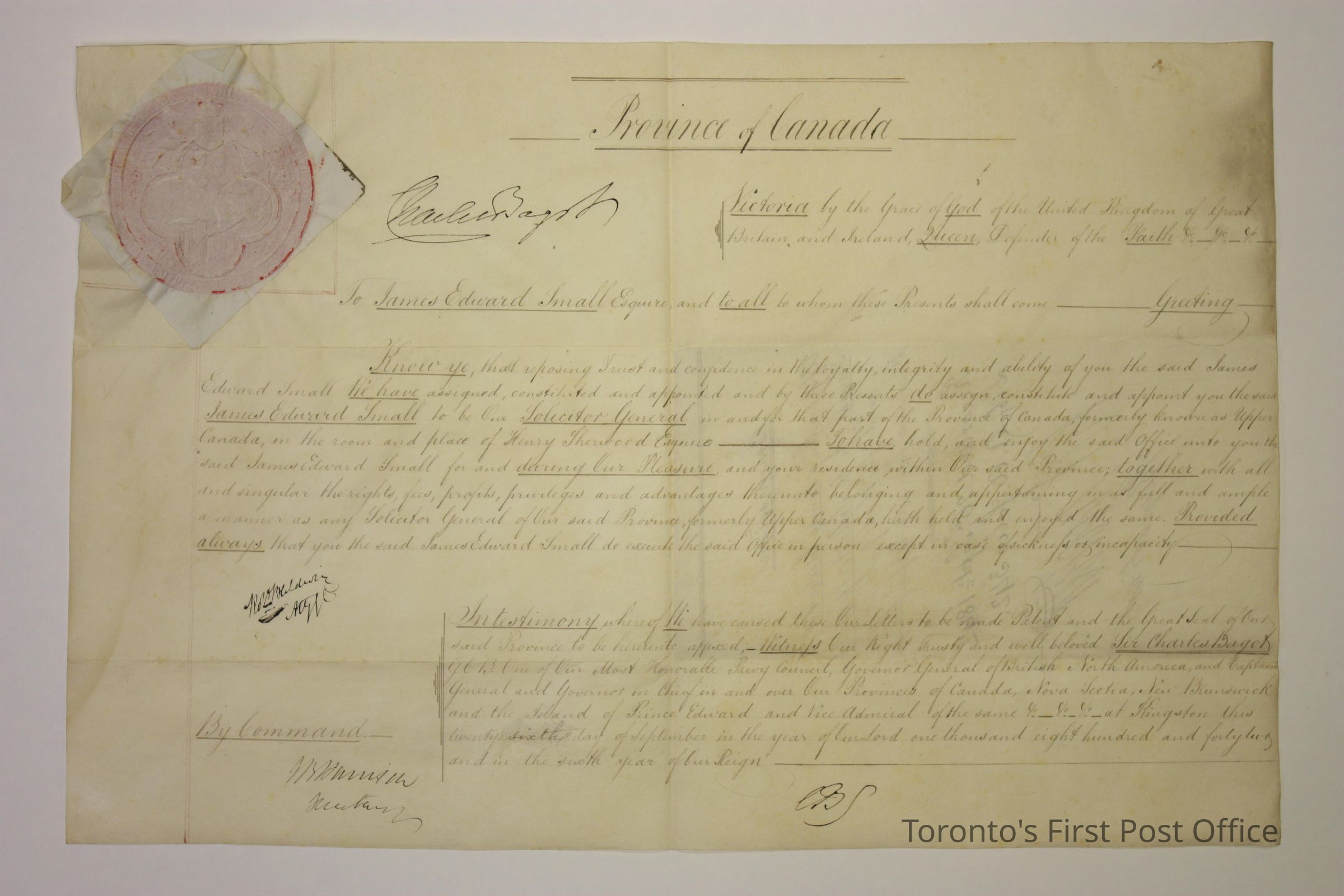 Commission appointing James Edward Small to be Solicitor General in and for that part of the Province, formerly Upper Canada; recorded 26th Sept. 1842; folio 342; signed R. Tucker, Registrar; manuscript; wafer seal is of Province of Canada; parchment; signed also by Sir Charles Bagot, Governor General, and Robert Baldwin.Dimensions