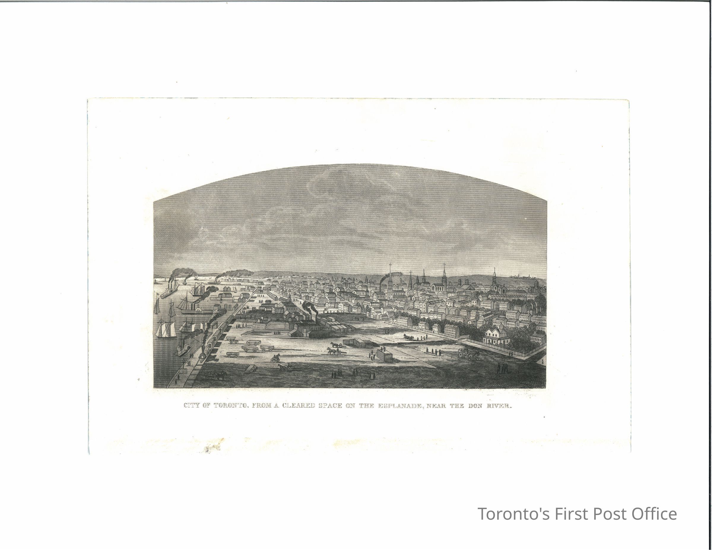 Copper plate engraving; titled "CITY OF TORONTO, FROM A CLEARED SPACE ON THE ESPLANADE, NEAR THE DON RIVER"; black on white; lower edge ragged (torn from a book).Dimensions