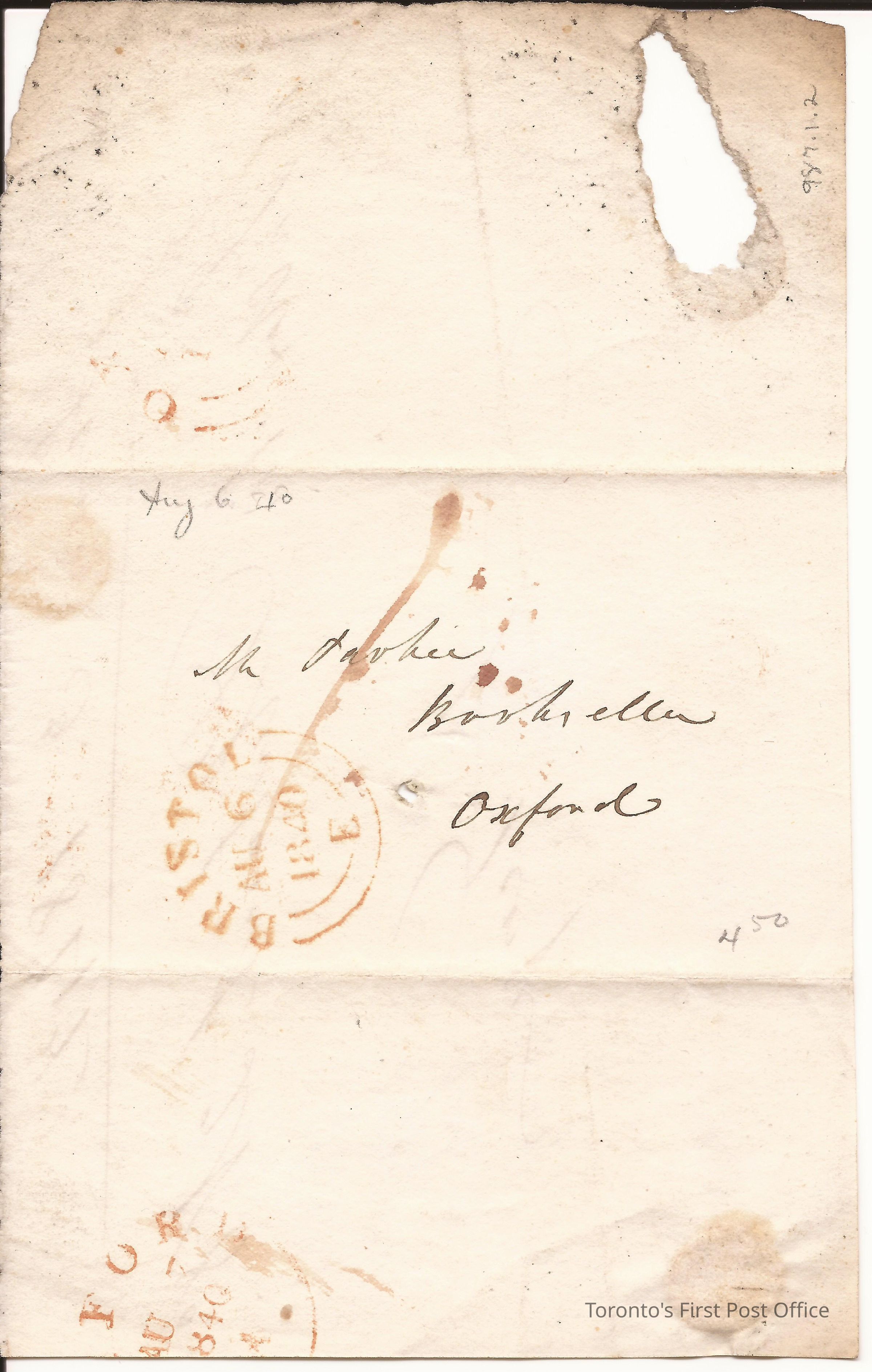 Unbleached paper; red wafer seal; dated: June 3, 1842; mailed from Bristol Aug 6, 1840, arrived in Oxford Aug 7, 1840; addressed to Mr. Tavher, Booksetter, Oxford; postmarks: 1. double broken, orange-red BRISTOL AUG 1840 E, 2. double broken, orange-red OXFORD AU7 1840; pencil markings (difficult to make out).Update Date
