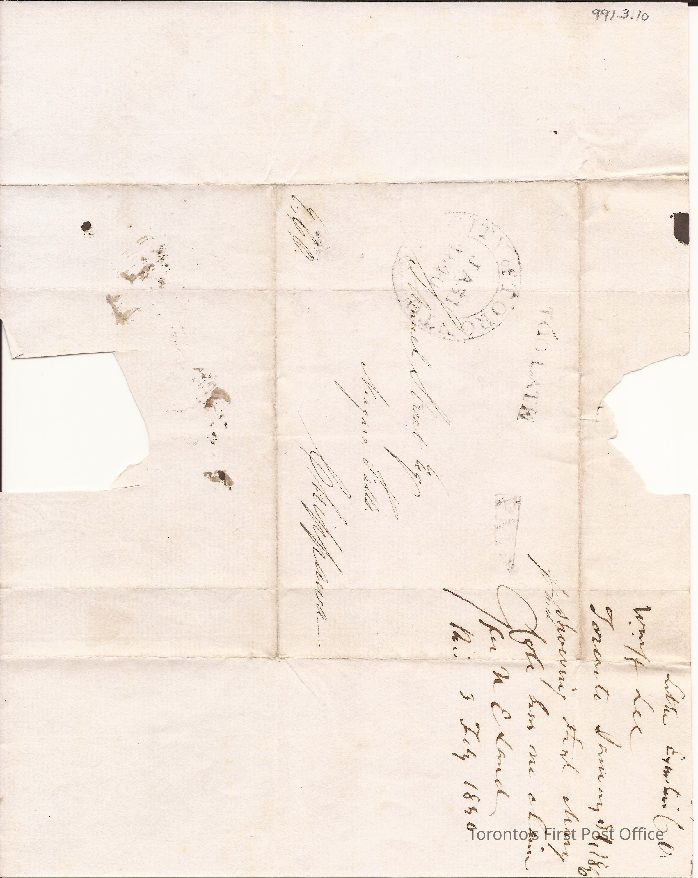 Cover from "… Lee (or) N.E. Land"; to Samuel Sheet Esq.; Jan 31, 1840; cream laid paper; black ink faded to brown; postmarks: black stamp: "Too Late", "Paid", "31 Jan 1840".Dimensions