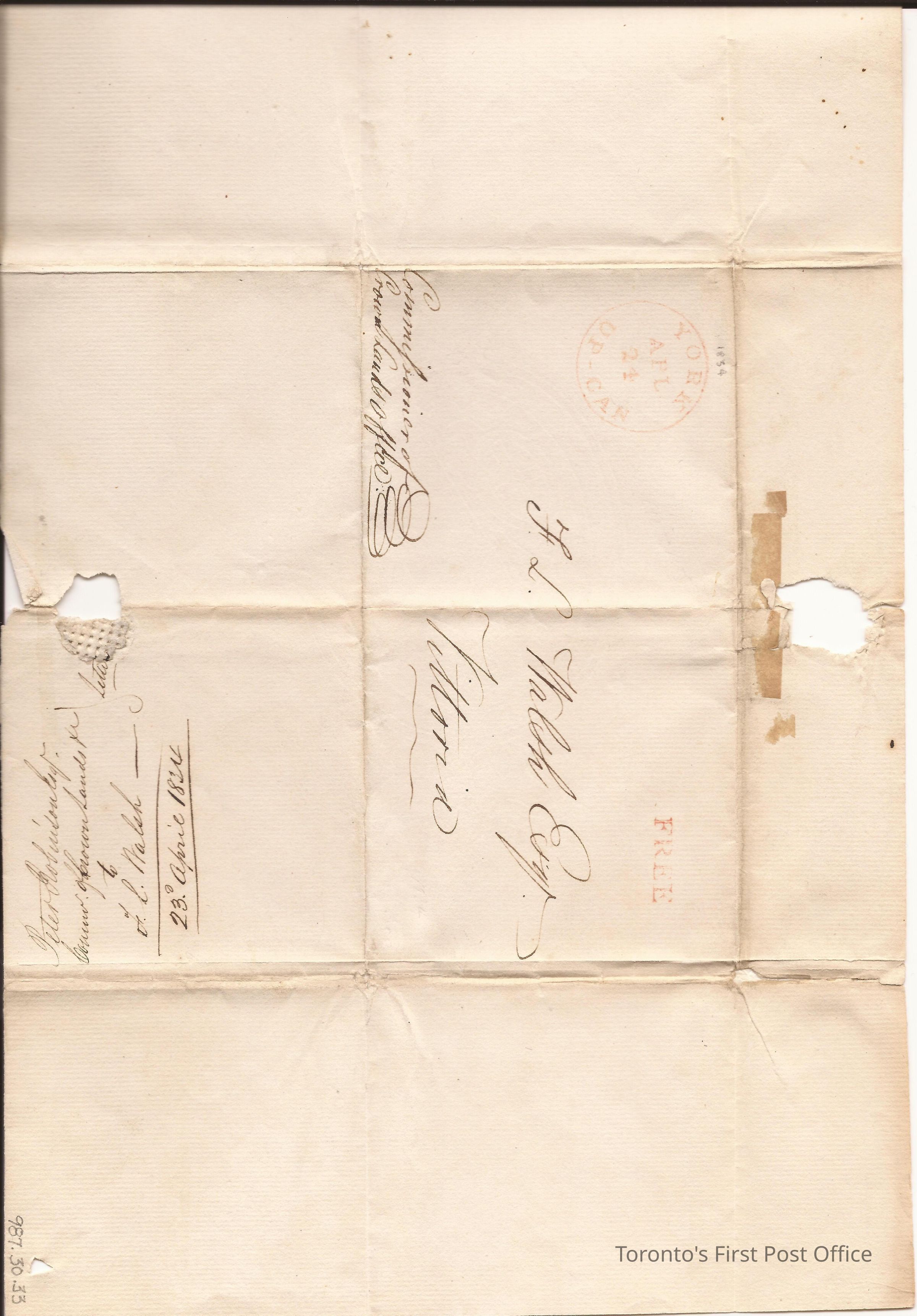 From Peter Robinson, Commissioner of Crown Lands; to F.L. Walsh; postmarks: "YORK APL 24 UP-CAN", "FREE"; partial wafer seal; watermark: crown over medallion with Britannia.Dimensions