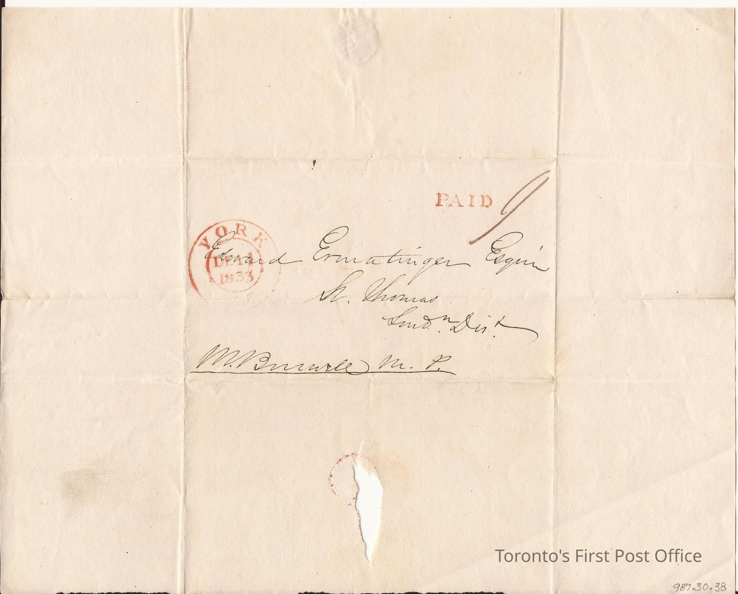 To Edward Ermatinger Esq., St. Thomas London District; from Mahlon Burwell M.P. Toronto; postmarks: "YORK DE 14 1833 U.C.", "PAID"; laid paper; watermark "1833"; half a page only; was sealed with a wafer seal.Update Date