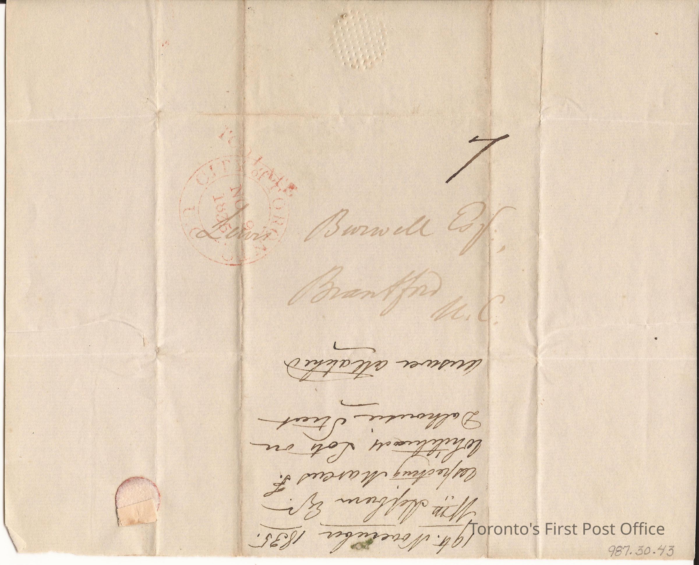 From Wm. Hepburn Esq.; To Lewis Burwell Esq., Brantford; re: Marcus F. Whitchurch Lots on Dalhousie Street, "answer attached"; postmarks: "CITY OF TORONTO NO 9 1835 U.C.", "TOO LATE"; red wafer seal; laid paper; half page only.Dimensions