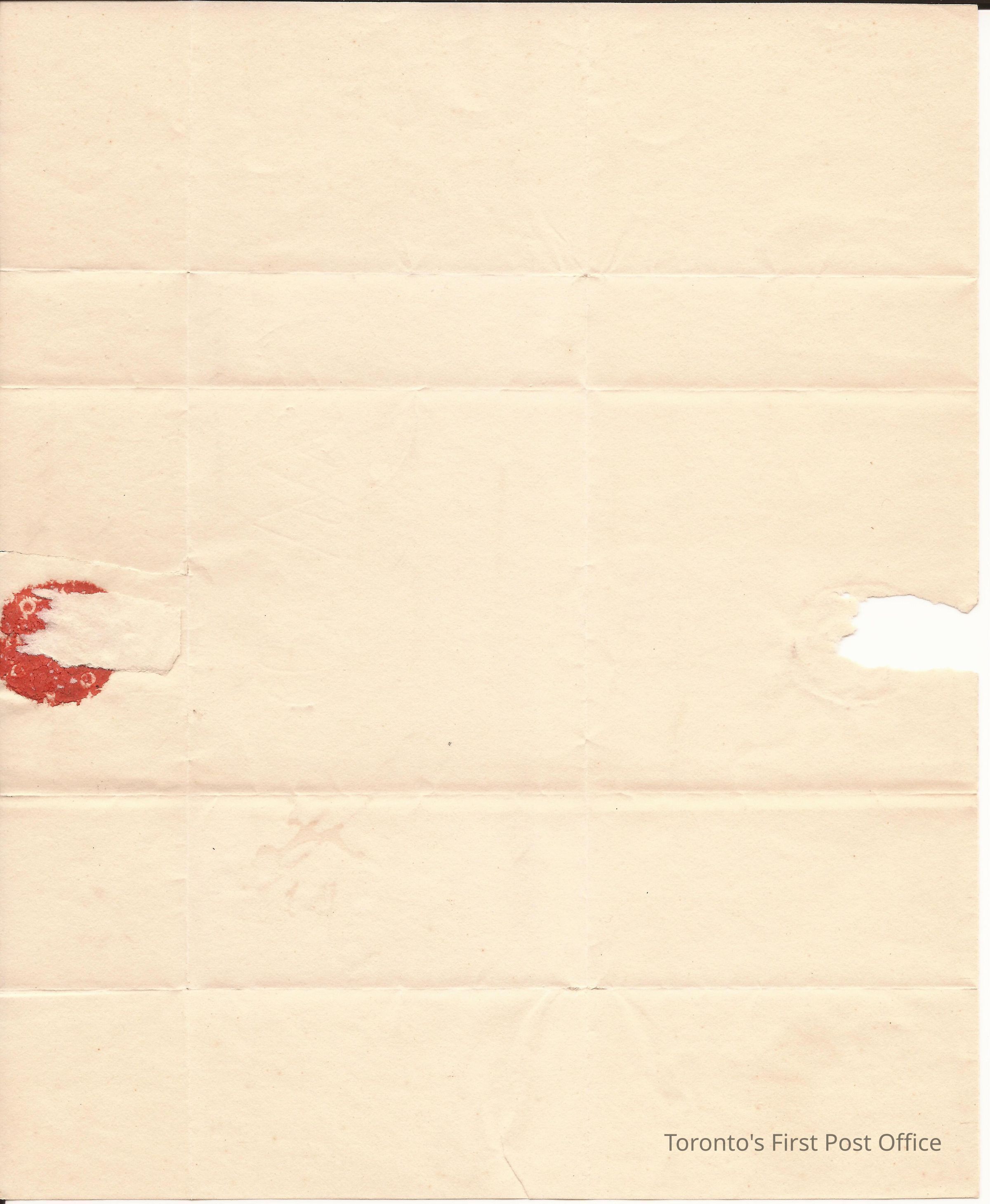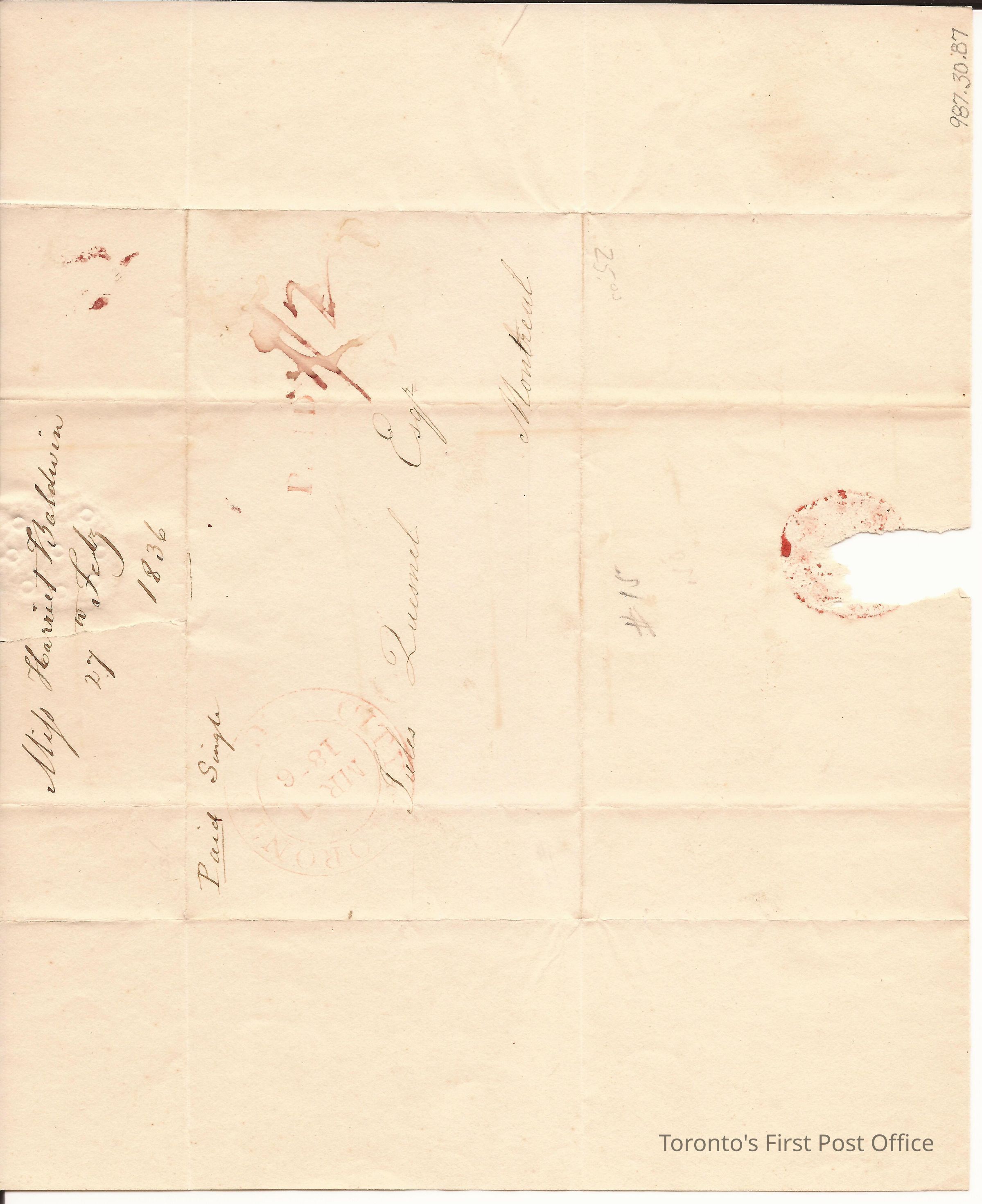 To Jules Quesnel Esq., Montreal; from Miss Harriet Baldwin; dated: 27 Feb 1836; postmarks: 1. double red "CITY OF TORONTO MR 1 1836 U.C.", 2. single, manuscript "PAID", 3. red "PAID"; postage: "1/2" in red manuscript; unbleached paper; black ink faded to brown; red wafer seal; watermark: "GW 1832"Dimensions