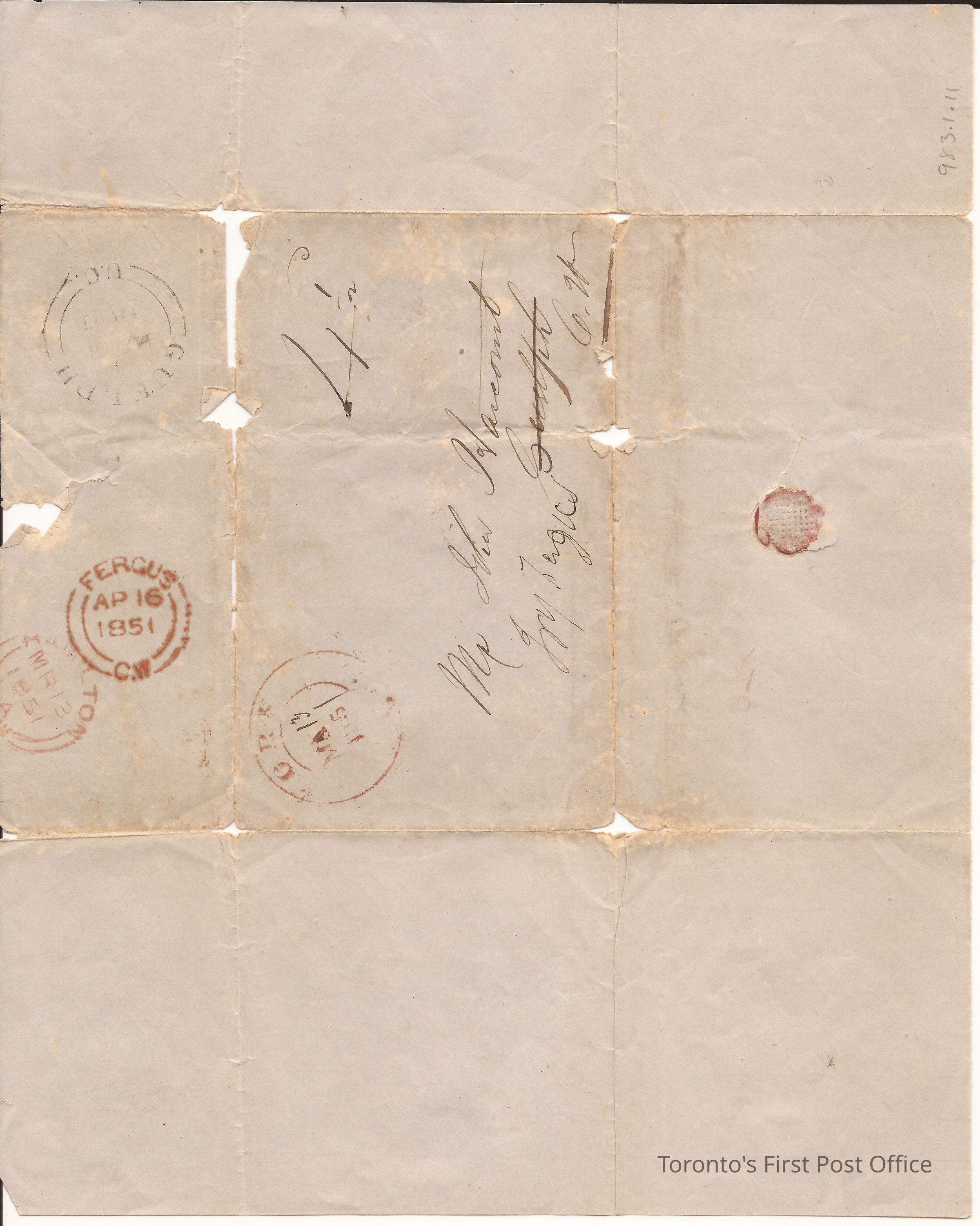 Black ink; grey paper with guide lines; red wafer seal; addressed to Mr. John Harcourt, Fergus; 4 1/2 post rate; date stamps: 1. double red "OR MA13 185", 2. double broken black "GUELPH 1851 U.C.", 3. double broken orange-red "FERGUS AP16 1851 C.W.", 4. double broken orange-red "HAMILTON MR13 1851 C.W."Update Date