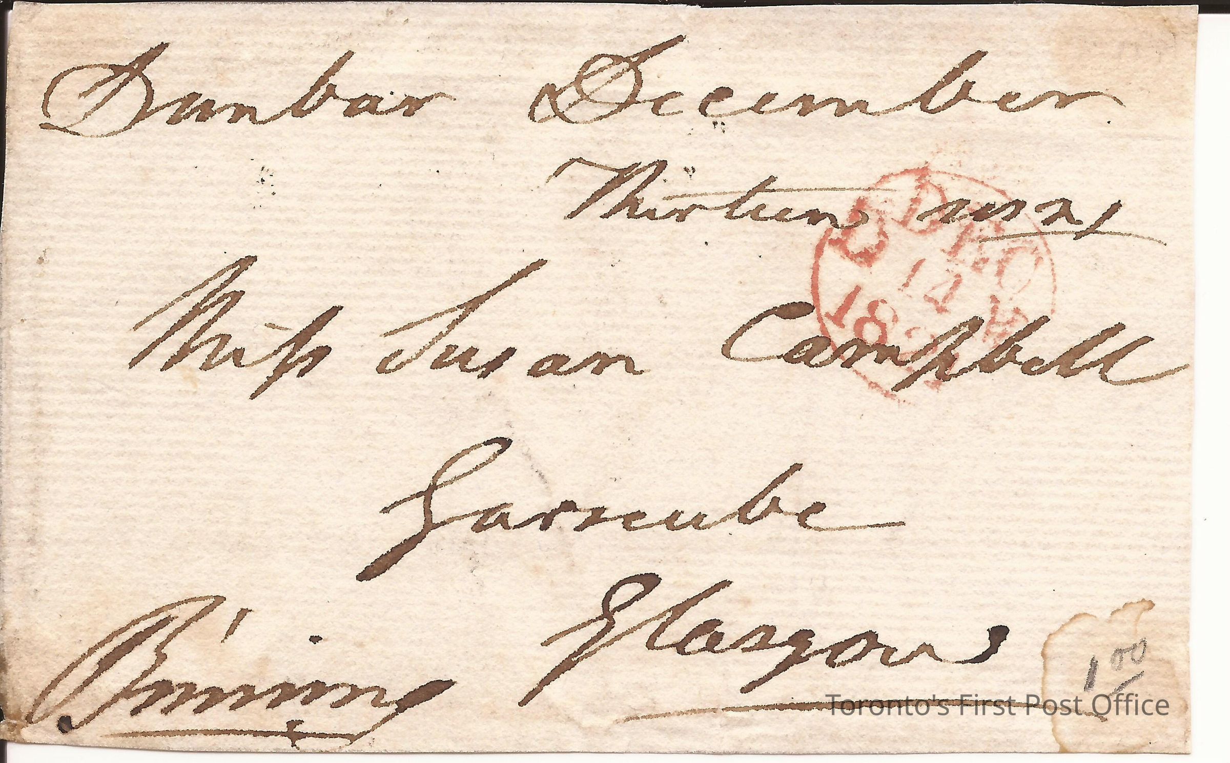 Laid paper, part of an envelope, cutting lines not straight; dated: Dunbar December Thirteen 1821; addressed to Miss Susan Campbell Garscube (?), Dinning, Glasgow; postmarks: 1. single, red DEC D14 M 1821, 2. FREE FRANK signed by Binning MP.Update Date