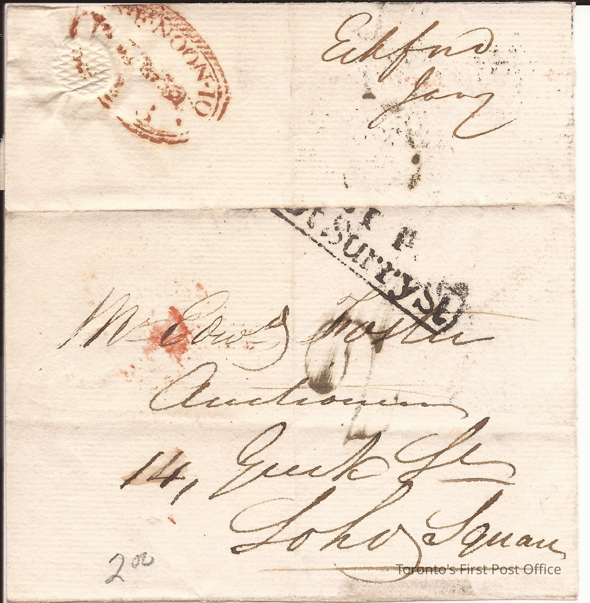 Laid paper; watermark "BROCKI" (rest is cut off); green wafer seal; addressed to Mr. Edwd Foster, Auctioneer, 14 Greek (?) St., Soho Square; British postmarks: 1. 2 circle orb, oval, orange-red "…NOON 10" (the rest is not decipherable), 2. rectangular, black.Update Date