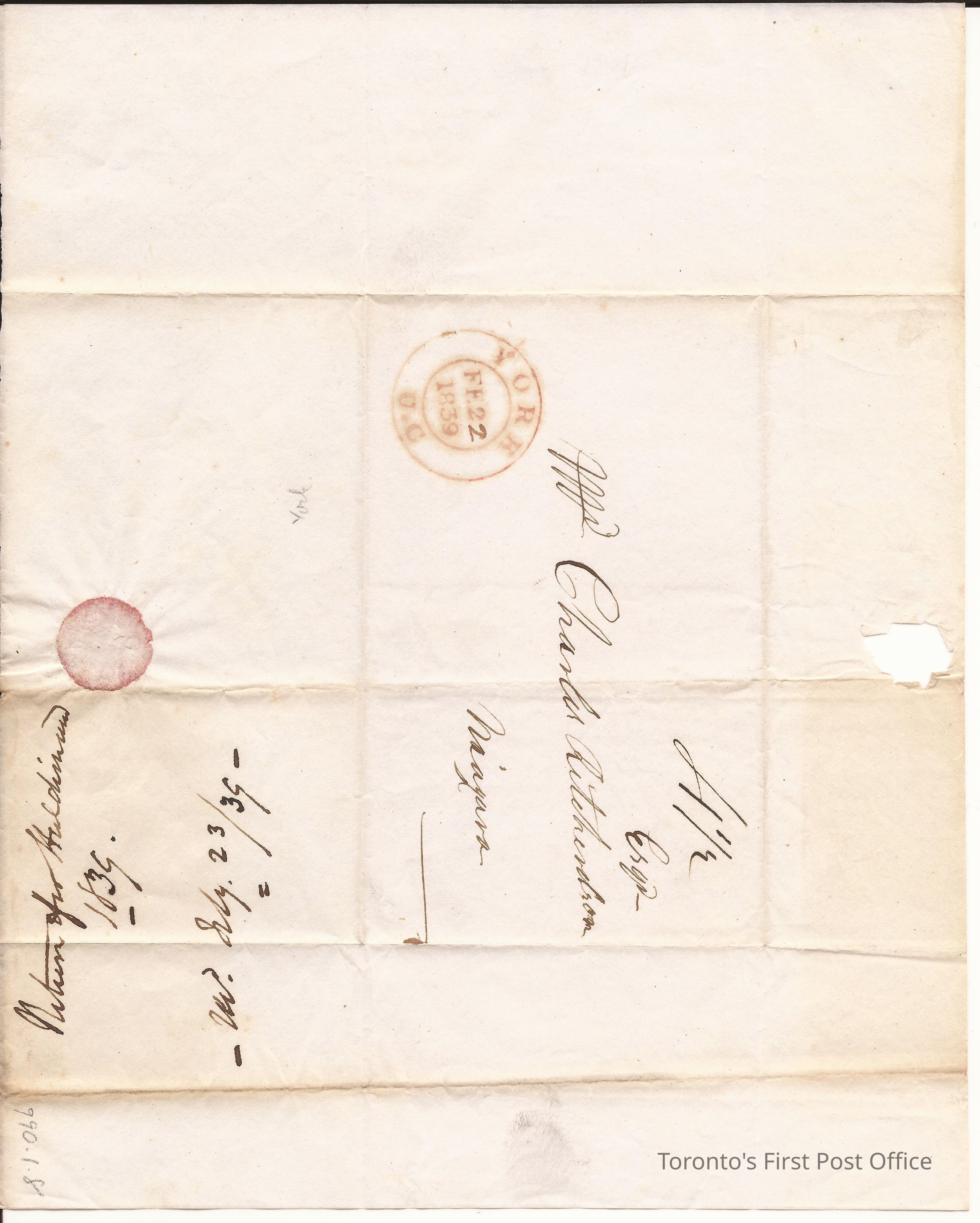 Cover from Haldimand; to Charles Richardson Esq., Niagara; postmarks: red double "YORK FE 22 1839 U.C."; postage: black manuscript "4 1/2".Dimensions