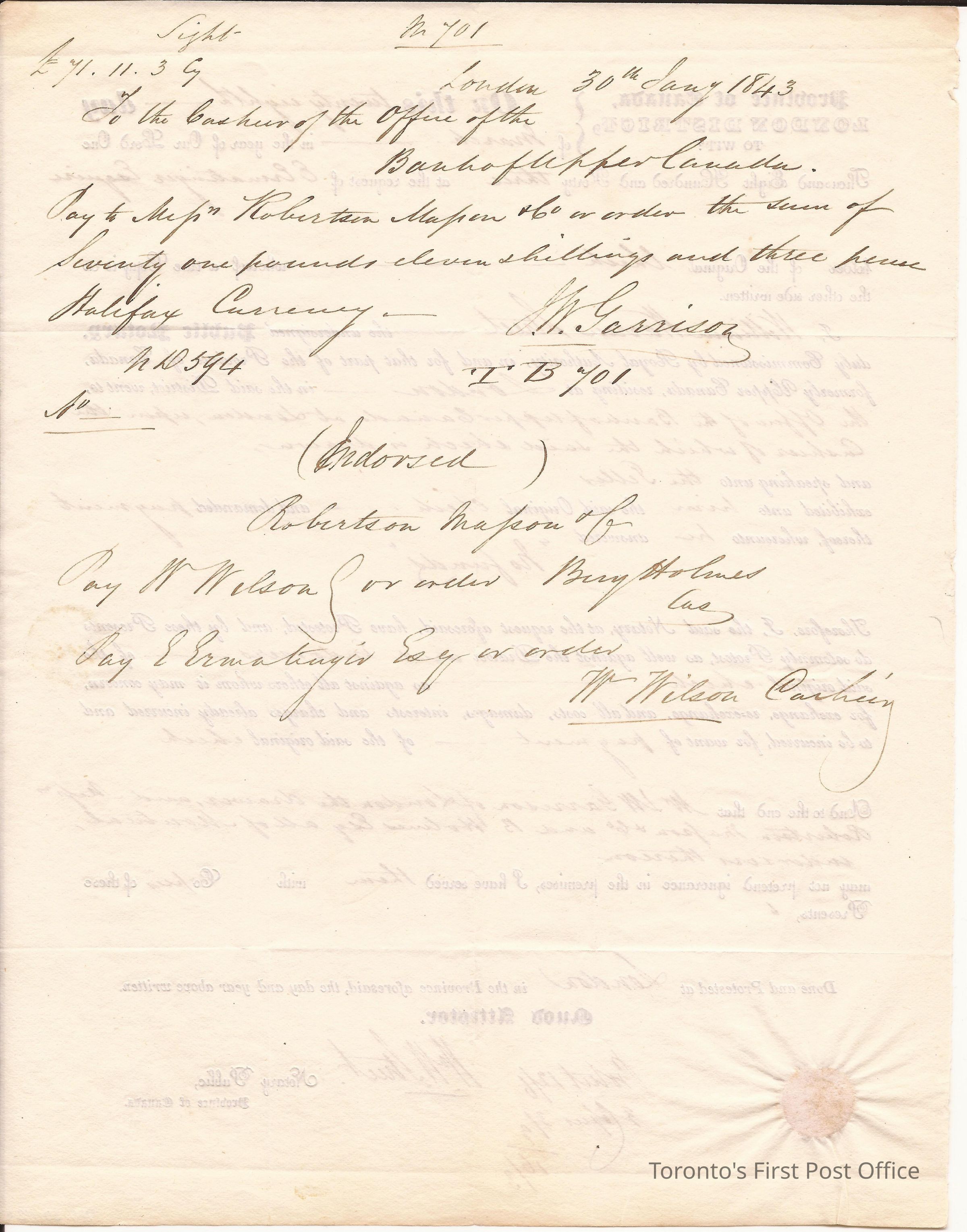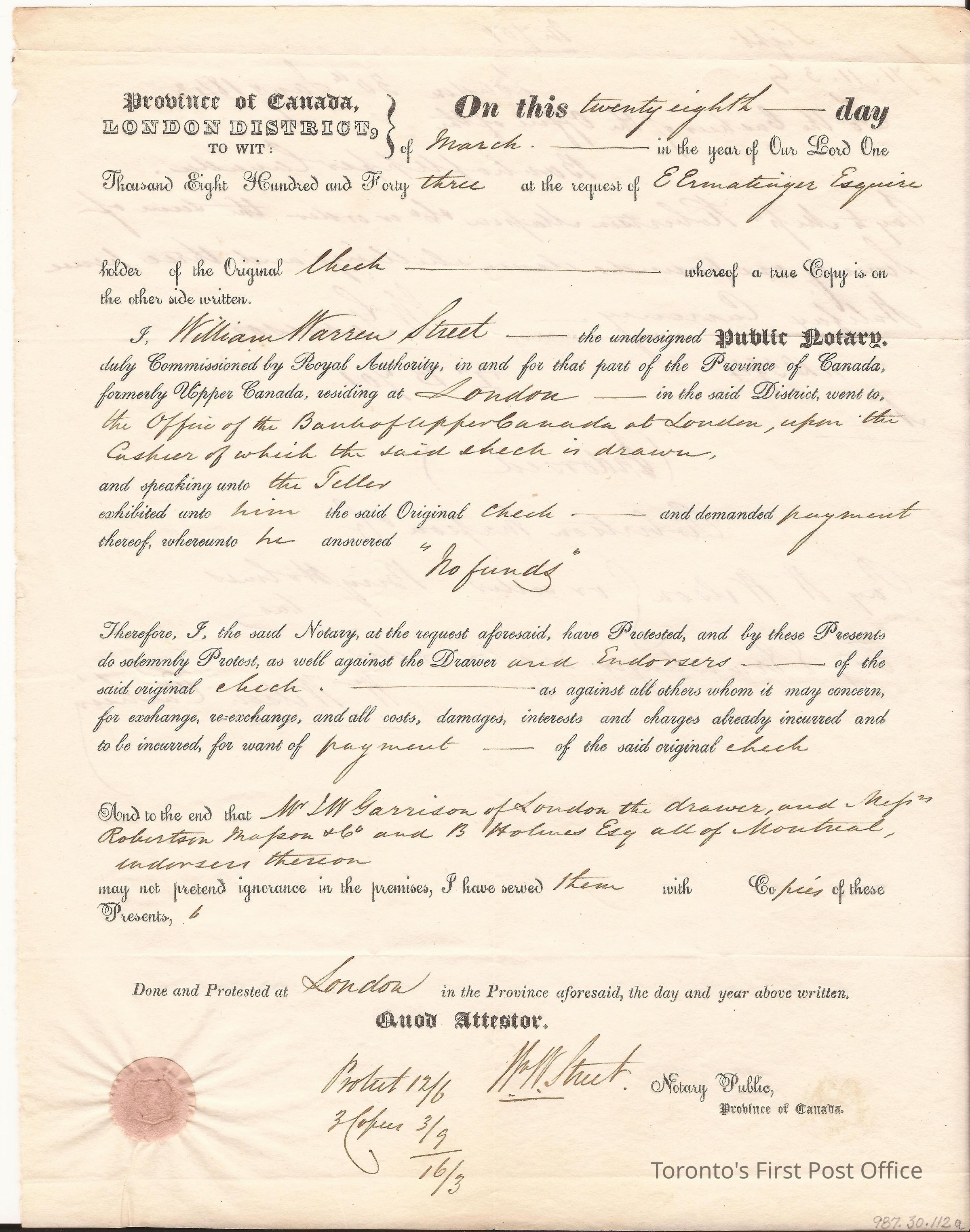 To Messrs. Robertson Massan & Co., Montreal; dated 28 March 1843, London C.W.; postmarks: red broken double "LONDON MAR 29 1843 U.C."; postage: "1/6" in manuscript; red wafer seal; unbleached, crisp paper; black ink; contained letter 987.31.112.1.Dimensions