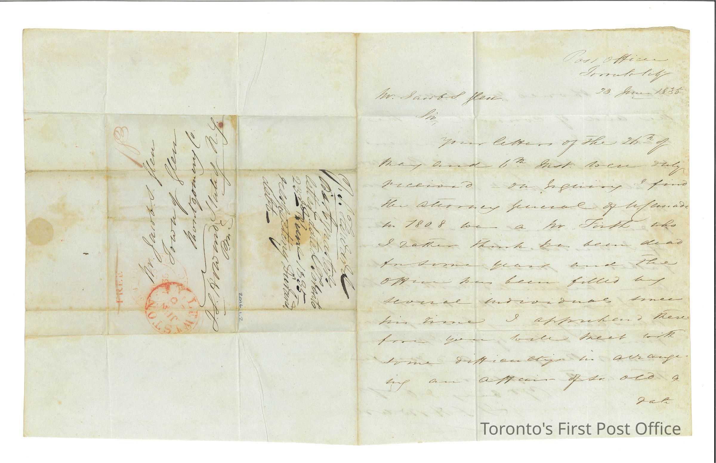 Cover and letter. Two sheets of (lignin-free?) paper, folded on the horizontal third lines and again on the vertical third lines. The name 'Mr Jacob S Glen' and the address of 'Town of Glen, Montgomery Co., State of New York' are written in black/brown ink on the letter cover. Two round, red ink, stamps overlap in the top proper right of the letter cover, reading 'Weston June 20' and 'City of Toronto U.C. JU 23, 1835'. The word 'Free' is stamped in red ink along the top edge.Update Date