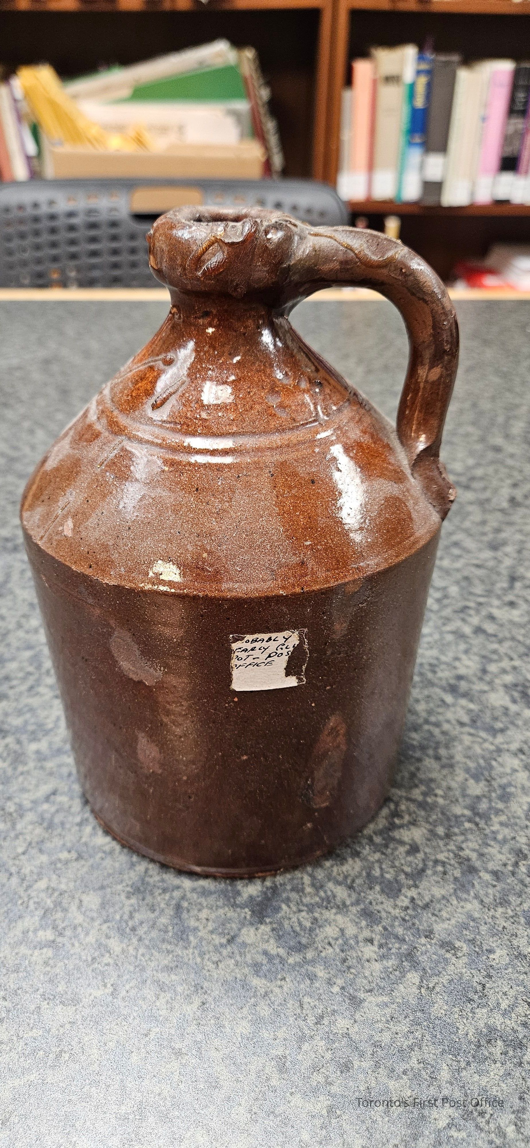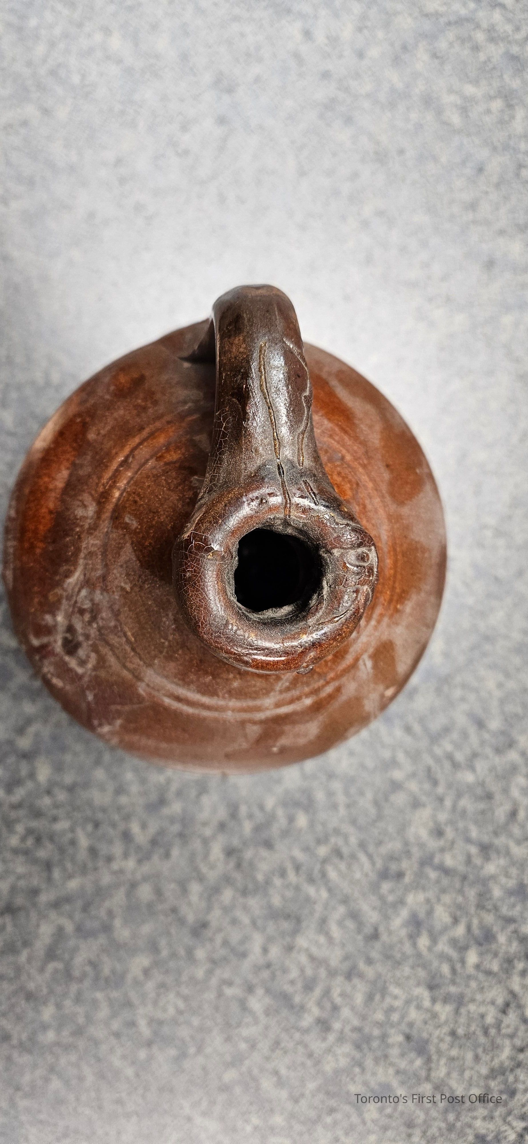 Glue crock; clay/pottery/earthenware; tapered toward base; handle from just below pouring spout to lip of neck; dark brown glaze; circa 1840.Dimensions