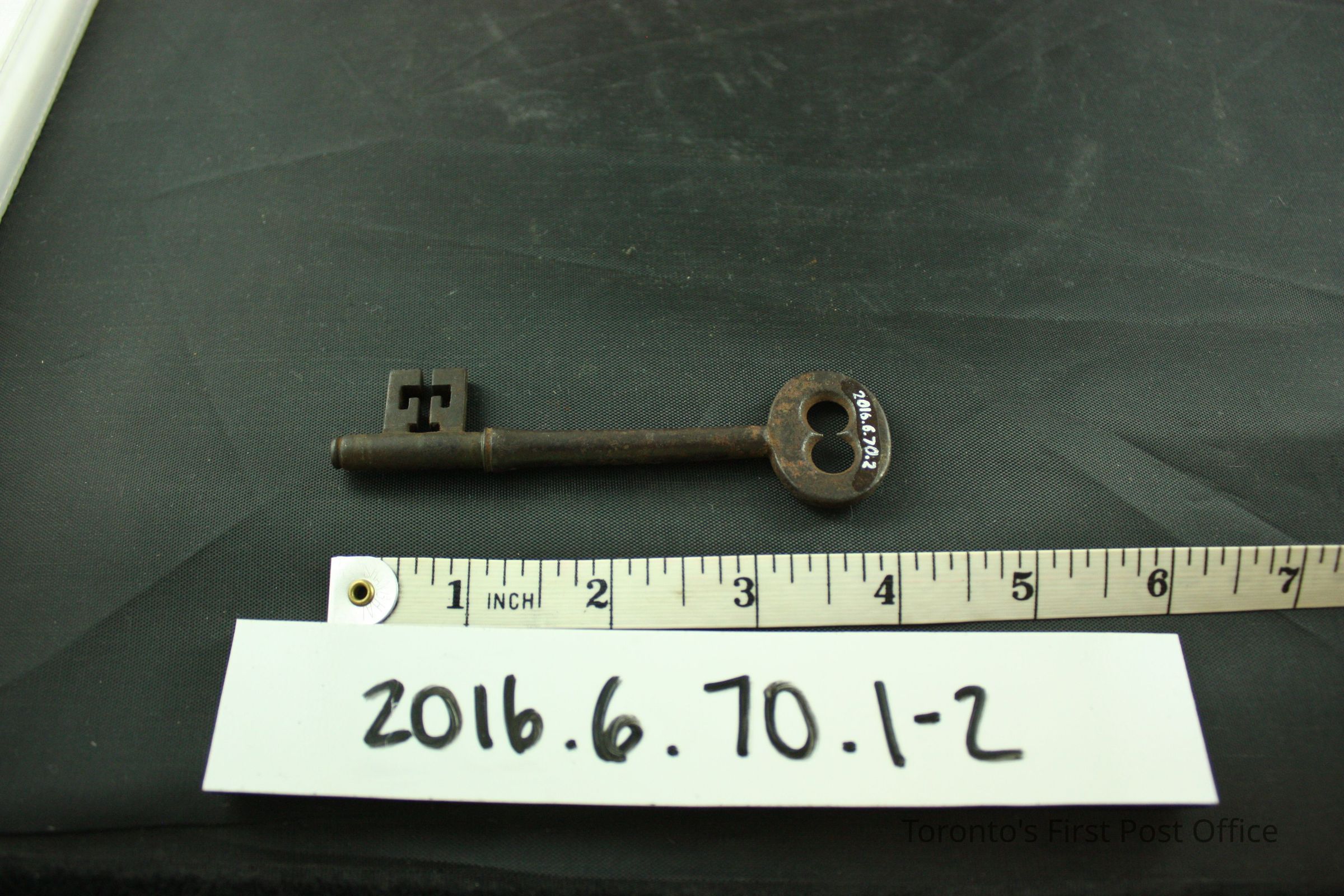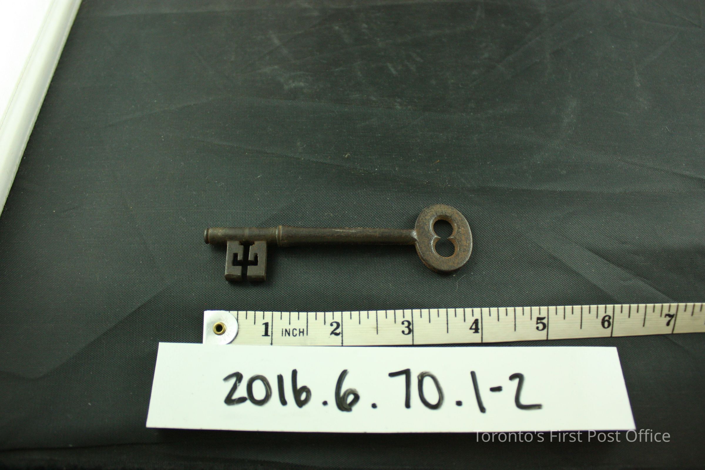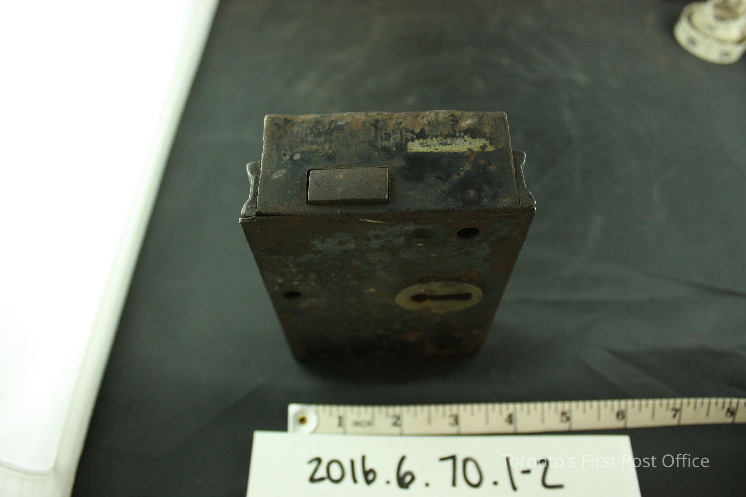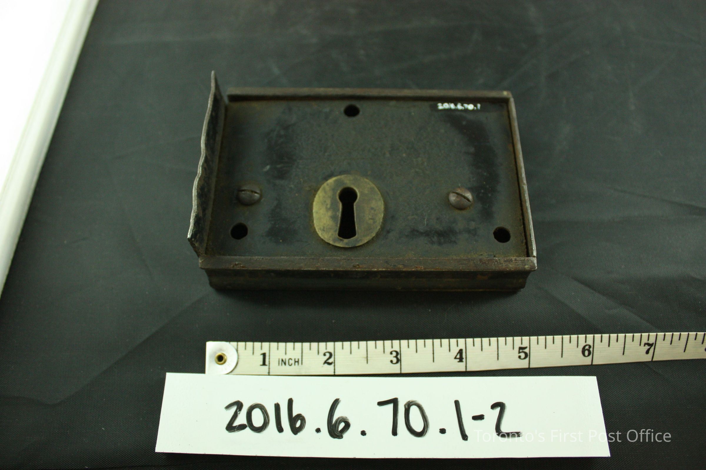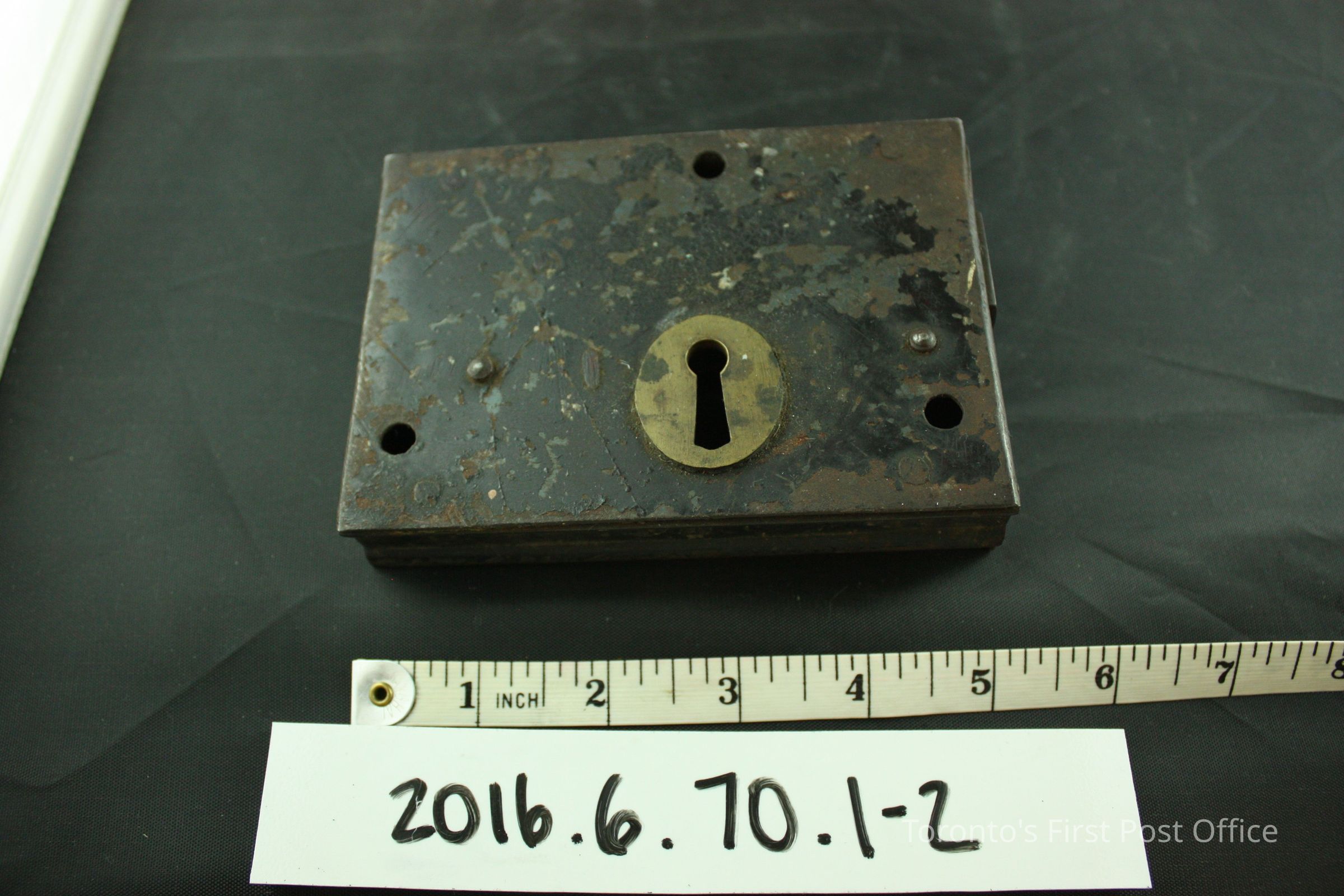 Steel surface mounted deadbolt rim lock with brass keyhole, steel key, no keyhole cover. In working order, the bolt extends to the proper right side as it is locked. Originally black in colour, flakes of paint are still visible, especially on the reverse side of the body. The rectangular body features three (3) rivet holes and two (2) screws. A plate of metal is welded onto the proper right side of the lock. The bow of the key features two (2) partial circles that form a larger hole.Dimensions