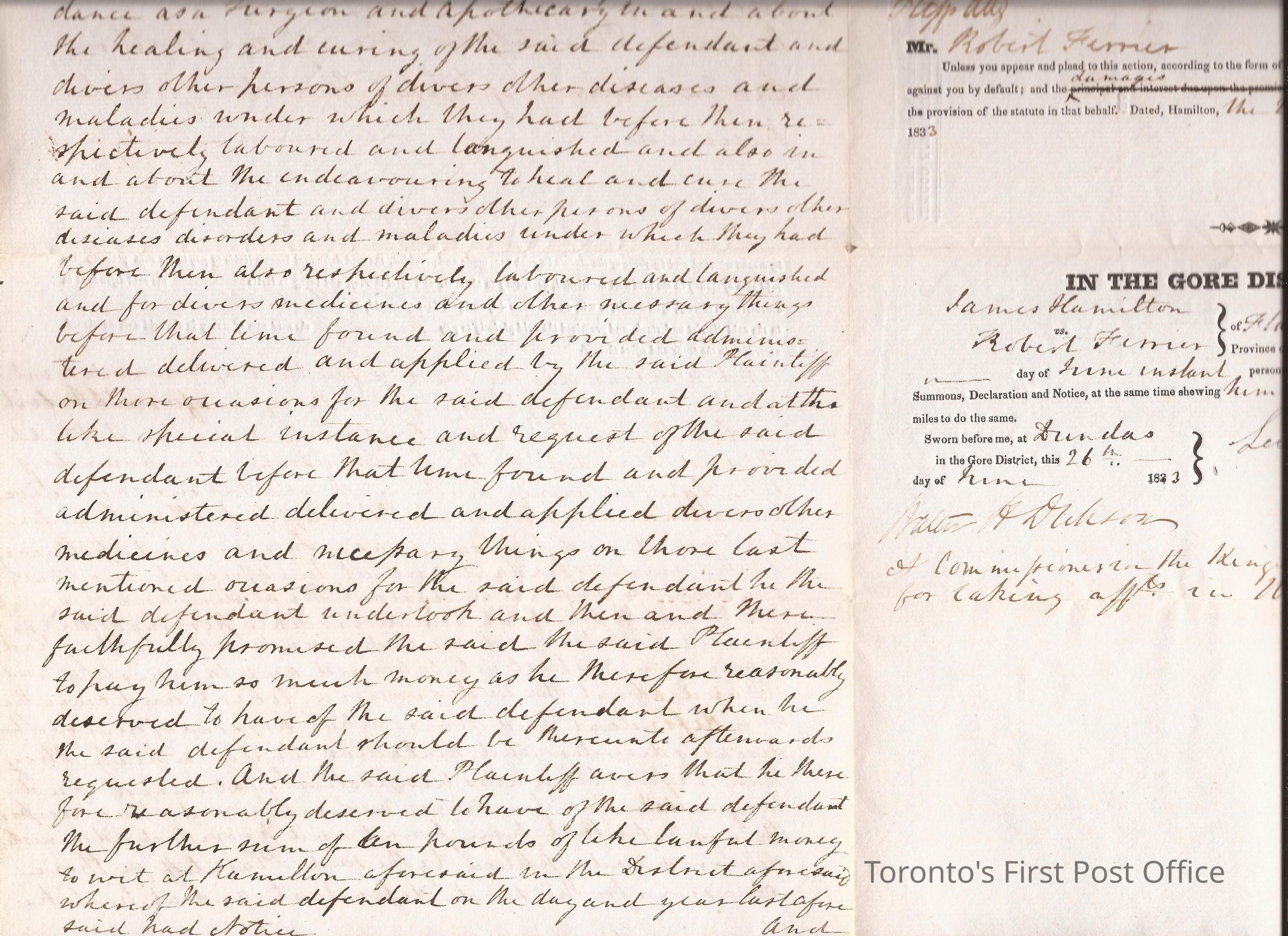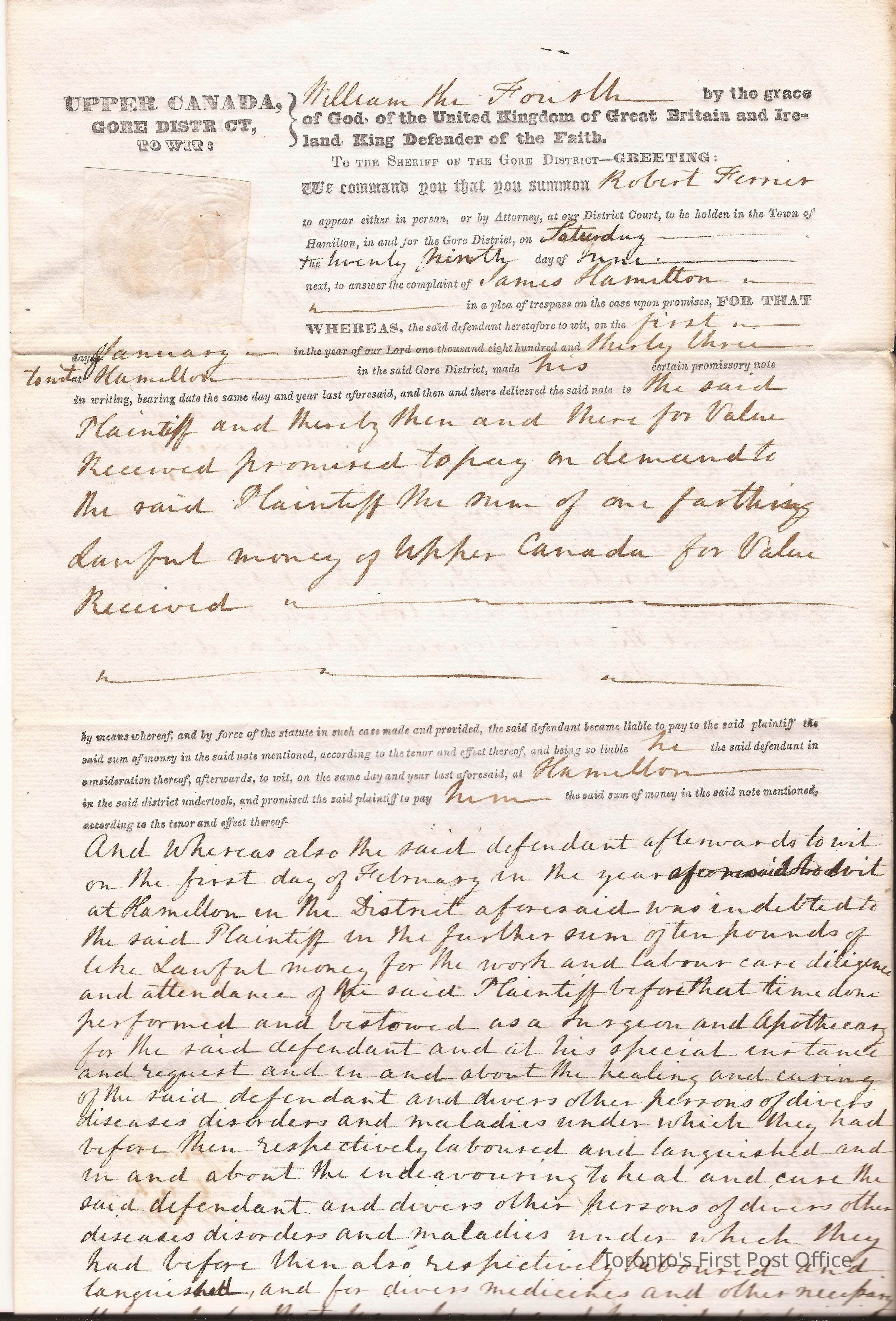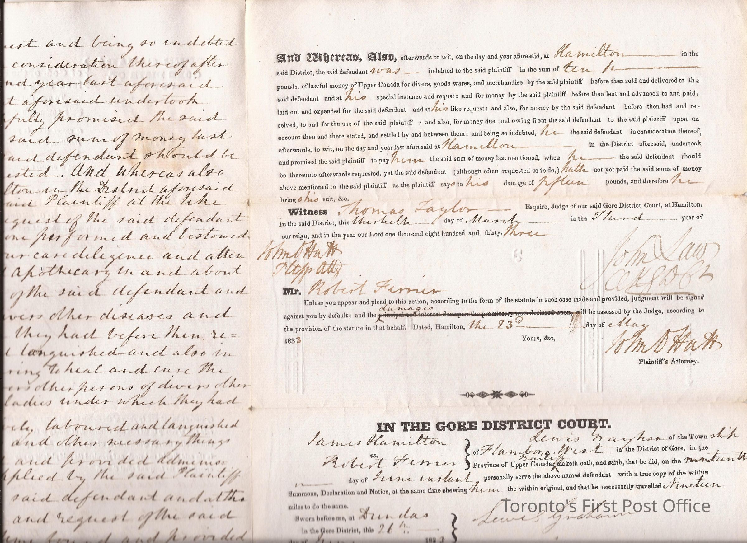 Court document/declaration; print and manuscript; black ink; dated Gore District, Hamilton, 29 June 1823; re: James Hamilton vs. Robert Ferrier and fees owing for medical services; signed by Lewis Graham, clerk; affidavit taken by Walter(?) A. Dickson; also signed by John D. Hatt, Plaintiff's Attorney; wafer seal at top left corner covered with paper.Dimensions