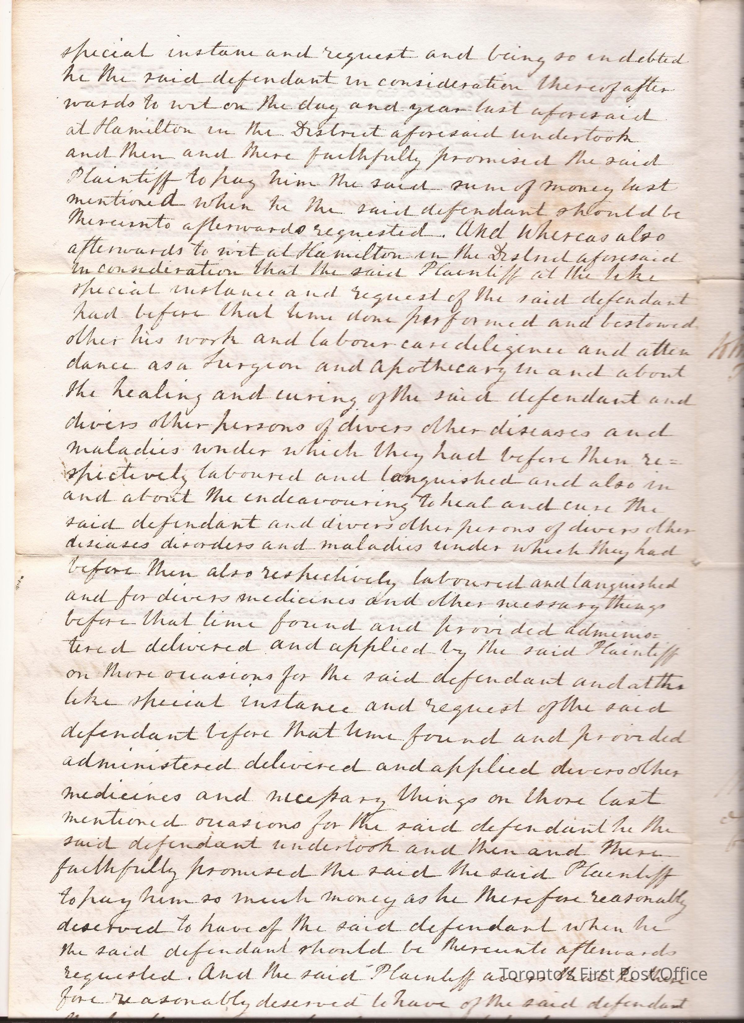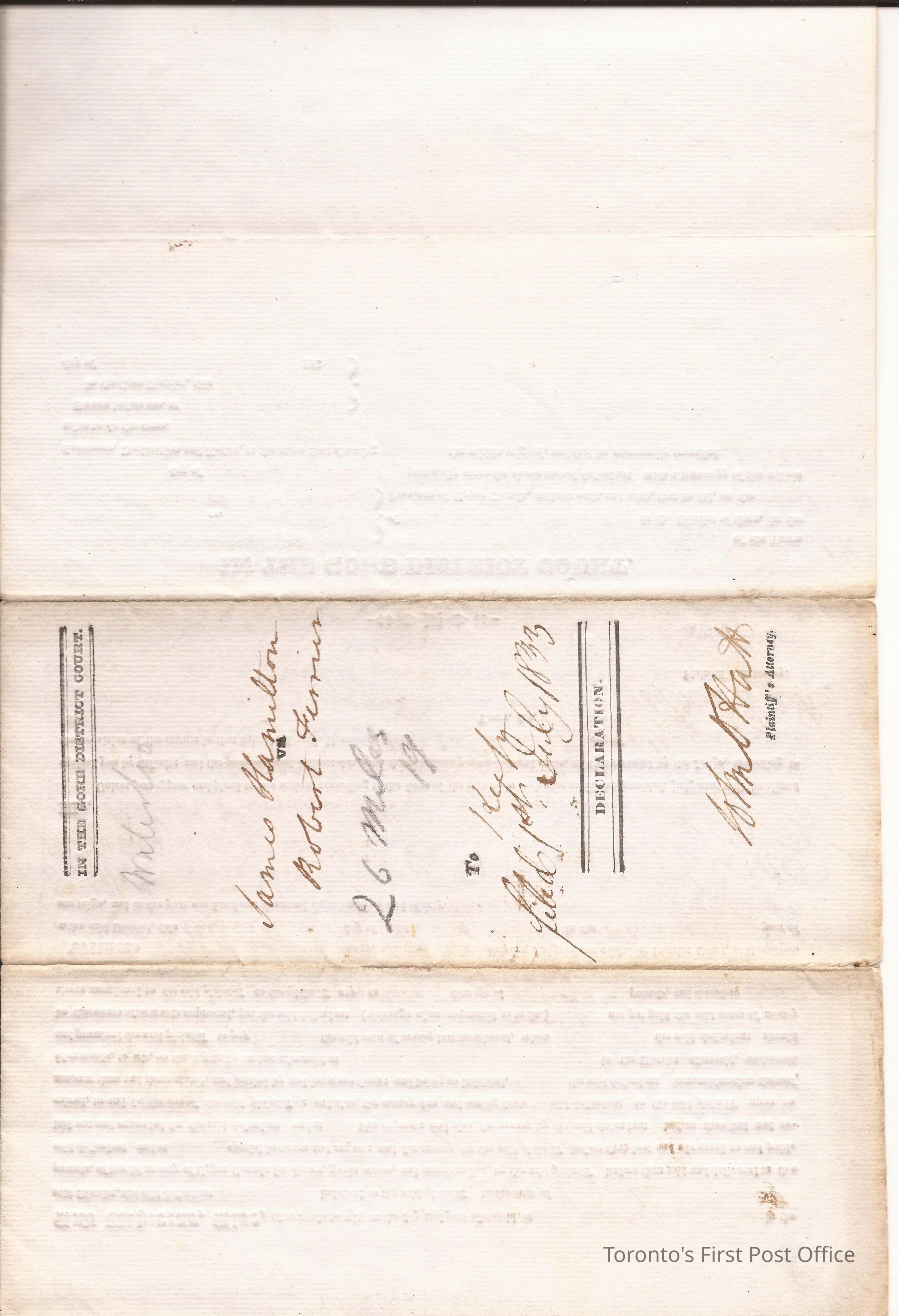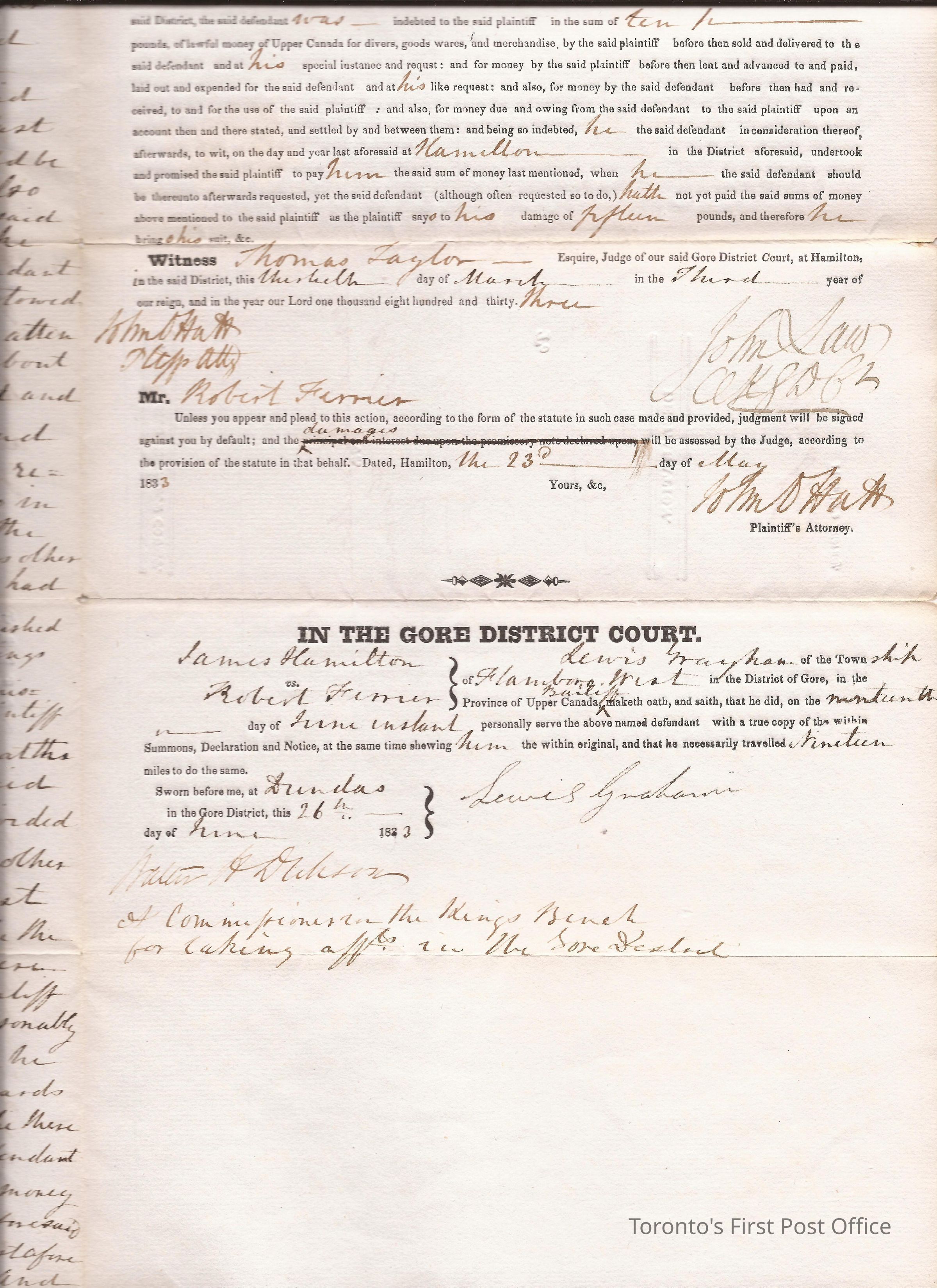 Court document/declaration; print and manuscript; black ink; dated Gore District, Hamilton, 29 June 1823; re: James Hamilton vs. Robert Ferrier and fees owing for medical services; signed by Lewis Graham, clerk; affidavit taken by Walter(?) A. Dickson; also signed by John D. Hatt, Plaintiff's Attorney; wafer seal at top left corner covered with paper.Dimensions