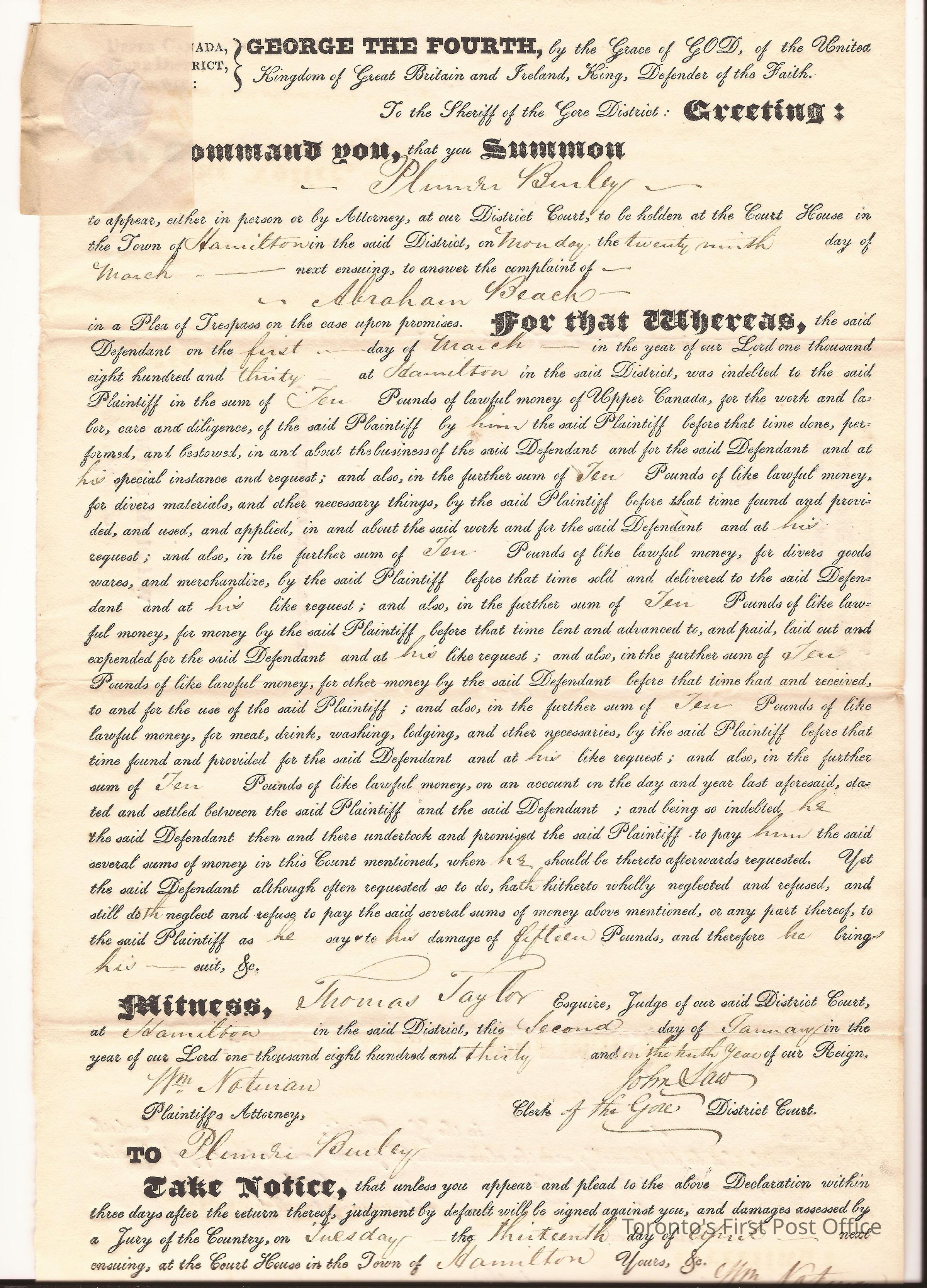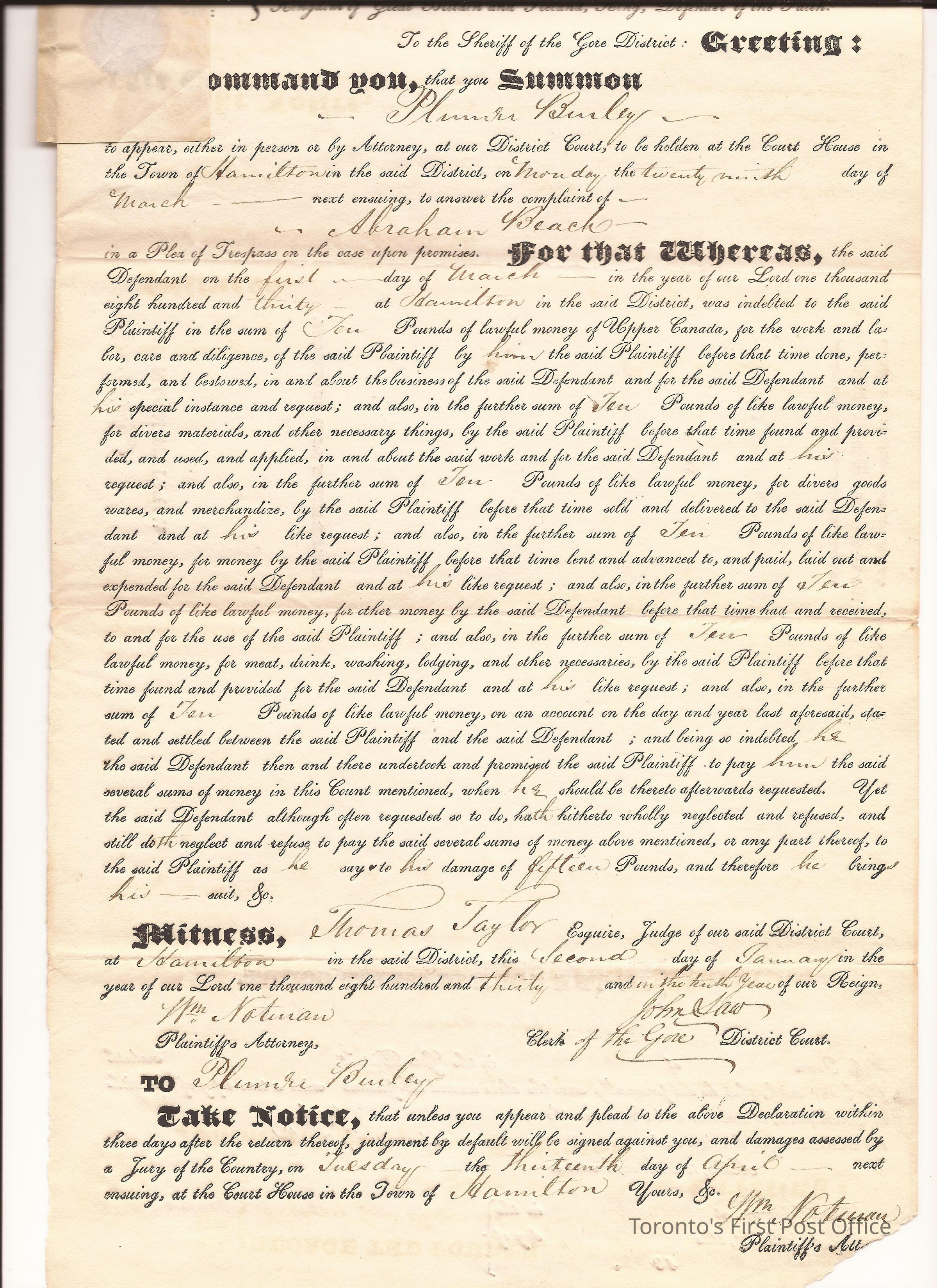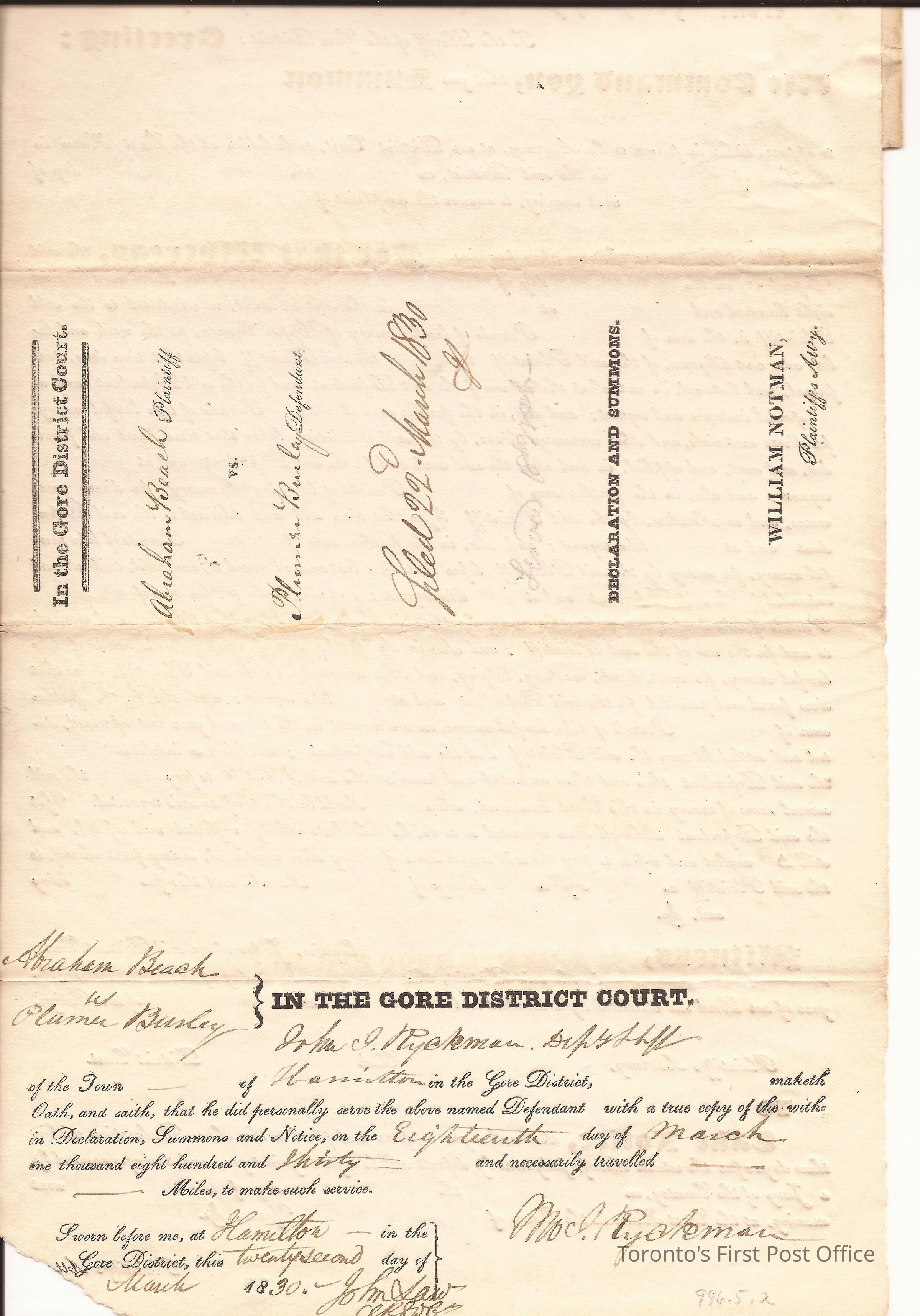 Declaration and summons; print and manuscript; re: Abraham Beach Plaintiff vs. Plume Burley Defendant; re. Burley's refusal to pay £60 plus expenses for work done; affidavit taken by Mr. J Ryckman John Saw Clk GWC; signed by Wm Notman Plaintiff's Attorney; dated 29th March 1830.Update Date