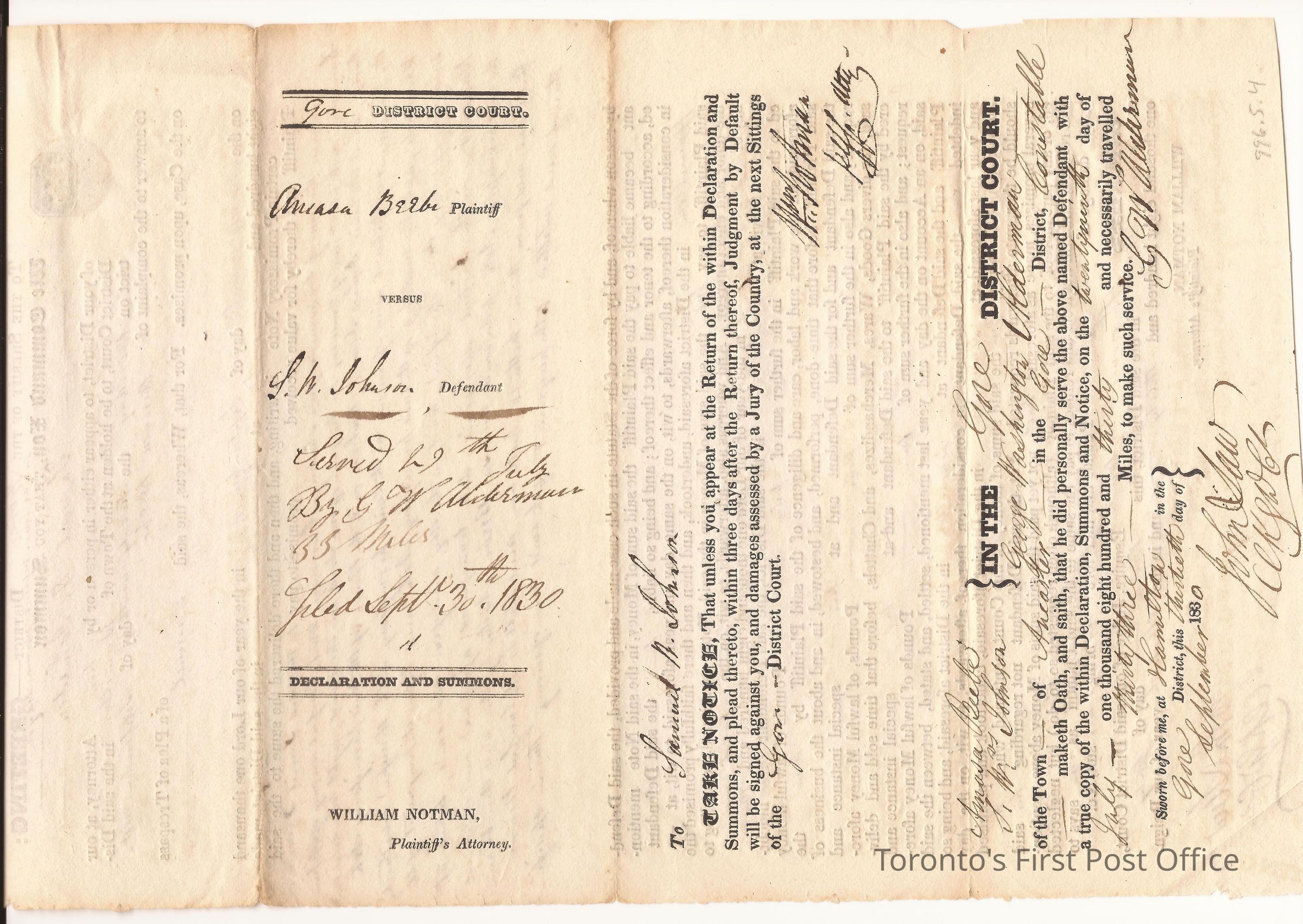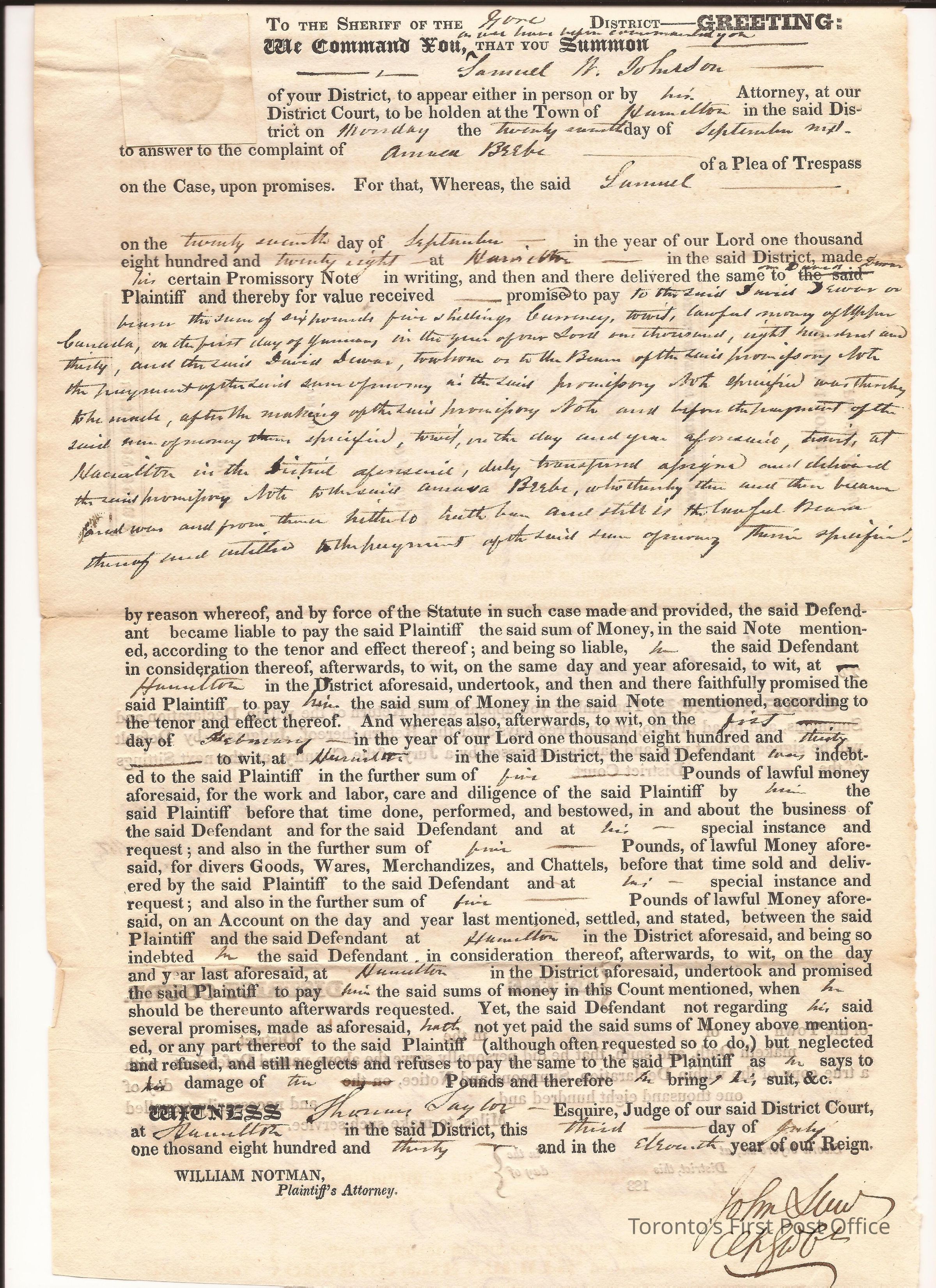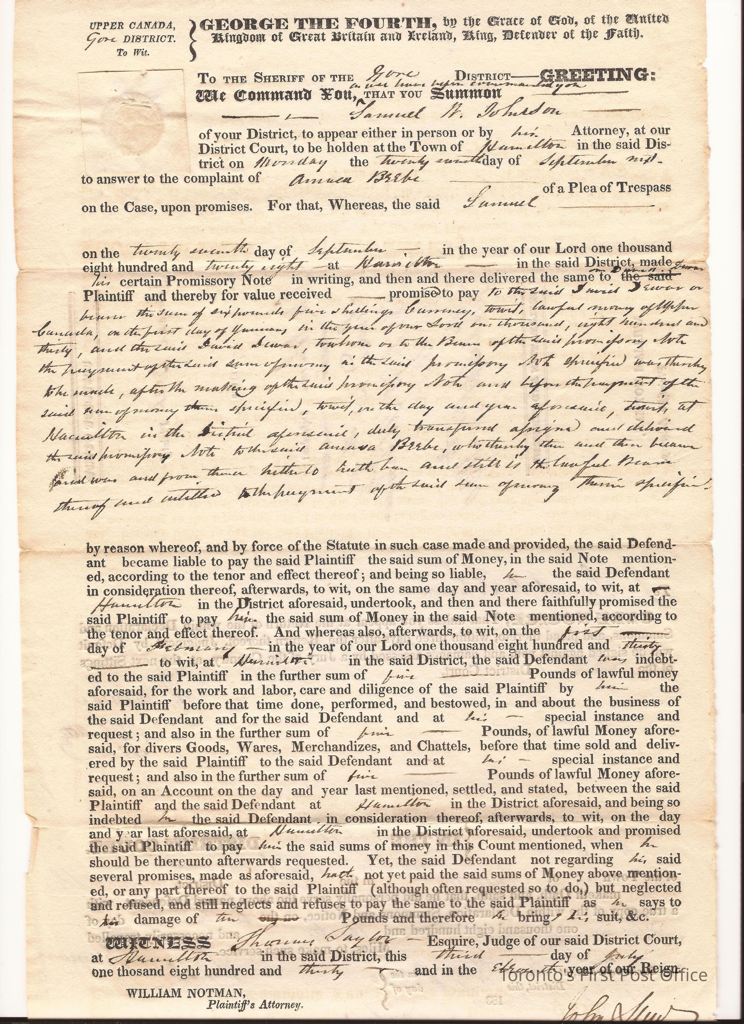 Declaration and summons; originating from William Notman, Plaintiff's Attorney; signed by John Saw, Clk GW Ct; affidavit taken by G.W. Waterman; also signed by Wm. Notman; re: money owed to A. Bebe totaling £15 for work and expenses; dated Gore District, Hamilton, 27 Sept 1828; print and manuscript; black ink.Dimensions