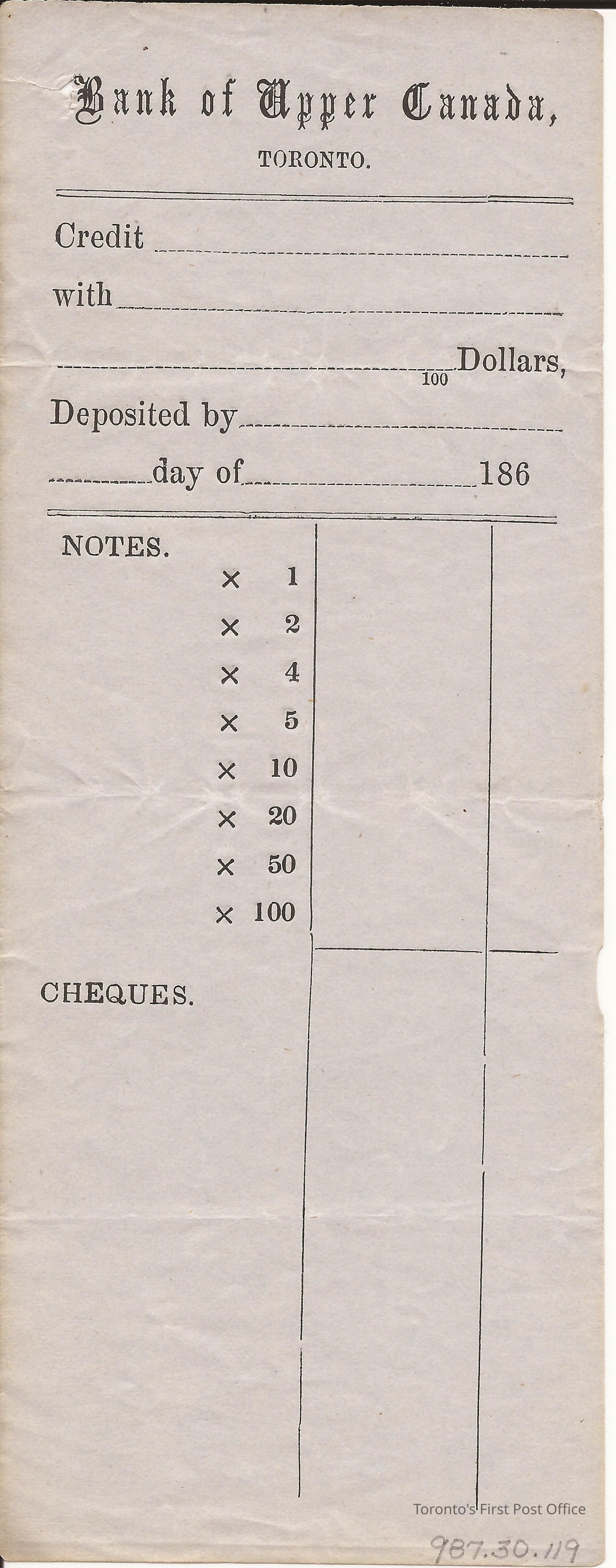 Deposit slip; blank printed form; Bank of Upper Canada; divided into: 1. notes, 2. cheques; light grey paper.
