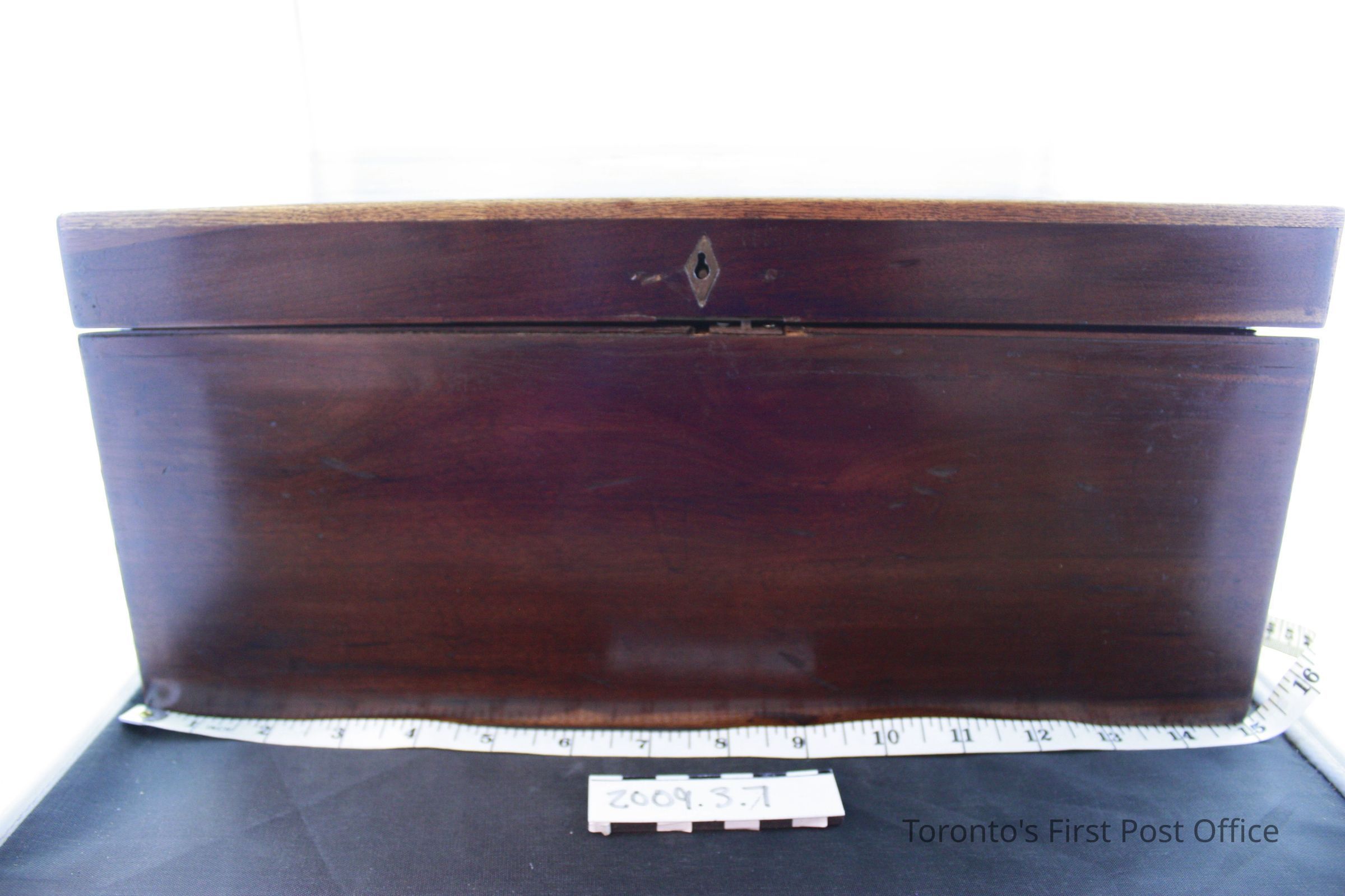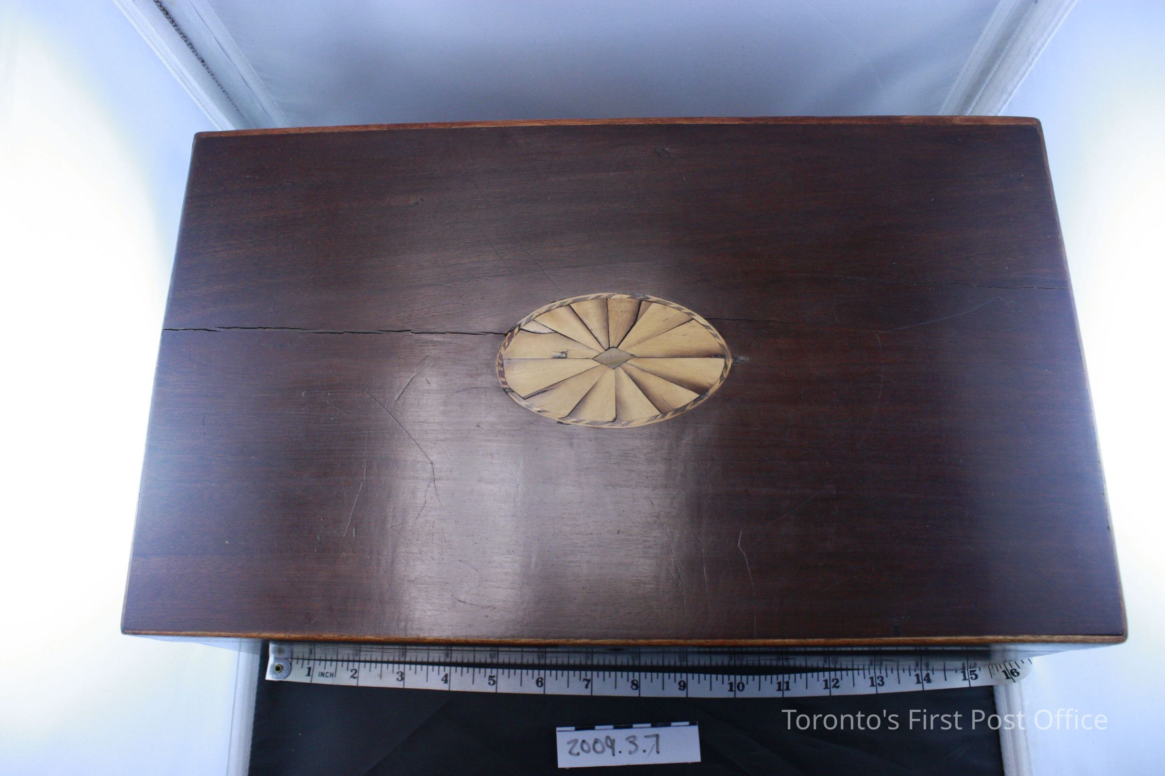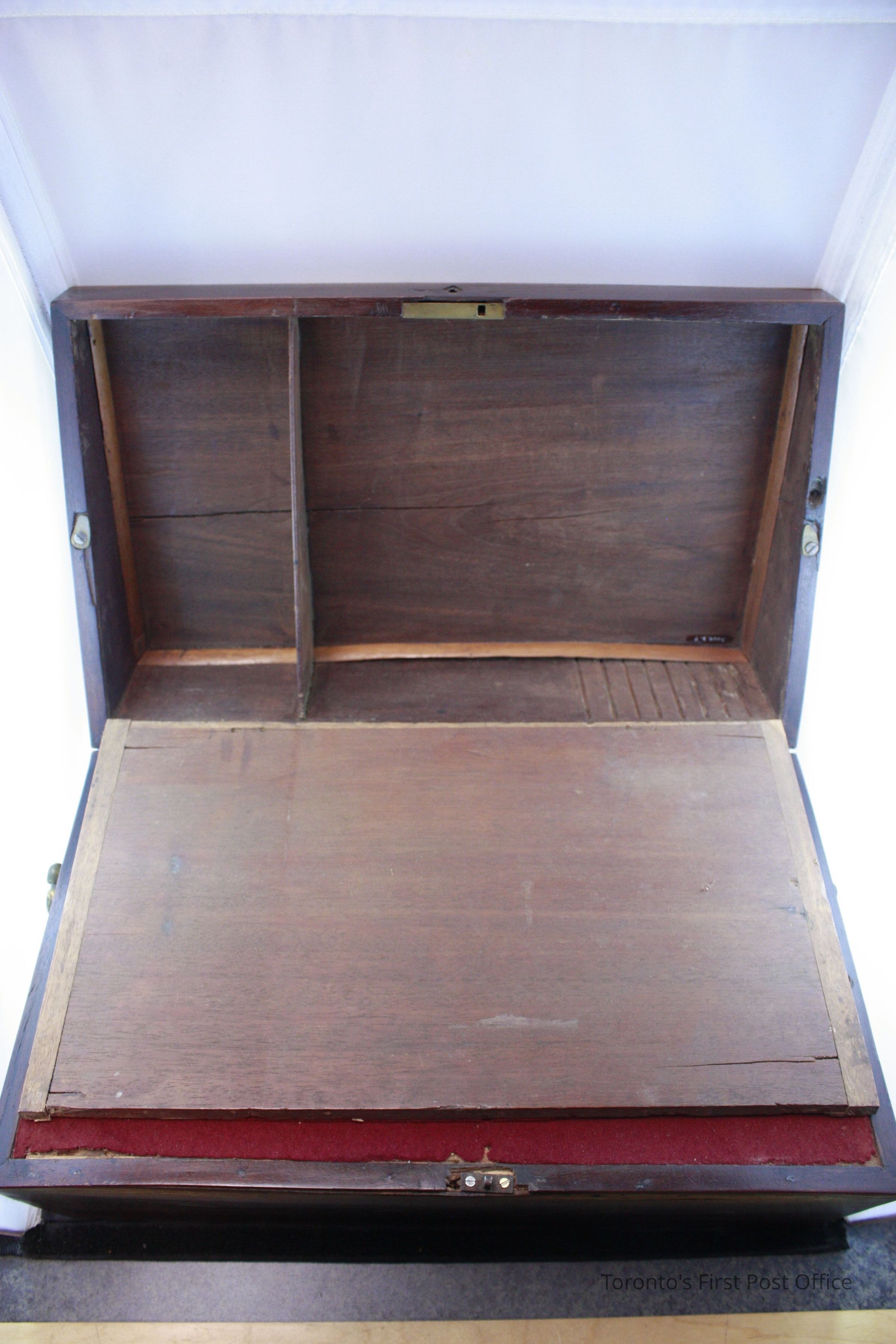 Lap desk; rosewood; sunburst inlaid marquetry on top; small diamond-shaped brass faceplate; single post lock; two handles - one one either side; full-length drawer (post lock missing) on one side with false bottom; interior writing surface is replacement red felt; two brass hinges; storage compartment divided in two under lower writing surface; c. 1850-1870.Dimensions