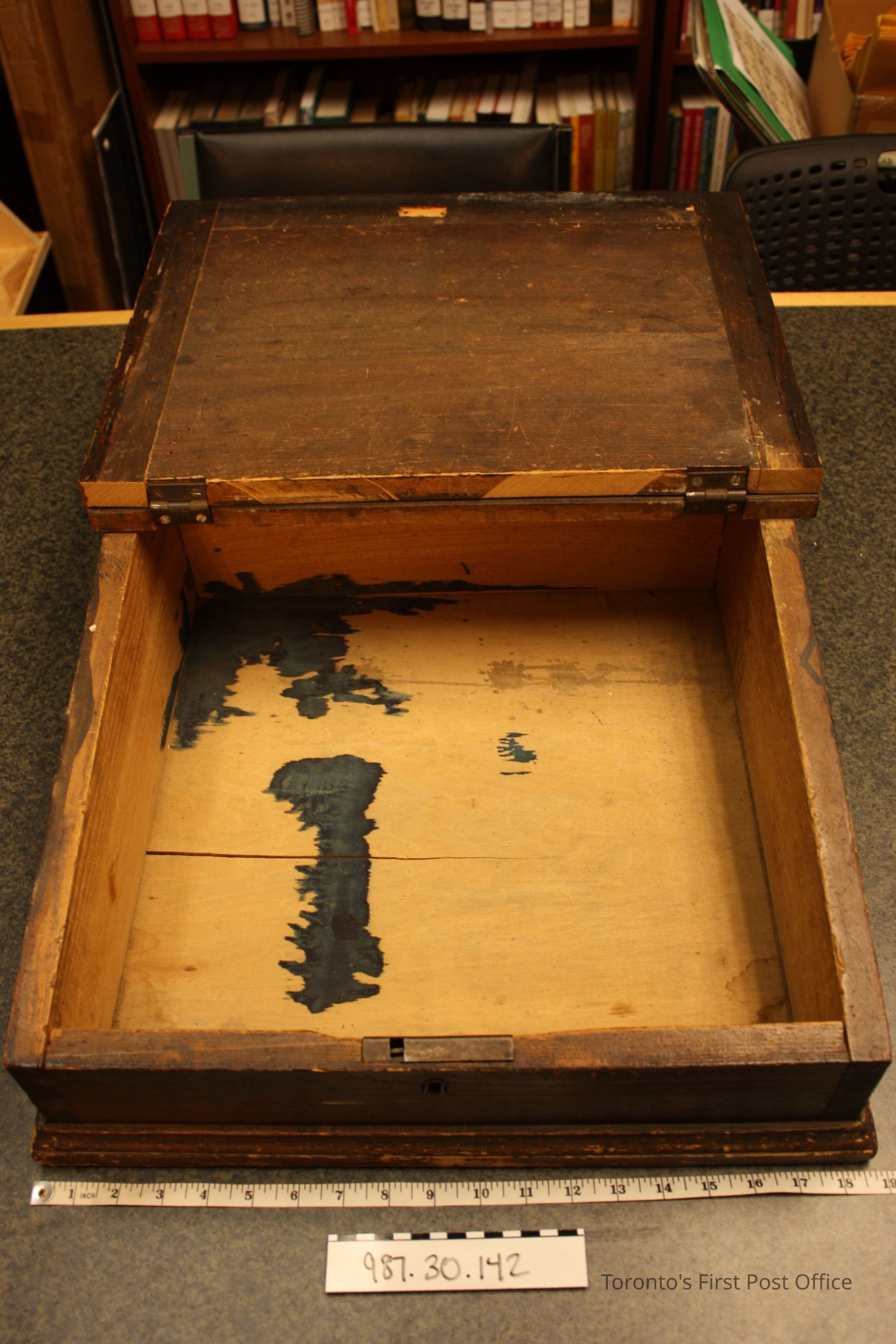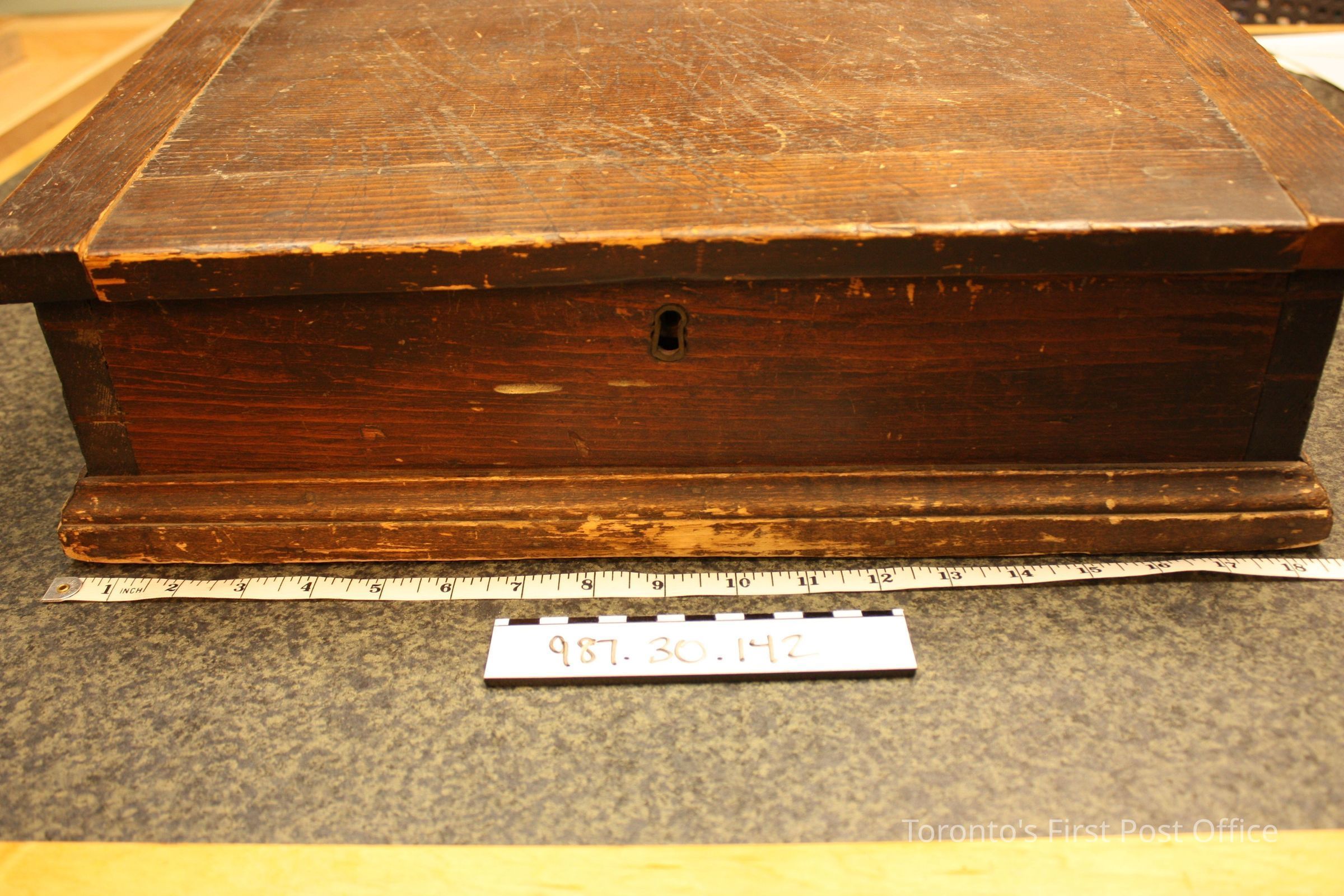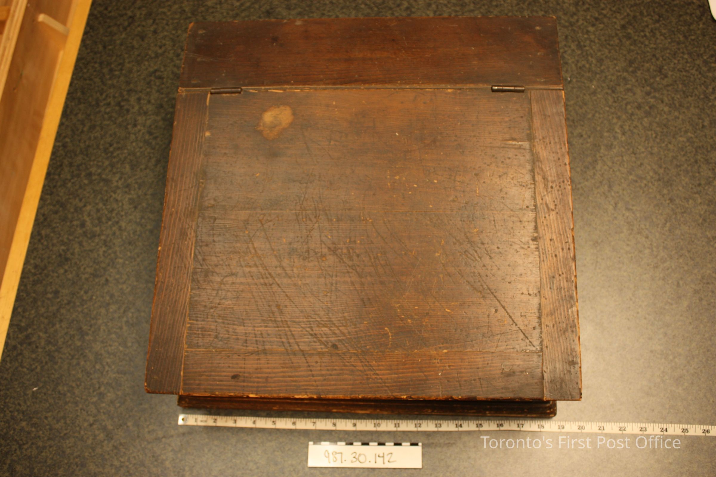 Lap or table top desk; pine; slanted; top is hinged; dovetailed construction; stained dark brown; circa post 1850.Dimensions