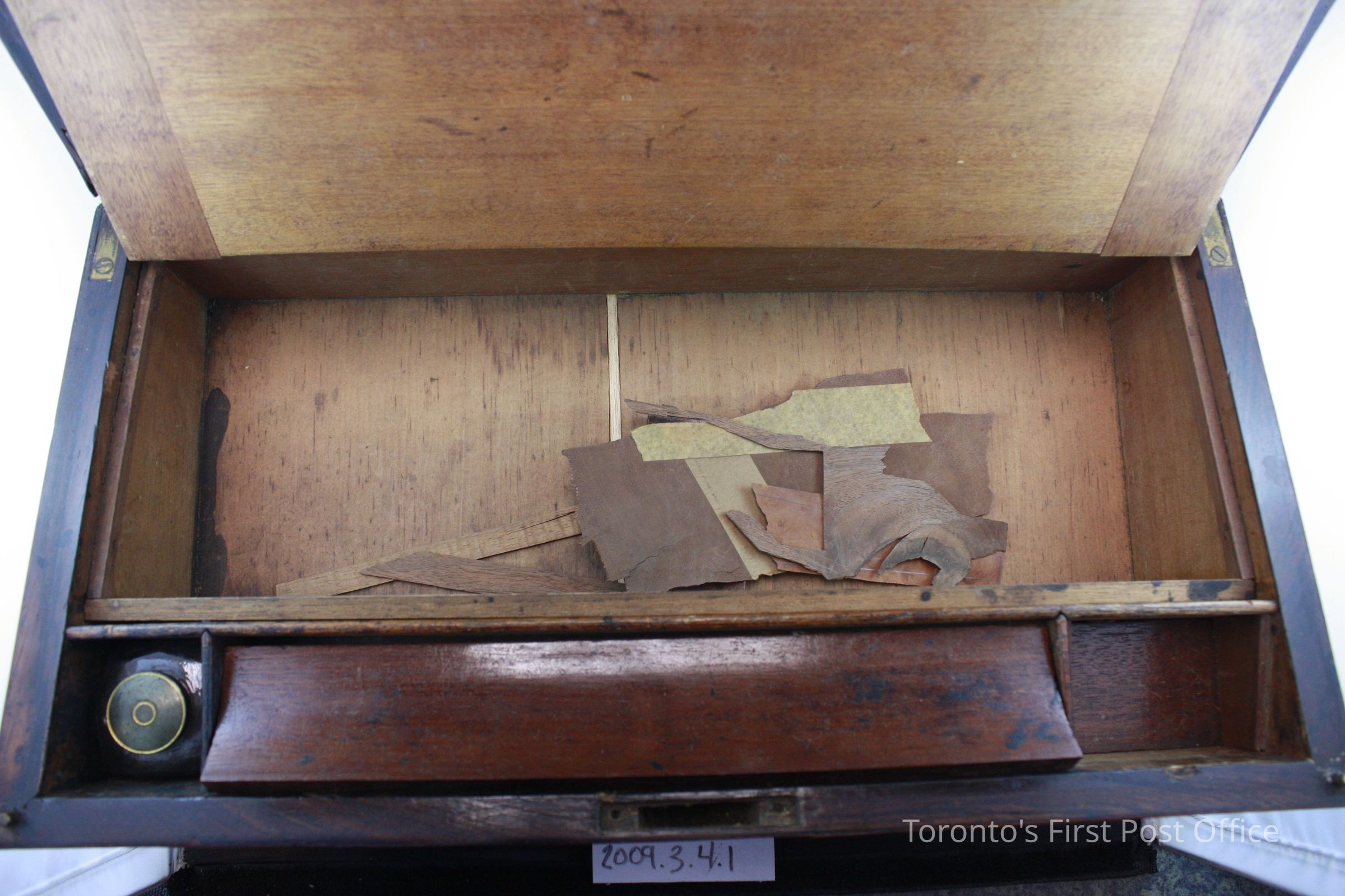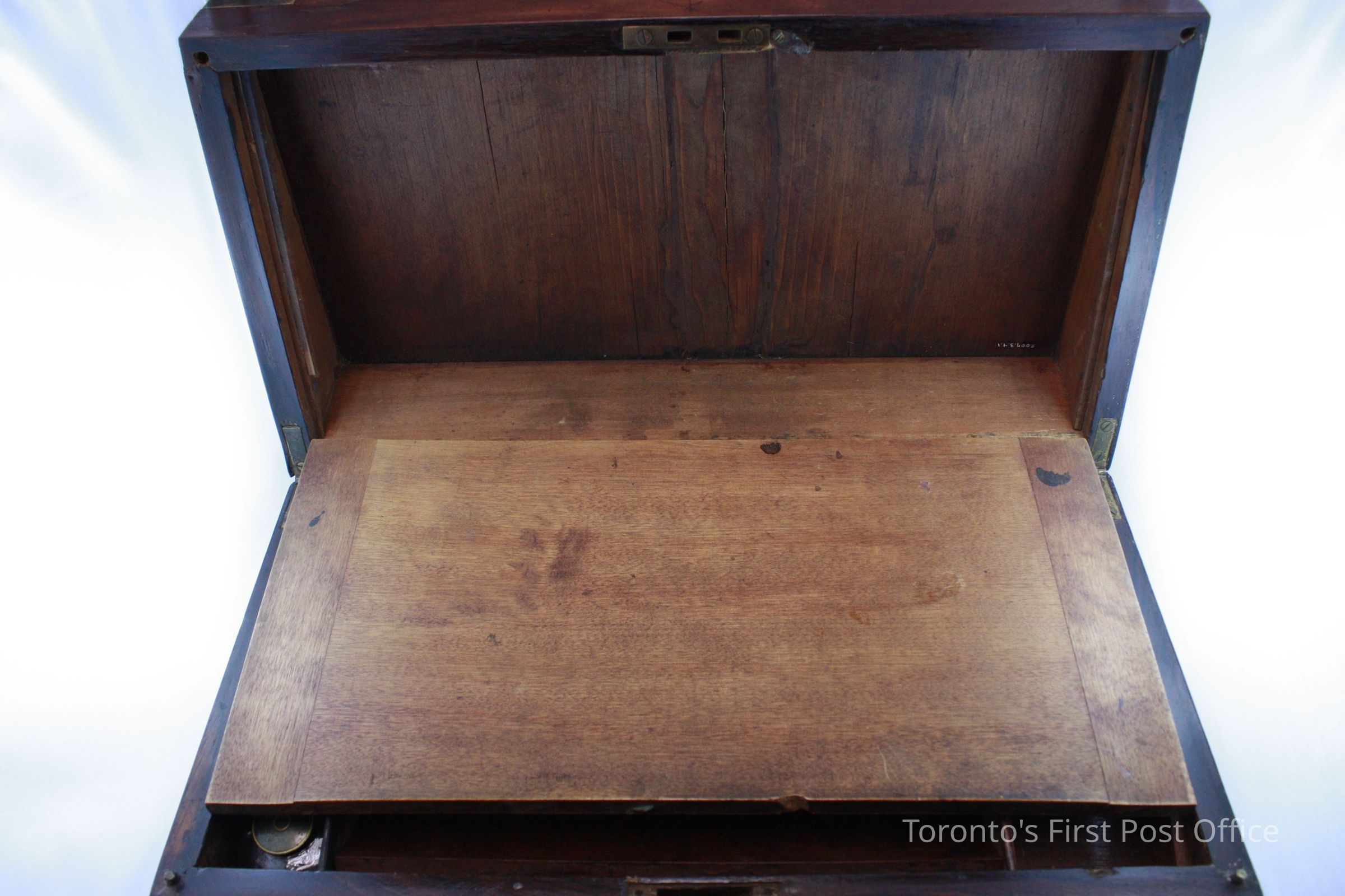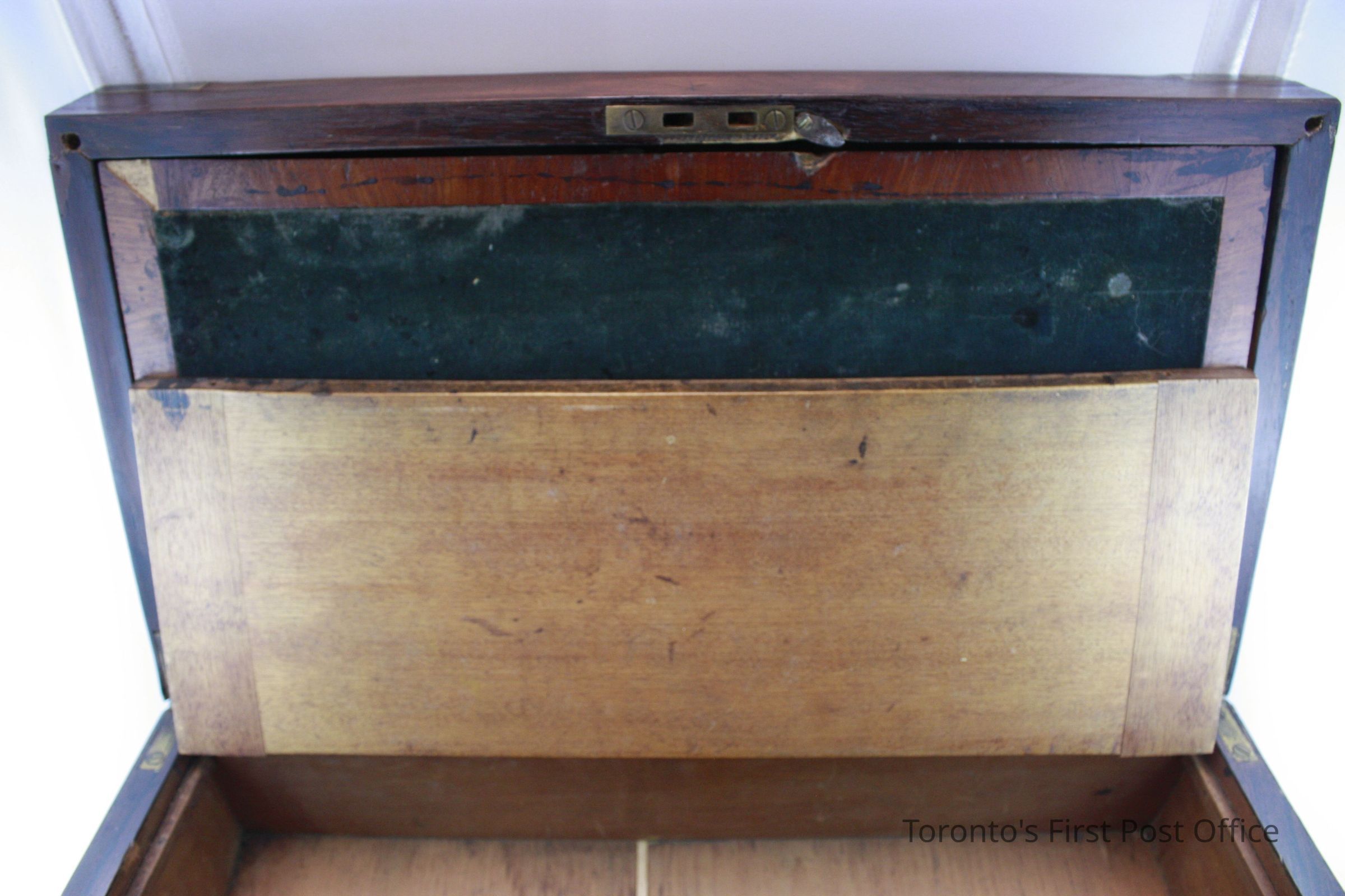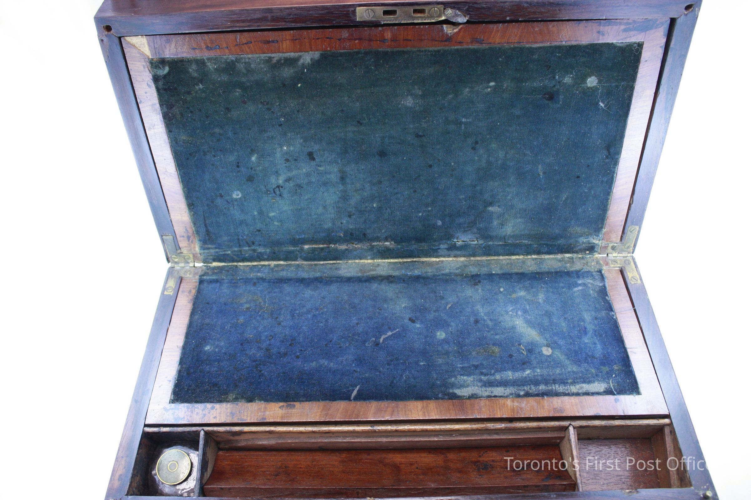 Lap desk; mahogany veneer; four brass corners; brass faceplate; no lock; two brass hinges; green woven material glued onto bottom; interior writing surface is slanted and covered in blue velvet; two storage compartments under each half of the writing surface; three compartments at top of writing surface; two include wooden pen troughs which are concave on one side; third compartment includes a non-original glass inkwell with loose brass cap; circa 1850.Dimensions
