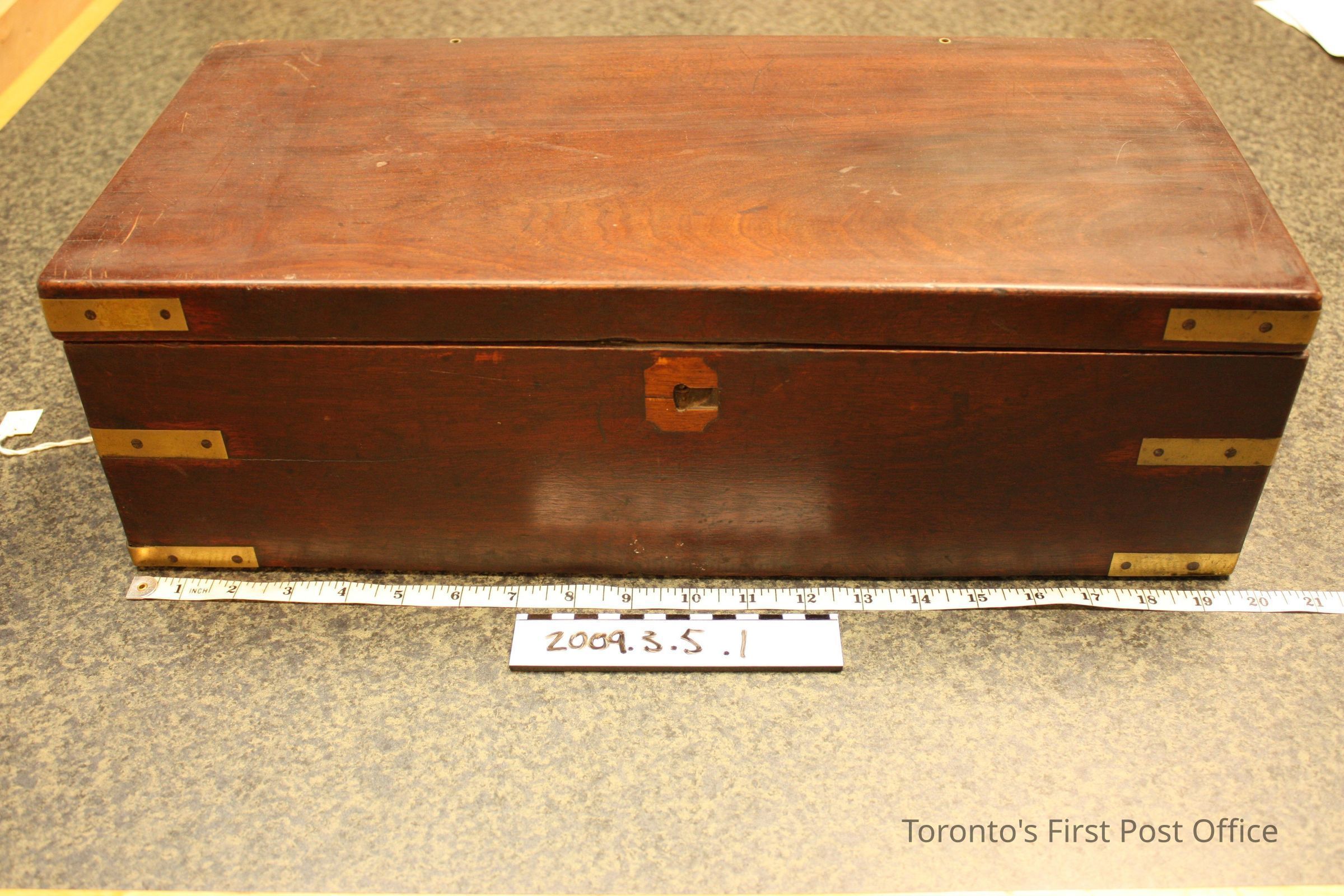 Lap desk; wooden; twelve brass straps at all corners and at hinges; two brass hinges; faceplate missing; interior writing surface is dark navy blue velvet; two storage compartments under each half of slanted writing surface; four compartments at top of writing surface; one compartment includes a pen trough, concave on one side; one compartment includes a glass inkwell with screw-on brass cap; full-length drawer with handle on one side; handle only on other side; interior flip-up brass supporting arm; brass socket for arm also on interior right; c. before 1812.Dimensions