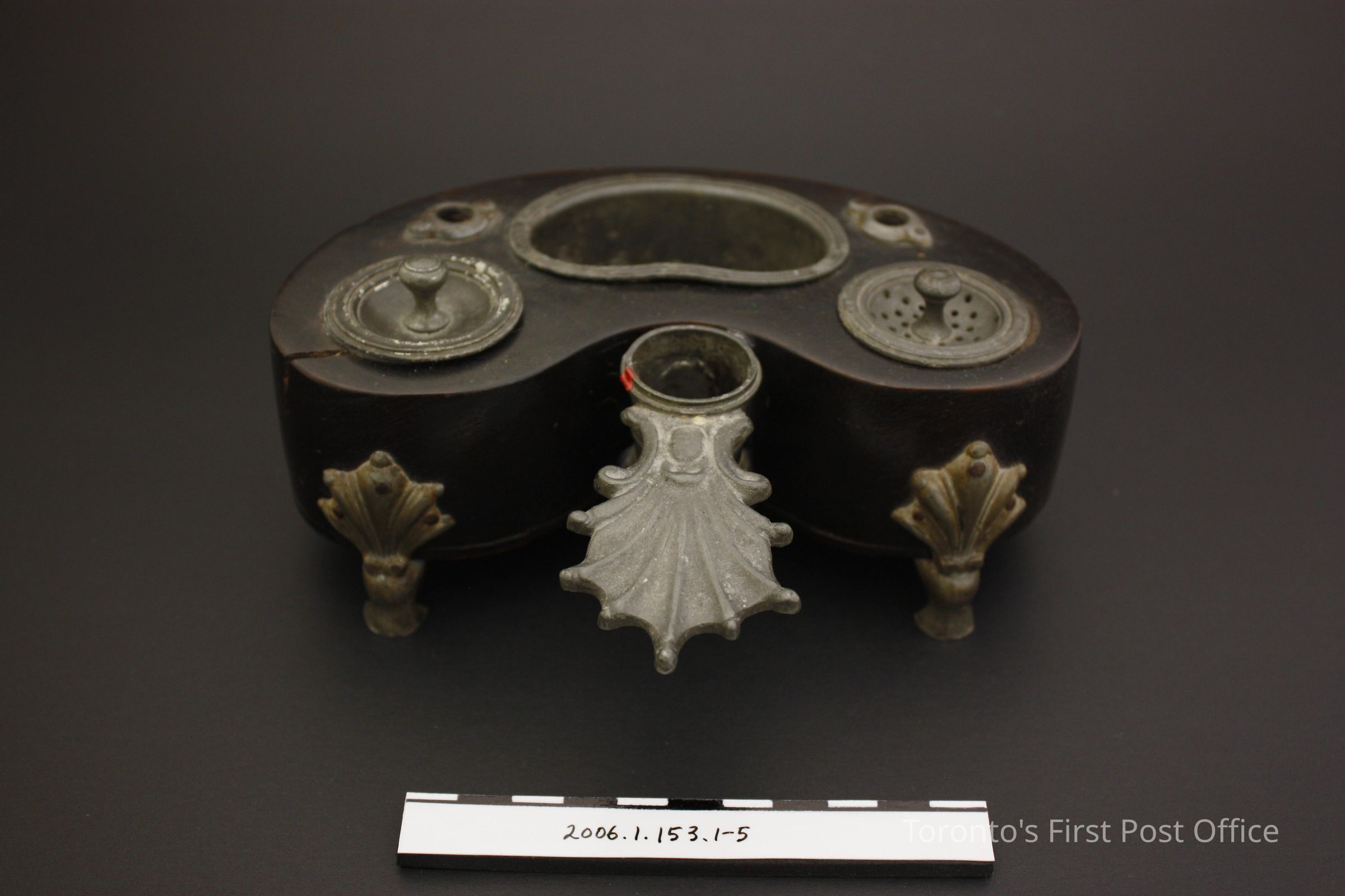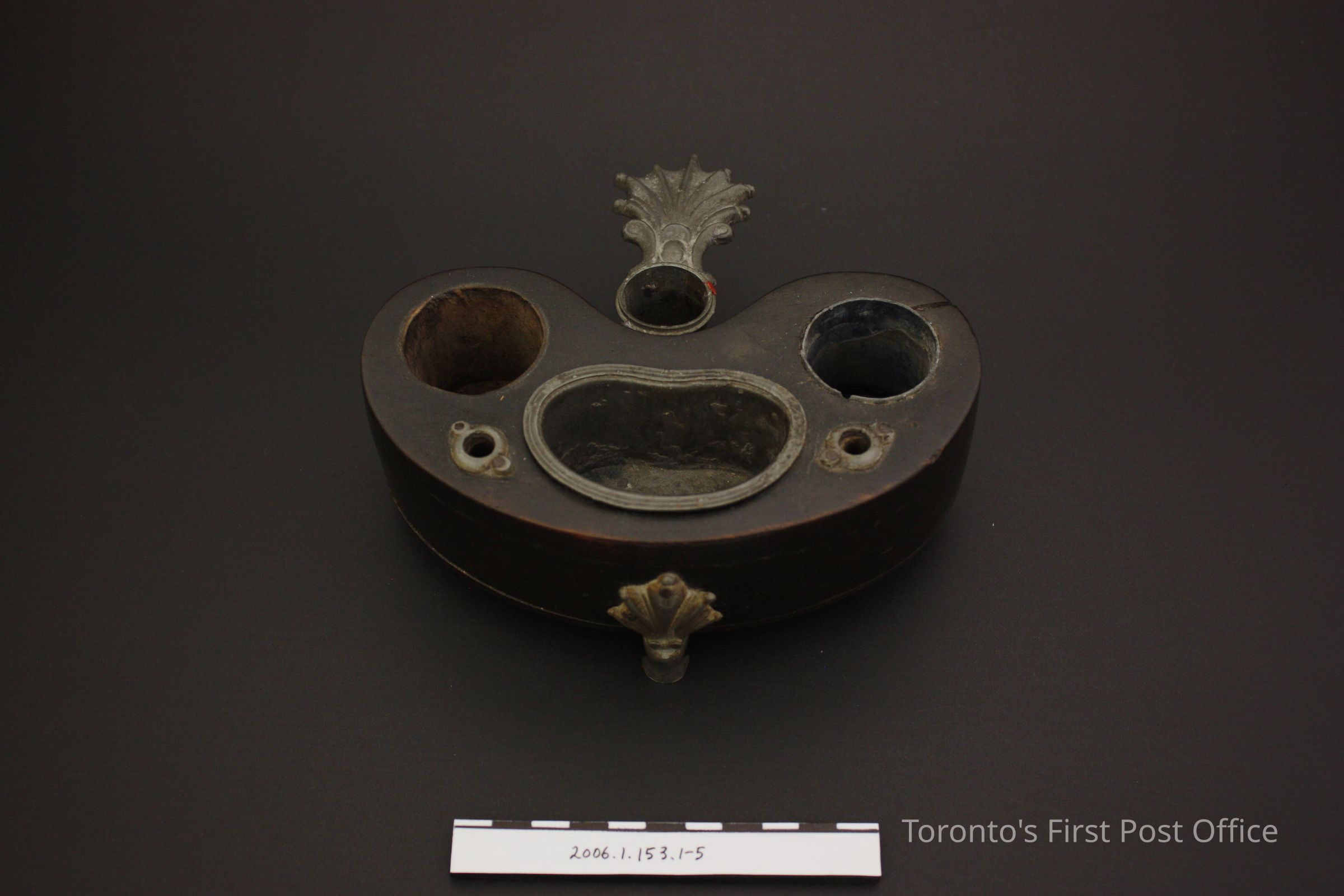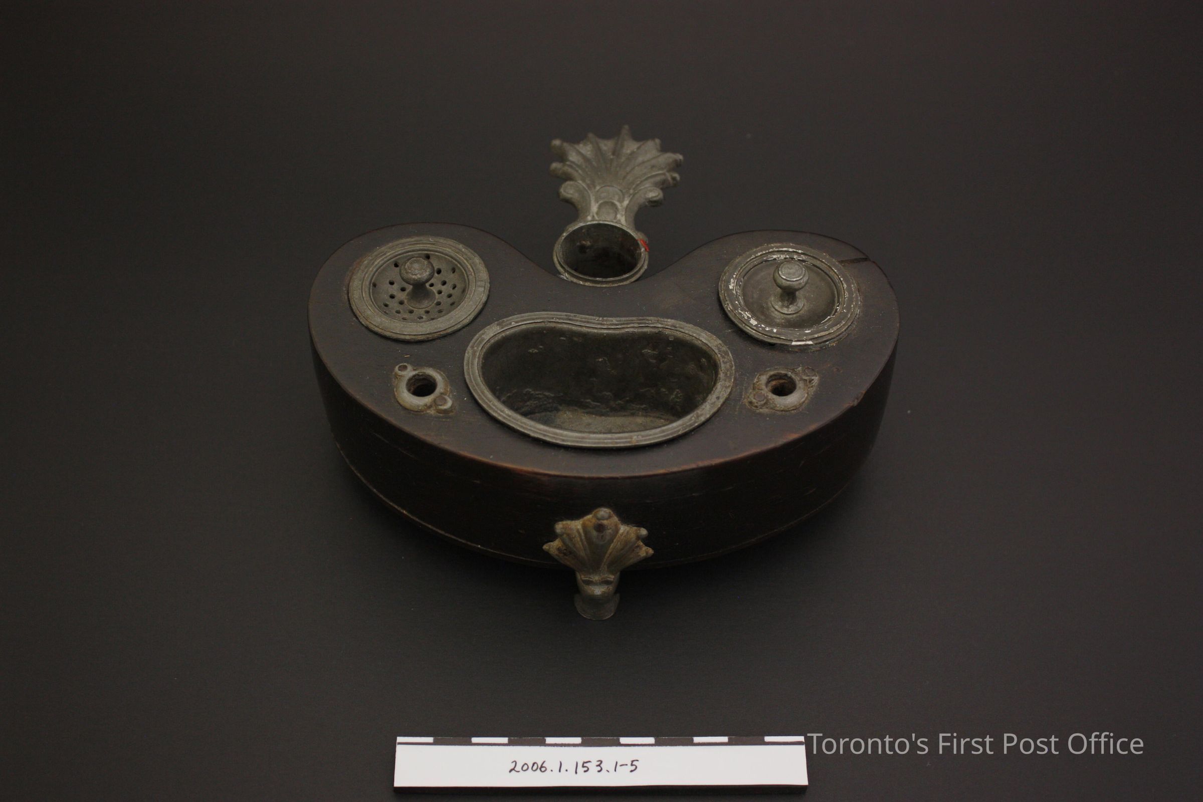 Desk writing set; ebony; kidney-shaped base on three cast pewter feet; ring handle also contains candleholder; five openings in top contain: pewter sander; removeable kidney-shaped pewter-lined container for seals, wax, etc.; glass inkwell and pewter lid; two red-dyed quills; and a purple-black candle; circa 1860-1875; .5, .6, .7 not contemporary.Update Date