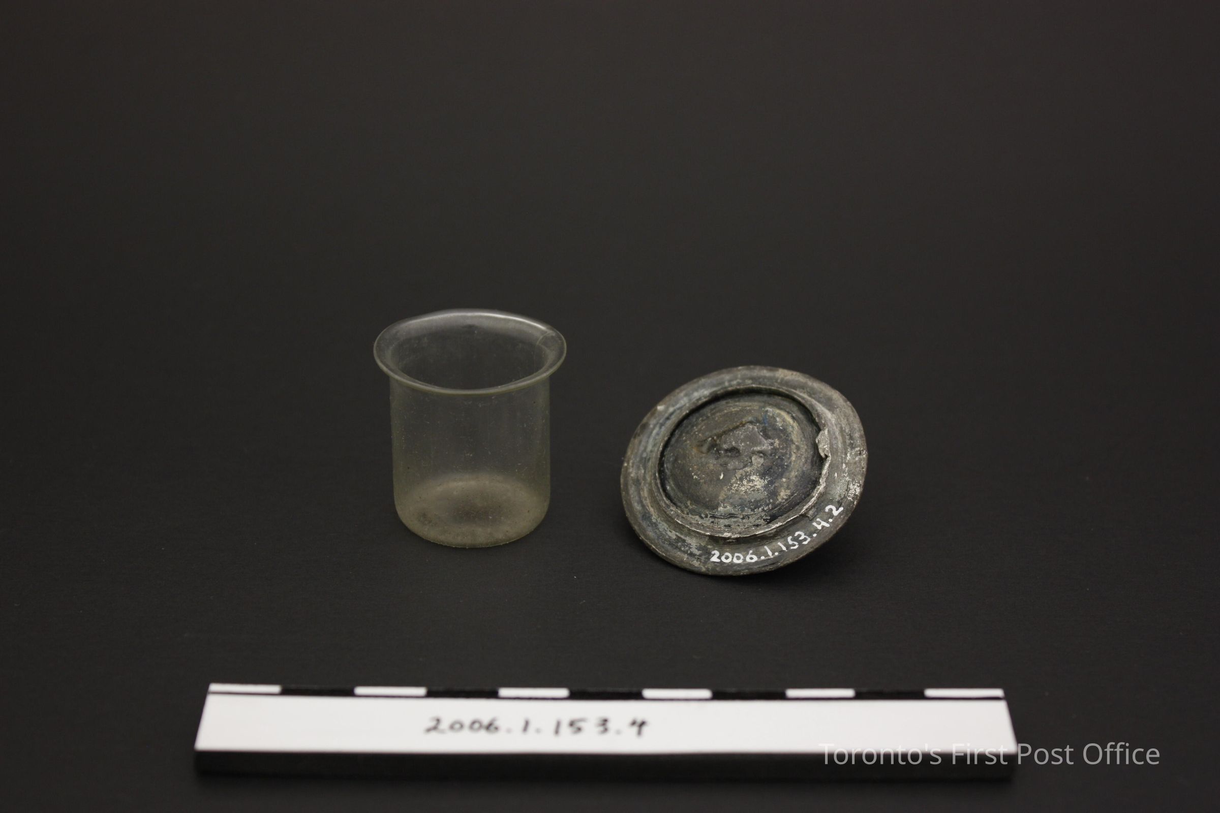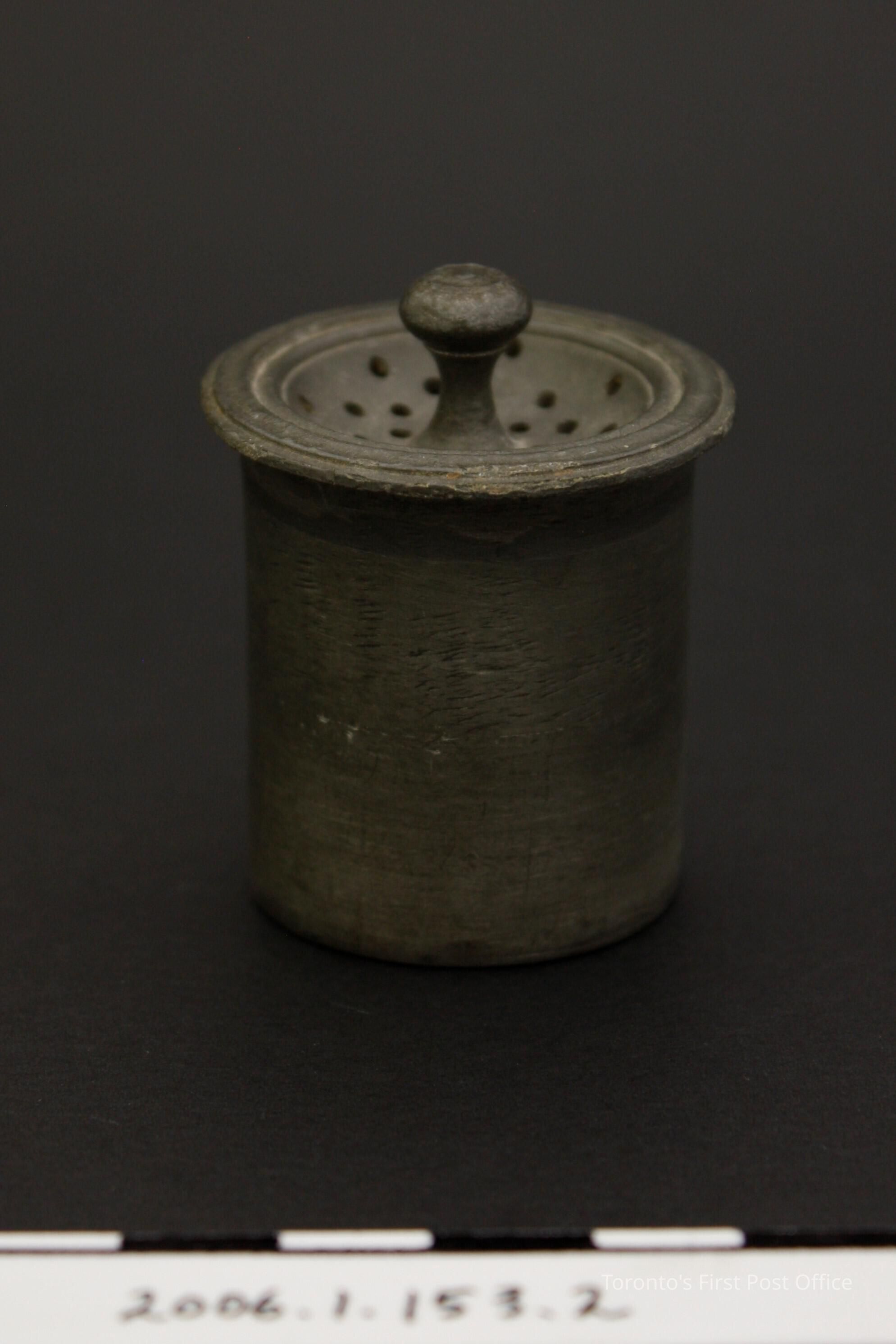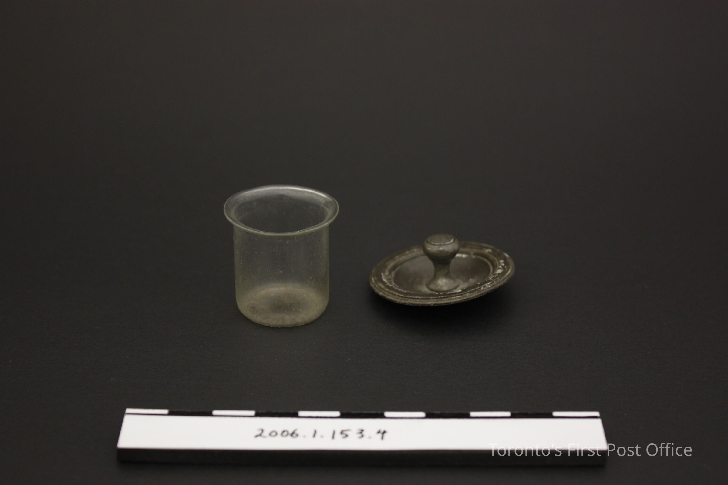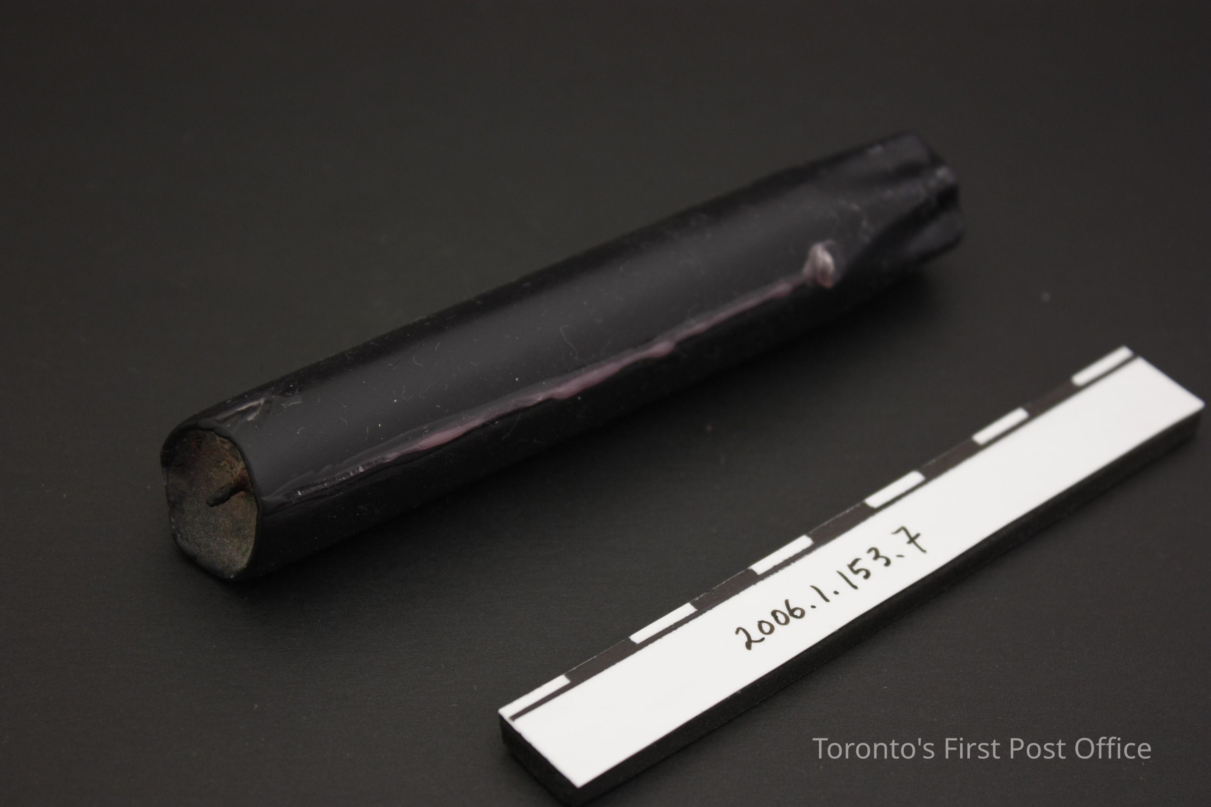 Desk writing set; ebony; kidney-shaped base on three cast pewter feet; ring handle also contains candleholder; five openings in top contain: pewter sander; removeable kidney-shaped pewter-lined container for seals, wax, etc.; glass inkwell and pewter lid; two red-dyed quills; and a purple-black candle; circa 1860-1875; .5, .6, .7 not contemporary.Update Date