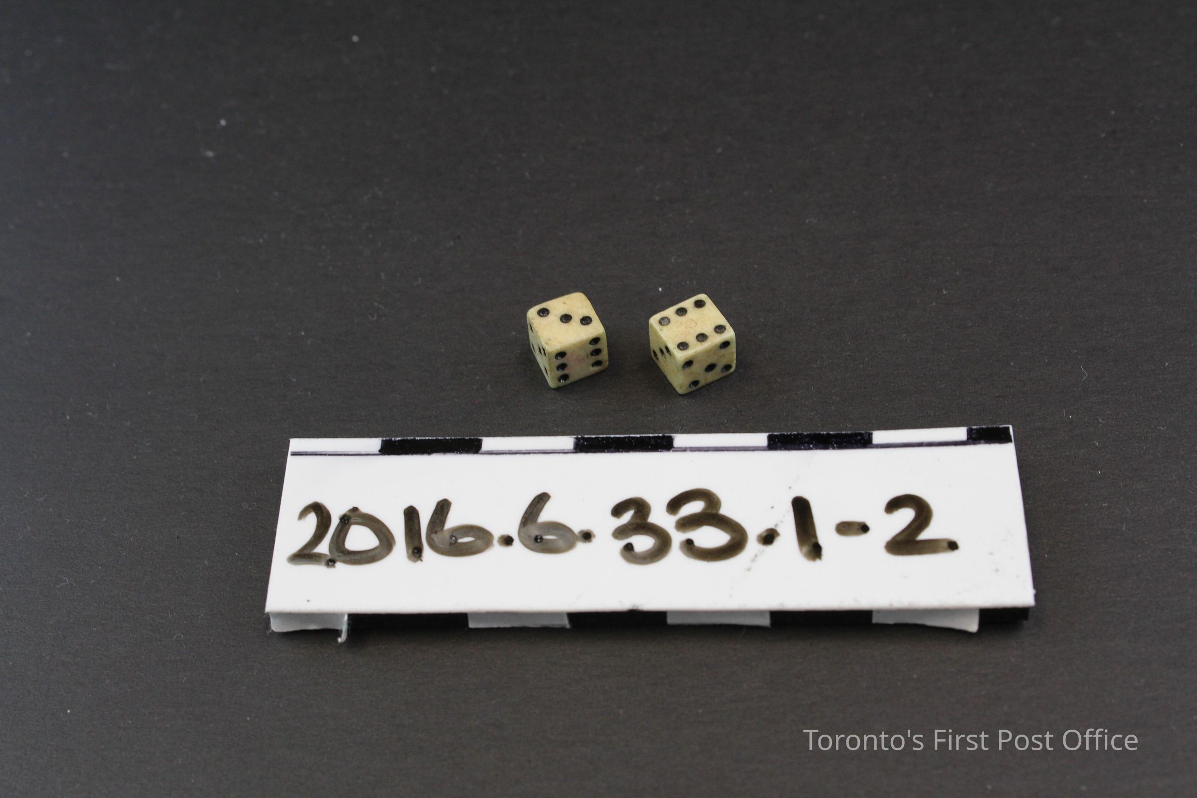 Pair of small white ivory dice with small drilled divets (pips), coloured black. Both die have a red marking, letters 'G' and 'R' and a crown symbol.Dimensions