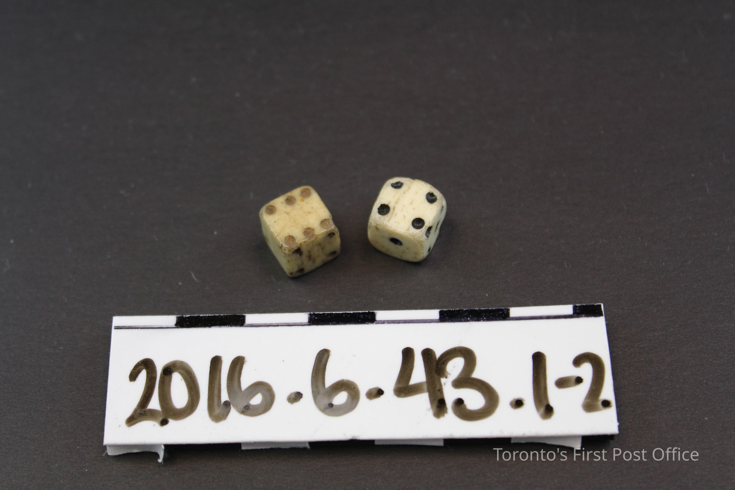 Two small white dice. One die, the larger of the two, (-.1) is made of ivory, with rounded corners and drilled divets (pips), coloured black. The other die (-.2) is made of bone with uniform drilled divets (pips), coloured brown/red.The six side has a flower symbol incised in between the pips.Dimensions
