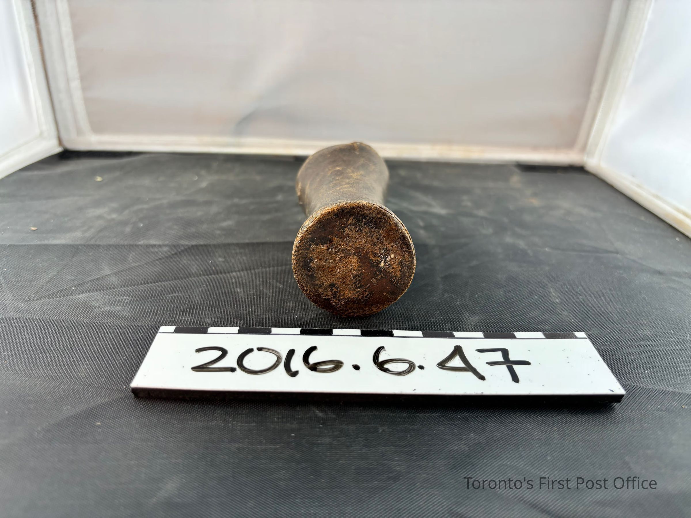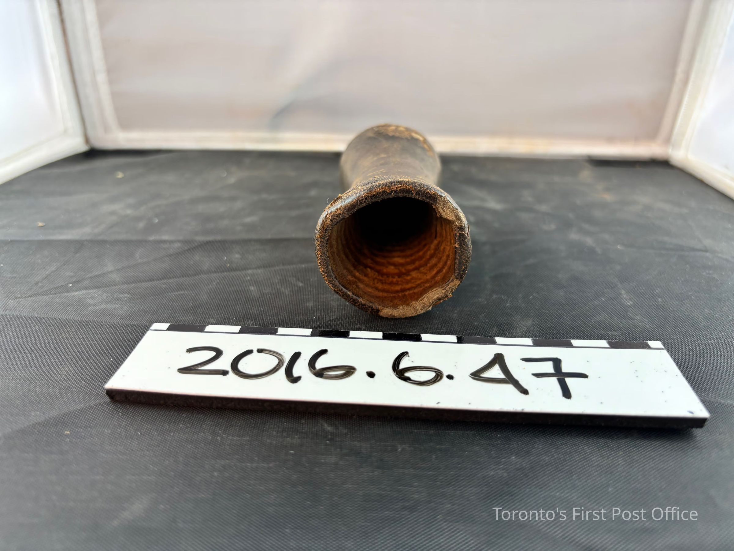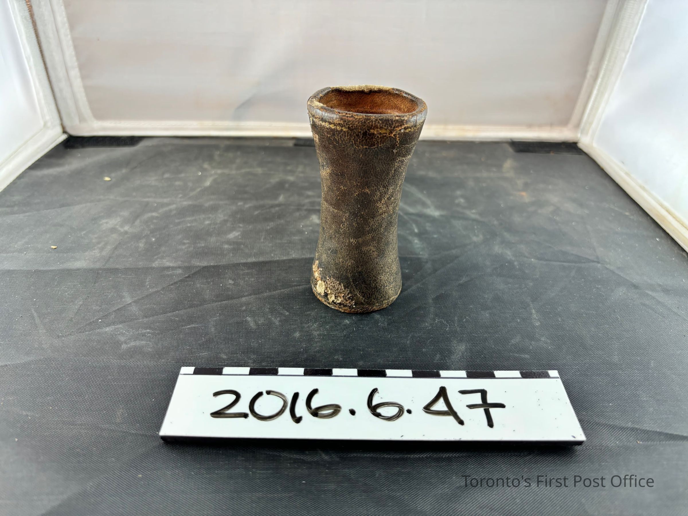 Leather container for casting dice. Hourglass shape with brown leather wrapped around the exterior and a ribbed interior. Small alternating diamonds and circles painted in gold form a ring around top, middle and bottom of container.Dimensions