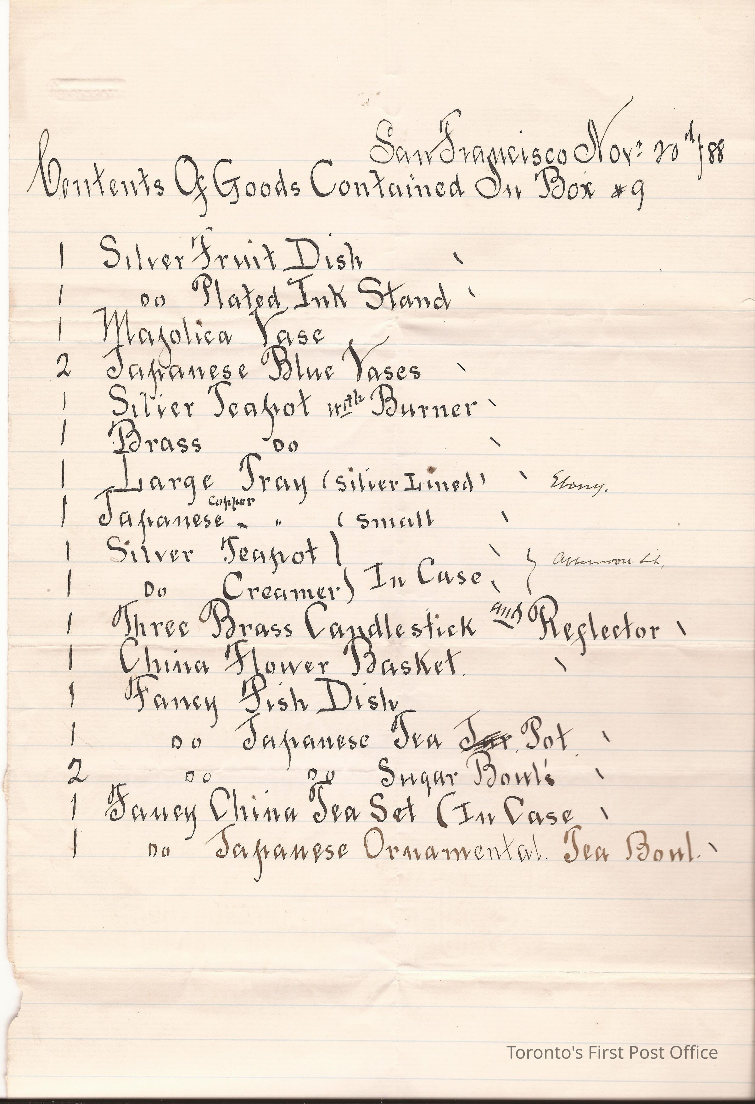 Document; re: "Contents of Goods in Box 9", including 16 items such as 1 silver fruit dish, 2 Japanese blue vases; written in black ink in calligraphic style with broad nib; dated San Francisco Nov 20th/88; blue guide lines; watermark: "QQ MILLS SUPERFINE"Dimensions