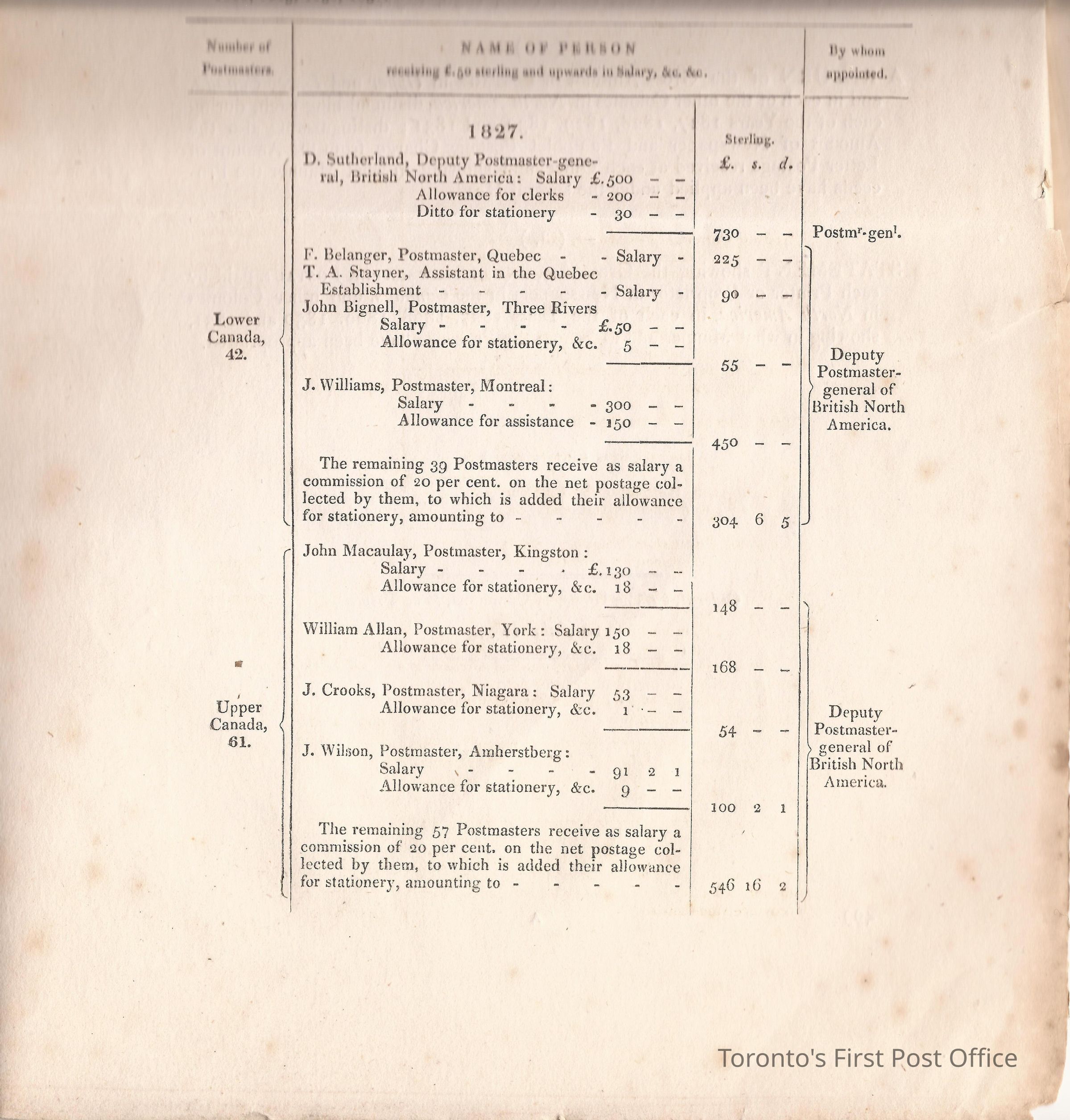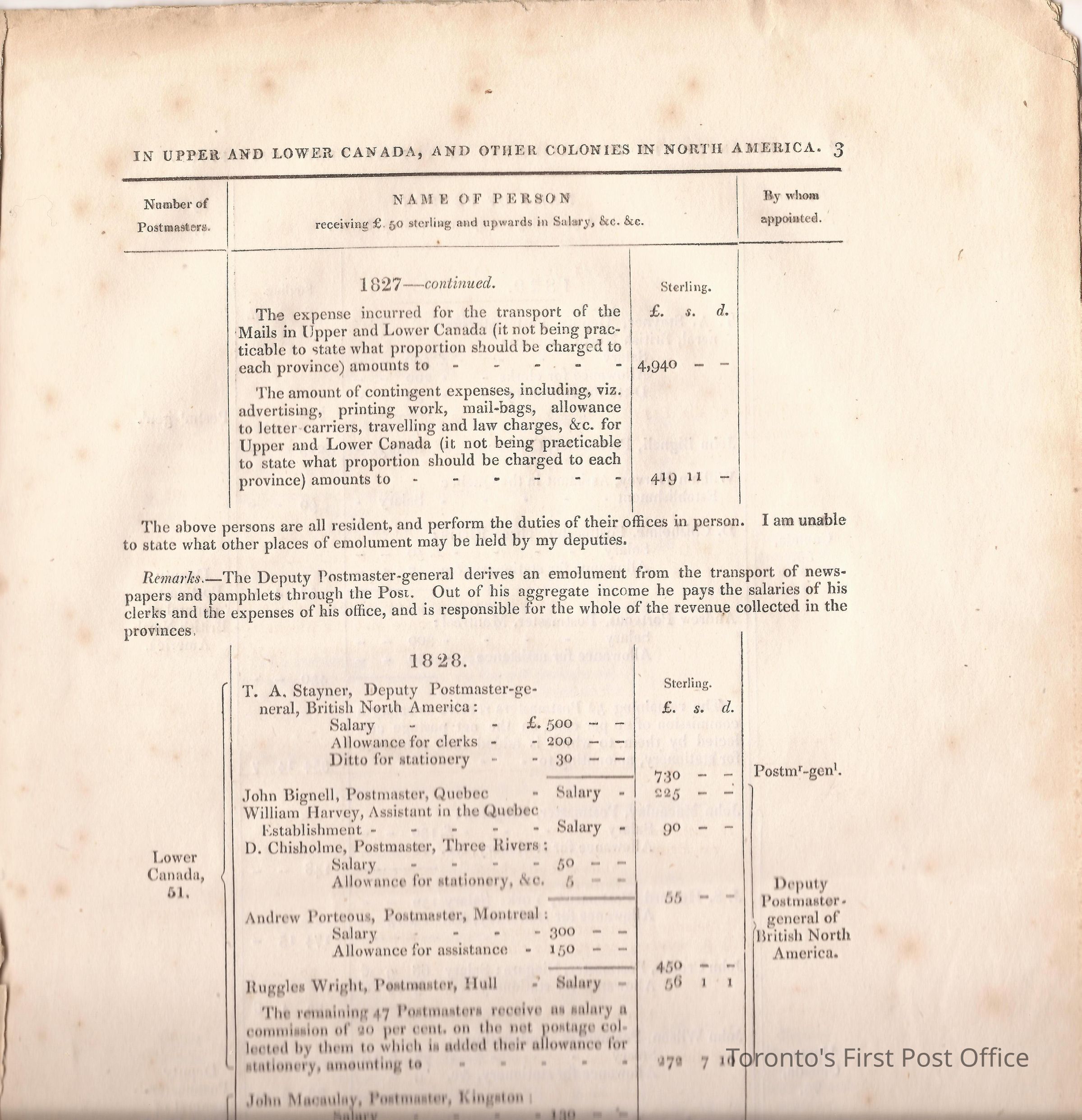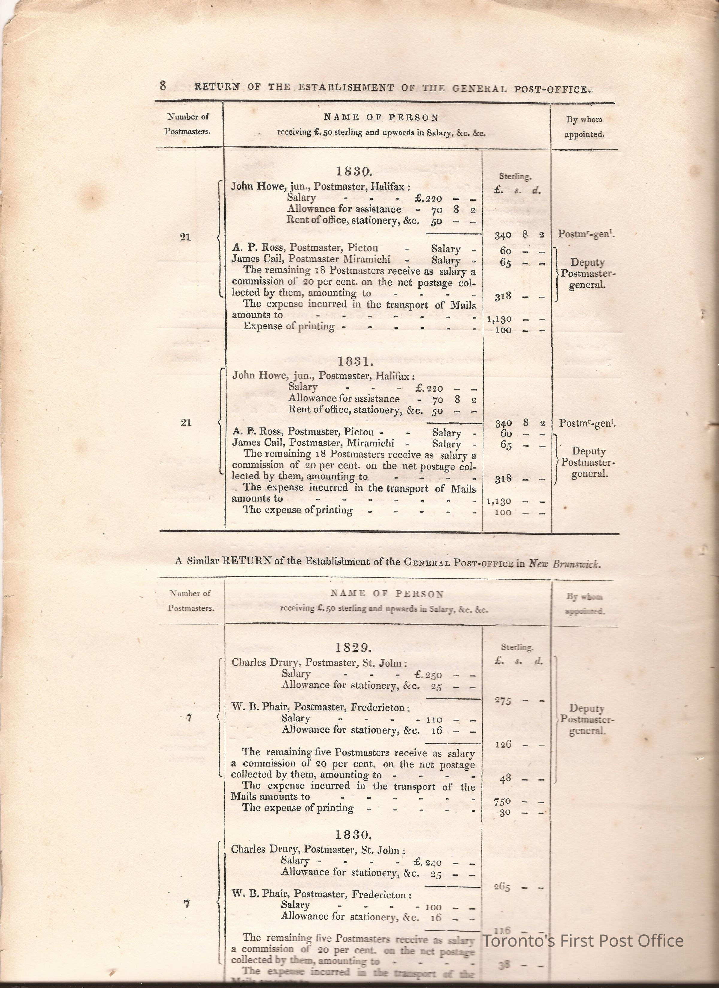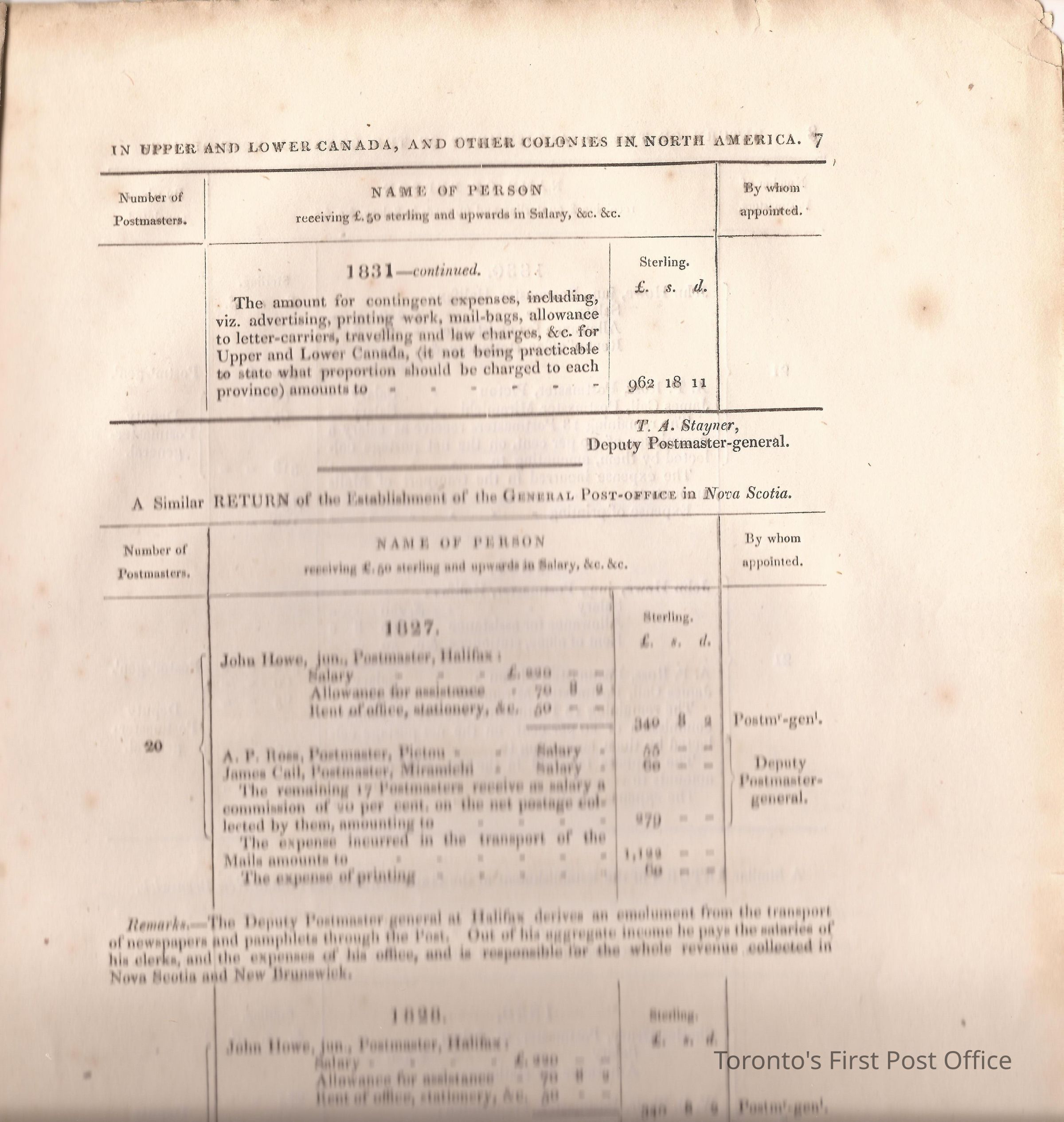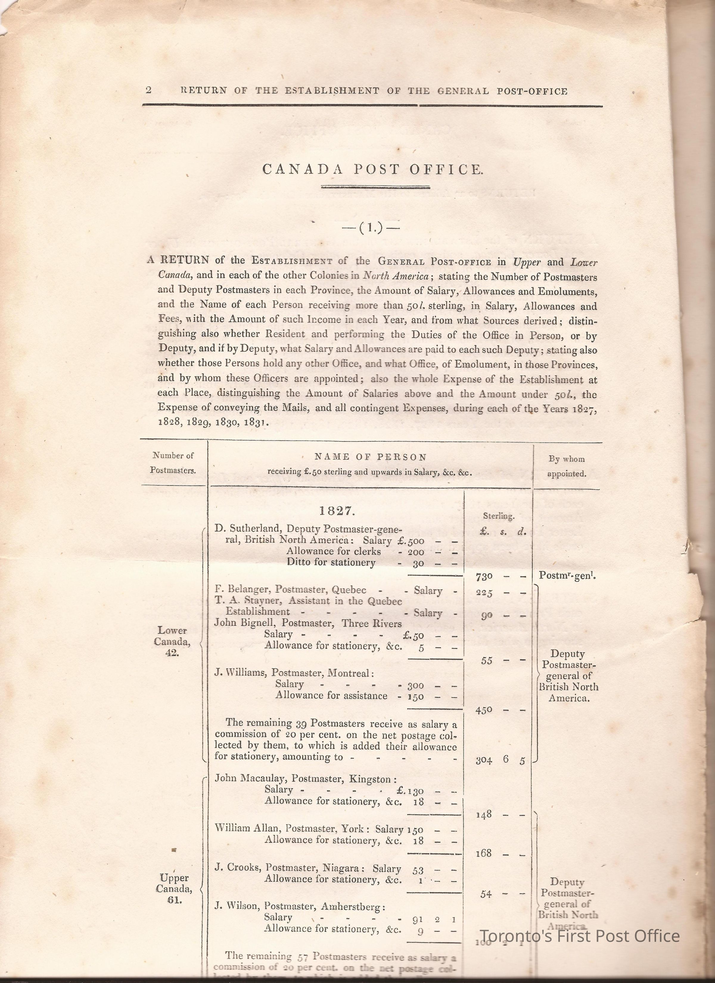 Document titled: "Canada Post Office"; re: number of postmasters and deputy postmasters in each province, their salary, allowance, what other offices these persons held and similar; pages divided into four columns: number of postmasters, name of person, monies received, by whom appointed; last two pages outline postage in U.C./L.C./N.S./N.B. in 1827, 1828, 1829, 1830, and 1831 for letter and newspaper rate; 7 pp, 14 sides of print; cotton thread bound; unbleached paper.Update Date